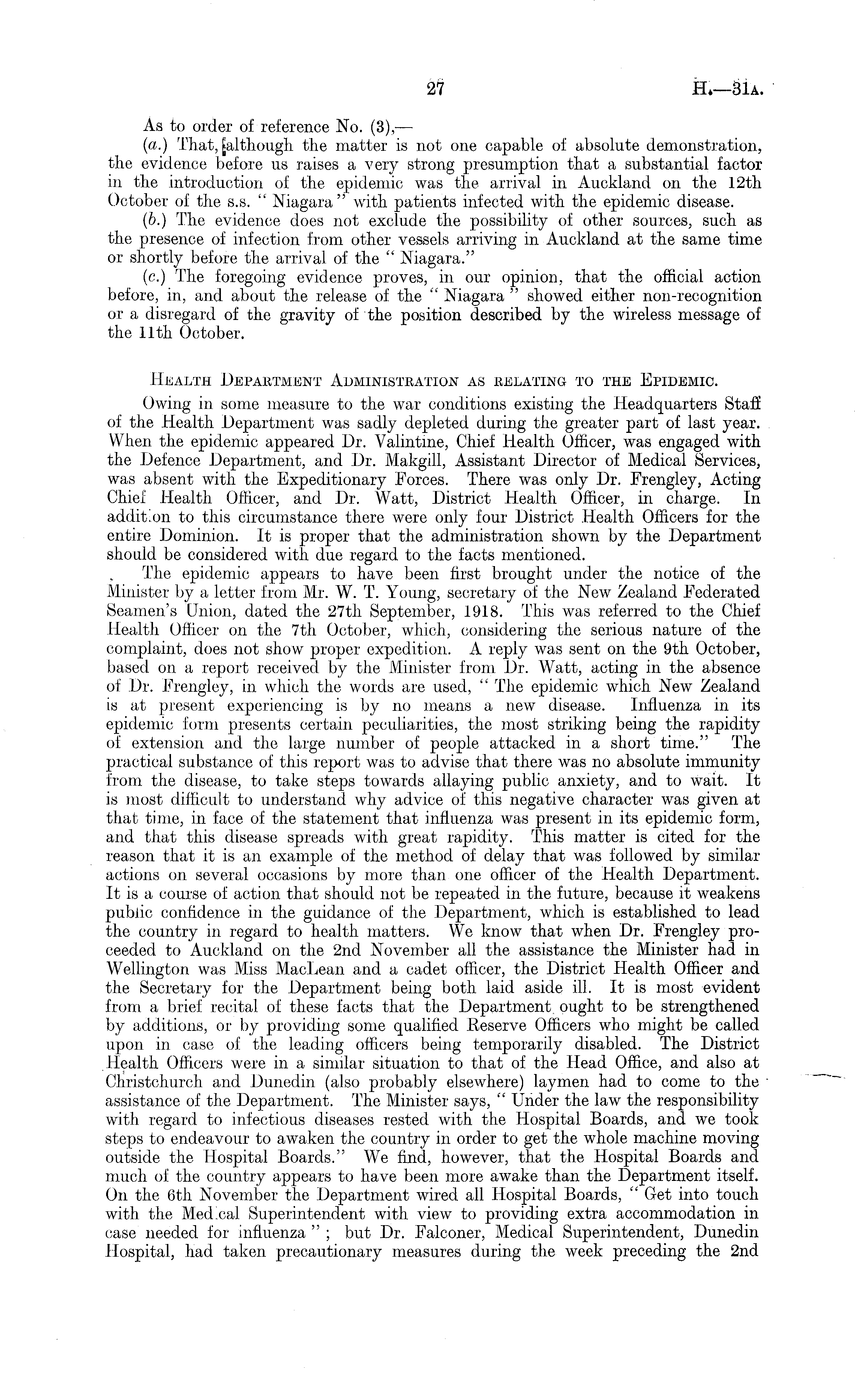 As to order of reference No. (3), — (a.) That, the matter is not one capable of absolute demonstration, the evidence before us raises a very strong presumption that a substantial factor in the introduction of the epidemic was the arrival in Auckland on the 12th October of the s.s. " Niagara" with patients infected with the epidemic disease. (6.) The evidence does not exclude the possibility of other sources, such as the presence of infection from other vessels arriving in Auckland at the same time or shortly before the arrival of the " Niagara." (c.) The foregoing evidence proves, in our opinion, that the official action before, in, and about the release of the " Niagara " showed either non-recognition or a disregard of the gravity of the position described by the wireless message of the 11th October. Health Department Administration as relating to the Epidemic. Owing in some measure to the war conditions existing the Headquarters Staff of the Health Department was sadly depleted during the greater part of last year. When the epidemic appeared Dr. Valintine, Chief Health Officer, was engaged with the Defence Department, and Dr. Makgill, Assistant Director of Medical Services, was absent with the Expeditionary Forces. There was only Dr. Frengley, Acting Chief Health Officer, and Dr. Watt, District Health Officer, in charge. In addition to this circumstance there were only four District Health Officers for the entire Dominion. It is proper that the administration shown by the Department should be considered with due regard to the facts mentioned. The epidemic appears to have been first brought under the notice of the Minister by a letter from Mr. W. T. Young, secretary of the New Zealand Federated Seamen's Union, dated the 27th September, 1918. This was referred to the Chief Health Officer on the 7th October, which, considering the serious nature of the complaint, does not show proper expedition. A reply was sent on the 9th October, based on a report received by the Minister from Dr. Watt, acting in the absence of Dr. Frengley, in which the words are used, " The epidemic which New Zealand is at present experiencing is by no means a new disease. Influenza in its epidemic form presents certain peculiarities, the most striking being the rapidity of extension and the large number of people attacked in a short time." The practical substance of this report was to advise that there was no absolute immunity from the disease, to take steps towards allaying public anxiety, and to wait. It is most difficult to understand why advice of this negative character was given at that time, in face of the statement that influenza was present in. its epidemic form, and that this disease spreads with great rapidity. This matter is cited for the reason that it is an example of the method of delay that was followed by similar actions on several occasions by more than one officer of the Health Department. It is a course of action that should not be repeated in the future, because it weakens public confidence in the guidance of the Department, which is established to lead the country in regard to health matters. We know that when Dr. Frengley proceeded to Auckland on the 2nd November all the assistance the Minister had in Wellington was Miss Mac Lean and a cadet officer, the District Health Officer and the Secretary for the Department being both laid aside ill. It is most evident from a brief recital of these facts that the Department ought to be strengthened by additions, or by providing some qualified Reserve Officers who might be called upon in case of the leading officers being temporarily disabled. The District Health Officers were in a similar situation to that of the Head Office, and also at Christchurch and Dunedin (also probably elsewhere) laymen had to come to the assistance of the Department. The Minister says, " Under the law the responsibility with regard to infectious diseases rested with the Hospital Boards, and we took steps to endeavour to awaken the country in order to get the whole machine moving outside the Hospital Boards." We find, however, that the Hospital Boards and much of the country appears to have been more awake than the Department itself. On the 6th November the Department wired all Hospital Boards, " Get into touch with the Medical Superintendent with view to providing extra accommodation in case needed for influenza " ; but Dr. Falconer, Medical Superintendent, Dunedin Hospital, had taken precautionary measures during the week preceding the 2nd