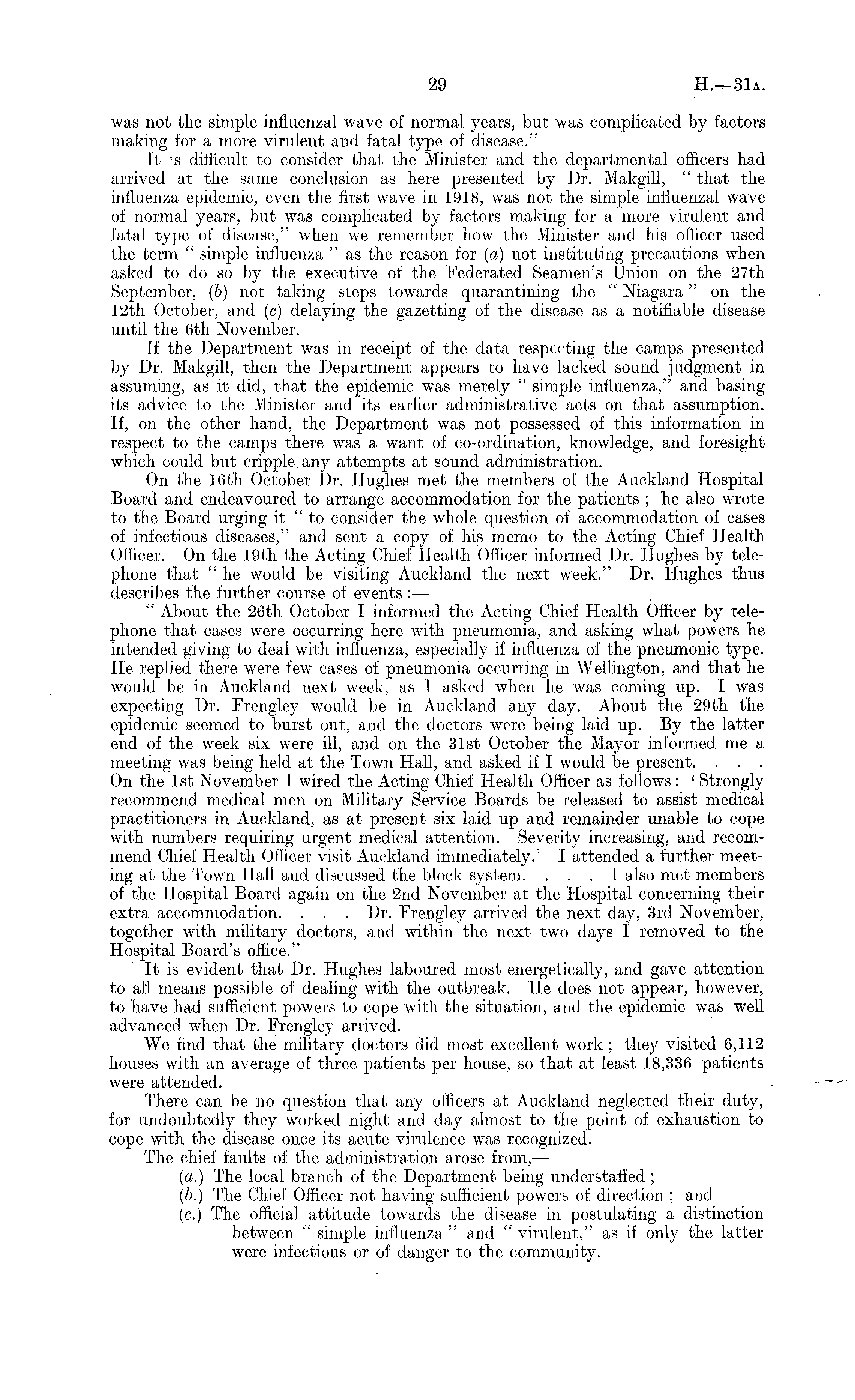 was not the simple influenzal wave of normal years, but was complicated by factors making for a more virulent and fatal type of disease." It 'S difficult to consider that the Minister and the departmental officers had arrived at the same conclusion as here presented by Dr. Makgill, " that the influenza epidemic, even the first wave in 1918, was not the simple influenzal wave of normal years, but was complicated by factors making for a more virulent and fatal type of disease," when we remember how the Minister and his officer used the term " simple influenza " as the reason for (a) not instituting precautions when asked to do so by the executive of the Federated Seamen's Union on the 27th September, (b) not taking steps towards quarantining the " Niagara " on the 12th October, and (c) delaying the gazetting of the disease as a notifiable disease until the 6th November. If the Department was in receipt of the data respecting the camps presented by Dr. Makgill, then the Department appears to have lacked sound judgment in assuming, as it did, that the epidemic was merely " simple influenza," and basing its advice to the Minister and its earlier administrative acts on that assumption. If, on the other hand, the Department was not possessed of this information in respect to the camps there was a want of co-ordination, knowledge, and foresight which could but cripple any attempts at sound administration. On the 16th October Dr. Hughes met the members of the Auckland Hospital Board and endeavoured to arrange accommodation for the patients ; he also wrote to the Board urging it " to consider the whole question of accommodation of cases of infectious diseases," and sent a copy of his memo to the Acting Chief Health Officer. On the 19th the Acting Chief Health Officer informed Dr. Hughes by telephone that "he would be visiting Auckland the next week." Dr. Hughes thus describes the further course of events : — " About the 26th October 1 informed the Acting Chief Health Officer by telephone that cases were occurring here with pneumonia, and asking what powers he intended giving to deal with influenza, especially if influenza of the pneumonic type. He replied there were few cases of pneumonia occurring in Wellington, and that he would be in Auckland next week, as I asked when he was coming up. I was expecting Dr. Frengley would be in Auckland any day. About the 29th the epidemic seemed to burst out, and the doctors were being laid up. By the latter end of the week six were ill, and on the 31st October the Mayor informed me a meeting was being held at the Town Hall, and asked if I would be present. . . . On the Ist November I wired the Acting Chief Health Officer as follows: ' Strongly recommend medical men on Military Service Boards be released to assist medical practitioners in Auckland, as at present six laid up and remainder unable to cope with numbers requiring urgent medical attention. Severity increasing, and recommend Chief Health Officer visit Auckland immediately.' I attended a further meeting at the Town Hall and discussed the block system. ... I also met members of the Hospital Board again on the 2nd November at the Hospital concerning their extra accommodation. . . . Dr. Frengley arrived the next day, 3rd November, together with military doctors, and within the next two days I removed to the Hospital Board's office." It is evident that Dr. Hughes laboured most energetically, and gave attention to all means possible of dealing with the outbreak. He does not appear, however, to have had sufficient powers to cope with the situation, and the epidemic was well advanced when Dr. Frengley arrived. We find that the military doctors did most excellent work ; they visited 6,112 houses with an average of three patients per house, so that at least 18,336 patients were attended. There can be no question that any officers at Auckland neglected their duty, for undoubtedly they worked night and day almost to the point of exhaustion to cope with the disease once its acute virulence was recognized. The chief faults of the administration arose from, — (a.) The local branch of the Department being understaffed ; (b.) The Chief Officer not having sufficient powers of direction ; and (c.) The official attitude towards the disease in postulating a distinction between " simple influenza " and " virulent," as if only the latter were infectious or of danger to the community.