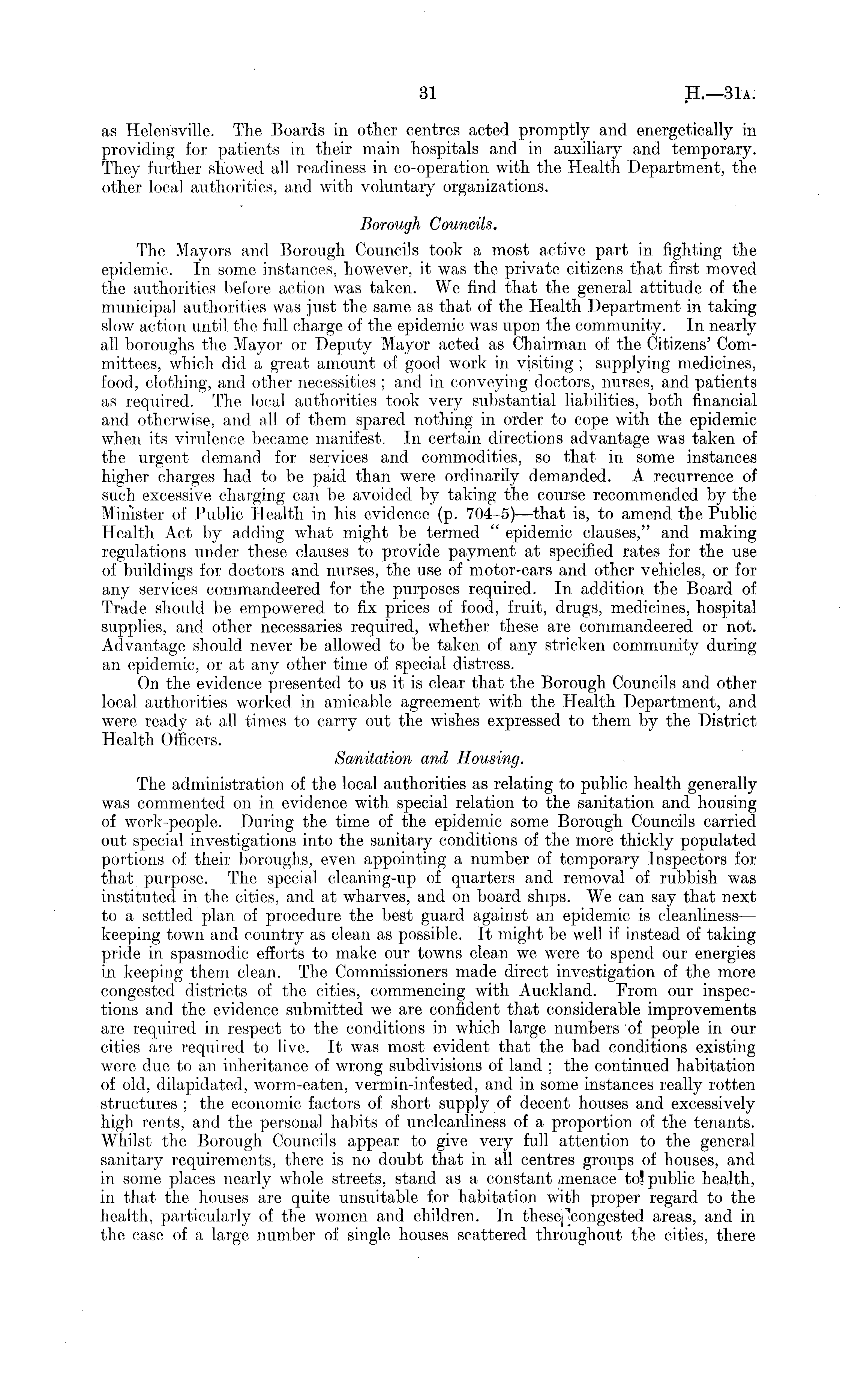as Helensville. The Boards in other centres acted promptly and energetically in providing for patients in their main hospitals and in auxiliary and temporary. They further showed all readiness in co-operation with the Health Department, the other local authorities, and with voluntary organizations. Borough Councils. The Mayors and Borough Councils took a most active part in fighting the epidemic. In some instances, however, it was the private citizens that first moved the authorities before action was taken. We find that the general attitude of the municipal authorities was just the same as that of the Health Department in taking slow action until the full charge of the epidemic was upon the community. In nearly all boroughs the Mayor or Deputy Mayor acted as Chairman of the Citizens' Committees, which did a great amount of good work in visiting ; supplying medicines, food, clothing, and other necessities ; and in conveying doctors, nurses, and patients as required. The local authorities took very substantial liabilities, both financial and otherwise, and all of them spared nothing in order to cope with the epidemic when, its virulence became manifest. In certain directions advantage was taken of the urgent demand for services and commodities, so that in some instances higher charges had to be paid than were ordinarily demanded. A recurrence of such excessive charging can be avoided by taking the course recommended by the Minister of Public Health in his evidence (p. 704-5)- —that is, to amend the Public Health Act by adding what might be termed " epidemic clauses," and making regulations under these clauses to provide payment at specified rates for the use of buildings for doctors and nurses, the use of motor-cars and other vehicles, or for any services commandeered for the purposes required. In addition the Board of Trade should be empowered to fix prices of food, fruit, drugs, medicines, hospital supplies, and other necessaries required, whether these are commandeered or not. Advantage should never be allowed to be taken of any stricken community during an epidemic, or at any other time of special distress. On the evidence presented to us it is clear that the Borough Councils and other local authorities worked in amicable agreement with the Health Department, and were ready at all times to carry out the wishes expressed to them by the District Health Officers. Sanitation and Housing. The administration of the local authorities as relating to public health generally was commented on in evidence with special relation to the sanitation and housing of work-people. During the time of the epidemic some Borough Councils carried out special investigations into the sanitary conditions of the more thickly populated portions of their boroughs, even appointing a number of temporary Inspectors for that purpose. The special cleaning-up of quarters and removal of rubbish was instituted in the cities, and at wharves, and on board ships. We can say that next to a settled plan of procedure the best guard against an epidemic is cleanliness— keeping town and country as clean as possible. It might be well if instead of taking pride in spasmodic efforts to make our towns clean we were to spend our energies in keeping them clean. The Commissioners made direct investigation of the more congested districts of the cities, commencing with Auckland. From our inspections and the evidence submitted we are confident that considerable improvements are required in respect to the conditions in which large numbers of people in our cities are required to live. It was most evident that the bad conditions existing were due to an inheritance of wrong subdivisions of land ; the continued habitation of old, dilapidated, worm-eaten, vermin-infested, and in some instances really rotten structures ; the economic factors of short supply of decent houses and excessively high rents, and the personal habits of uncleanliness of a proportion of the tenants. Whilst the Borough Councils appear to give very full attention to the general sanitary requirements, there is no doubt that in all centres groups of houses, and in some places nearly whole streets, stand as a constant (menace to! public health, in that the houses are quite unsuitable for habitation with proper regard to the health, particularly of the women and children. In areas, and in the case of a large number of single houses scattered throughout the cities, there