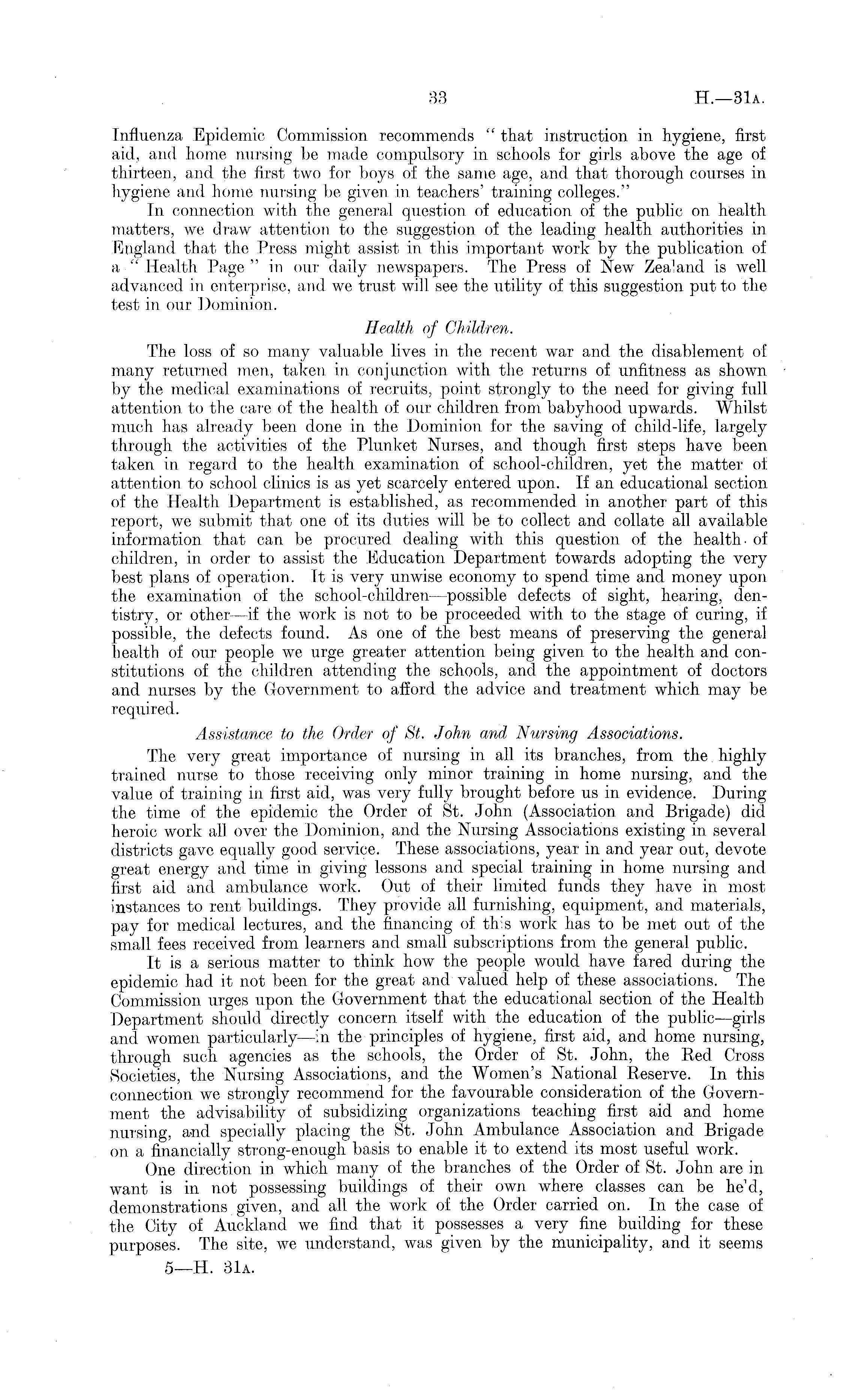 Influenza Epidemic Commission recommends " that instruction in hygiene, first aid, and home nursing be made compulsory in. schools for girls above the age of thirteen, and the first two for boys of the same age, and that thorough courses in hygiene and home nursing be given, in teachers' training colleges." In connection with the general question of education of the public on health matters, we draw attention to the suggestion of the leading health authorities in England that the Press might assist in this important work by the publication of a " Health Page " in our daily newspapers. The Press of New Zealand is well advanced in enterprise, and we trust will see the utility of this suggestion put to the test in our Dominion. Health of Children. The loss of so many valuable lives in the recent war and the disablement of many returned men, taken in conjunction with the returns of unfitness as shown by the medical examinations of recruits, point strongly to the need for giving full attention to the care of the health, of our children from babyhood upwards. Whilst much has already been done in the Dominion for the saving of child-life, largely through the activities of the Plunket Nurses, and though first steps have been taken in regard to the health examination of school-children, yet the matter of attention to school clinics is as yet scarcely entered upon. If an educational section. of the Health Department is established, as recommended in another part of this report, we submit that one of its duties will be to collect and collate all available information that can. be procured dealing with this question of the health. of children, in order to assist the Education Department towards adopting the very best plans of operation. Tt is very unwise economy to spend time and money upon the examination of the school-children —possible defects of sight, hearing, dentistry, or other —if the work is not to be proceeded with to the stage of curing, if possible, the defects found. As one of the best means of preserving the general health of our people we urge greater attention being given, to the health and constitutions of the children attending the schools, and the appointment of doctors and nurses by the Government to afford the advice and treatment which may be required. Assistance to the Order of St. John and Nursing Associations. The very great importance of nursing in all its branches, from the highly trained nurse to those receiving only minor training in home nursing, and the value of training in first aid, was very fully brought before us in evidence. During the time of the epidemic the Order of St. John (Association, and Brigade) did heroic work all over the Dominion, and the Nursing Associations existing in several districts gave equally good service. These associations, year in and year out, devote great energy and time in. giving lessons and special training in home nursing and. first aid and ambulance work. Out of their limited funds they have in most instances to rent buildings. They provide all furnishing, equipment, and materials, pay for medical lectures, and the financing of this work has to be met out of the small fees received from learners and small subscriptions from the general public. It is a serious matter to think how the people would have fared during the epidemic had it not been for the great and valued help of these associations. The Commission urges upon the Government that the educational section of the Health Department should directly concern itself with the education of the public—girls and women particularly —in the principles of hygiene, first aid, and home nursing, through such, agencies as the schools, the Order of St. John, the lied Cross Societies, the Nursing Associations, and the Women's National Reserve. In. this connection we strongly recommend for the favourable consideration of the Government the advisability of subsidizing organizations teaching first aid and home nursing, and specially placing the St. John Ambulance Association and Brigade on a financially strong-enough basis to enable it to extend its most useful work. One direction in which many of the branches of the Order of St. John arc in want is in not possessing buildings of their own where classes can be he'd, demonstrations given, and all the work- of the Order carried on. In the case of the City of Auckland we find that it possesses a very fine building for these purposes. The site, we understand, was given by the municipality, and it seems
