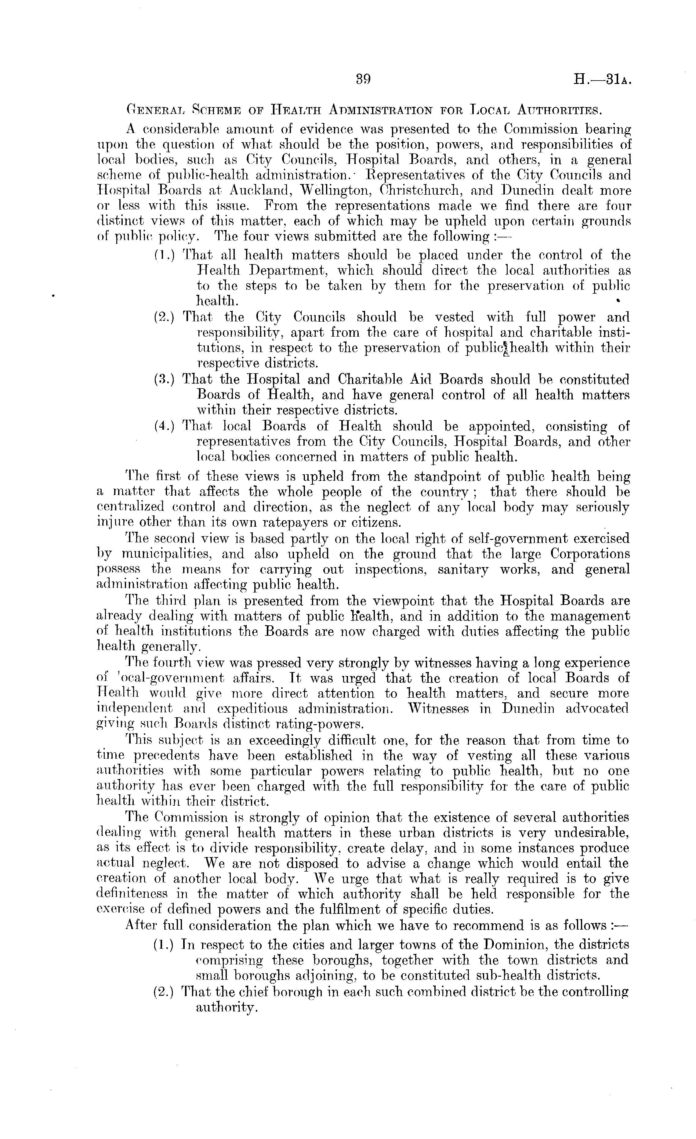 General Scheme of Health Administration for Local Authorities. A considerable amount of evidence was presented to the Commission bearing upon the question of what should be the position, powers, and responsibilities of local bodies, such as City Councils, Hospital Boards, and others, in a general scheme of public-health administration.' .Representatives of the City Councils and Hospital Boards at Auckland, Wellington, Christchurch, and Dunedin dealt more or less with this issue. From the representations made we. find there are four distinct views of this matter, each of which may be upheld upon certain grounds of public policy. The four views submitted are the following : — (1.) That all health matters should be placed under the control of the Health Department, which should direct the local authorities as to the steps to be taken by them for the preservation of public health. * (2.) That the City Councils should be vested with full power and responsibility, apart from the care of hospital and charitable institutions, in respect to the preservation of public|health within their' respective districts. (3.) That the Hospital and Charitable Aid Boards should be, constituted Boards of Health, and have general control of all health matters within their respective districts. (4.) That local Boards of Health should be appointed, consisting of representatives from the City Councils, Hospital Boards, and other local bodies concerned in matters of public health. The first of these views is upheld from the standpoint of public health being a matter that affects the, whole people of the country ; that there should be centralized control and direction, as the neglect of any local body may seriously injure other than its own ratepayers or citizens. The second view is based partly on the local right of self-government exercised by municipalities, and also upheld on the ground that the large Corporations possess the means for carrying out inspections, sanitary works, and general administration affecting public health. The third plan is presented from the viewpoint that the Hospital Boards are already dealing with matters of public health, and in. addition to the management of health institutions the Boards are now charged with duties affecting the public health generally. The fourth view was pressed very strongly by witnesses having a long experience of 'ocal-government affairs. It was urged that the creation of local Boards of Health would give more direct attention to health matters, and secure more independent and expeditious administration. Witnesses in Dunedin. advocated giving such Boards distinct rating-powers. This subject is an exceedingly difficult one, for the reason that from time to time precedents have been established in the way of vesting all these various authorities with some particular powers relating to public health, but no one authority has ever been charged with the full responsibility for the care of public health within their district. The Commission is strongly of opinion that the existence of several authorities dealing with general health matters in these urban districts is very undesirable, as its effect is to divide responsibility, create delay, and in some instances produce actual neglect. We are not disposed to advise a change which would entail the creation, of another local body. We urge that what is really required is to give defmiteness in the matter of which authority shall be, held responsible for the exercise of defined powers and the fulfilment of specific duties. After full consideration the plan which we have to recommend is as follows : — (1.) In respect to the cities and larger towns of the Dominion, the districts comprising these boroughs, together with the town districts and small boroughs adjoining, to be constituted sub-health districts. (2.) That the chief borough in each such combined district be the controlling authority.