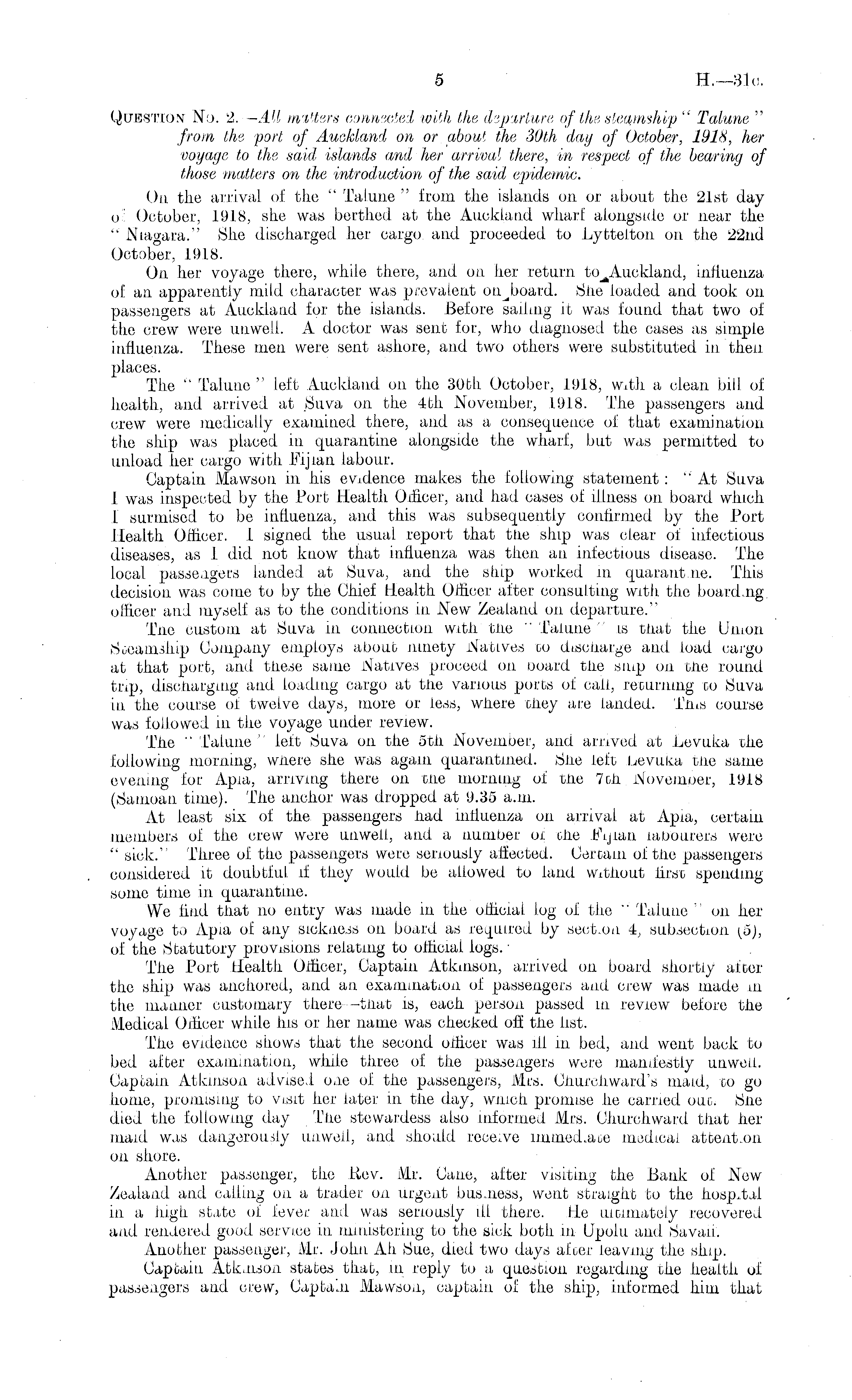 Question No. 2. —All milters connected with the departure of the steamship " Talune " from the port of Auckland on or about the 30th day of October, 1918, her voyage to the said islands and her arrival there, in respect of the bearing of those matters on the introduction of the said epidemic. On the arrival of the " Talune " from the islands on or about the 21st day oi: October, 191.8, she was berthed at the Auckland wharf alongside or near the " Niagara." She discharged her cargo and proceeded to Lytteiton on the 22nd October, 1918. On her voyage there, while there, and on. her return influenza of an apparently mild character was prevalent outboard. She loaded and took on passengers at Auckland for the islands. Before sailing it was found that two of the crew were unwell. A doctor was sent for, who diagnosed the cases as simple influenza. These men were sent ashore, and two others were substituted in then places. The " Talune " left Auckland on the 30th October, 1918, w.th a clean bill of health, and arrived at Suva on the 4th November, 1918. The passengers and crew were medically examined there, and as a consequence of that examination the ship was placed in quarantine alongside the wharf, but was permitted to unload her cargo with Fijian labour. Captain Mawson in his evidence makes the following statement : "At Suva 1 was inspected by the Port Health odicer, and had cases of illness on board which I surmised to be influenza, and this was subsequently confirmed by the Port Health Officer. I signed the usual report that ttie ship was clear oi infectious diseases, as I did not know that influenza was then an infectious disease. The local passengers landed at Suva, and the ship worked in quarant.ne. This decision was come to by the Chief Health Officer after consulting with, the board.ng. officer and myself as to the conditions in New Zealand on departure." Tne custom at Suva in connection with the " Talune " is that the Union Steamship Company employs about ninety Natives oo discharge and load cargo at that port, and these same Natives proceed on board the snip on the round trip, discharging and loading cargo at the various ports of call, returning do Suva in the course of twelve days, more or less, where they are landed. Tins course was followed in the voyage under review. The " Talune " left Suva on the oth November, and arrived at Levuka the following morning, where she was again quarantined. 6iie left Levuka the same evening for Apia, arriving there on one morning of ttie 7tn Novemoer, 1918 (Samoan time). The anchor was dropped at 9.35 a.m. At least six of the passengers had influenza on arrival at Apia, certain members of the crew were unwell., and a number oi the Fijian labourers were " sick." Three of the passengers were seriously affected. Certain of the passengers considered it doubtful, if they would be allowed to land Without first spending some time in quarantine. We find that no entry was made in the official log of the " Talune " on her voyage to Apia ot any sickness on board as required by section 4, subsection (ijj, of the Statutory provisions relating to official logs. ■ The Port Health Officer, Captain Atkinson, arrived on board shortly after the ship was anchored, and an examination of passengers and crew was made in the manner customary there -that is, each person passed in review before the Medical Officer while his or her name was checked off the list. The evidence shows that the second officer was ill in bed, and went back to bed after examination, while three of the passengers were manifestly unwell. Captain Atkinson advised one of the passengers, Mrs. Chur-ch ward's maid, co go home, promising to visit her later in the day, winch promise lie carried ono. Sue died the following day The stewardess also informed Mrs. Churchward that her maid was dangerously unwell, and should receive iiunied.aoe medical attcnt.on on shore. Another passenger, the Rev. Mr. Cane, after visiting the Bank of New Zealand and calling on a trader on urgent bus.ness, went straight to the hospital in a high state oi fever and was seriously ill there. He ultimately recovered and rendered good service in ministering to the sick both in Upolu and Savaii. Another passenger, Mr. John Ah Sue, died two days aloer leaving the ship. Captain Atknison states that, in reply to a question regarding the health of passengers and crew, Captain Mawson, captain of the ship, informed him that