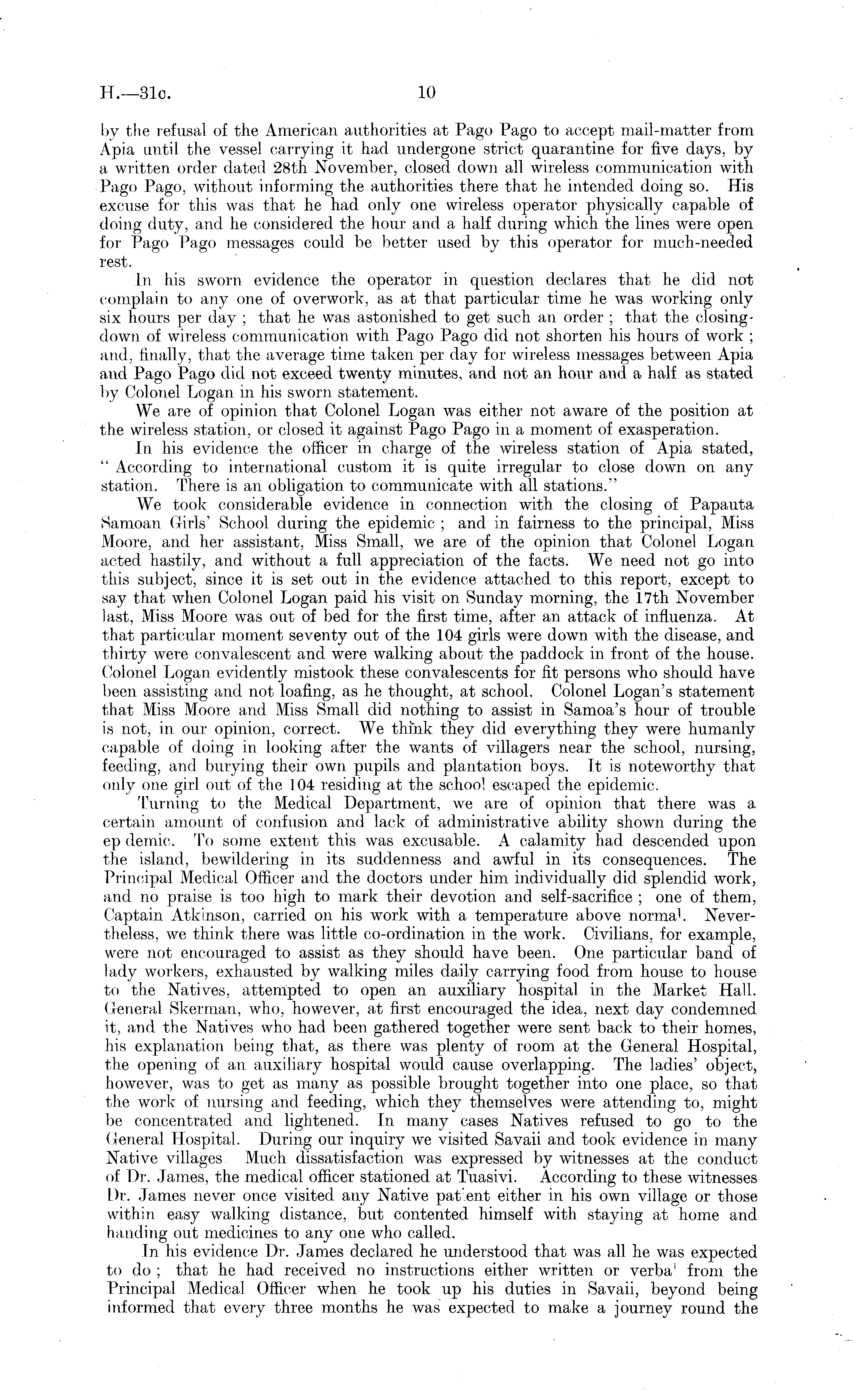 by the refusal of the American authorities at Pago Pago to accept mail-matter from Apia until the vessel carrying it had undergone strict quarantine for five days, by a written order dated 28th November, closed down all wireless communication with Pago Pago, without informing the authorities there that he intended doing so. His excuse for this was that he had only one wireless operator physically capable of doing duty, and he considered the hour and a half during which the lines were open for Pago Pago messages could be better used by this operator for much-needed rest. In his sworn evidence the operator in question declares that he did not complain to any one of overwork, as at that particular time he was working only six hours per day ; that he was astonished to get such an order ; that the closingdown of wireless communication with Pago Pago did not shorten his hours of work ; and, finally, that the average time taken per day for wireless messages between Apia and Pago Pago did not exceed twenty minutes, and not an hour and a half as stated by Colonel Logan in his sworn statement. We are of opinion that Colonel Logan was either not aware of the position at the wireless station, or closed it against Pago Pago in a moment of exasperation. In his evidence the officer in charge of the wireless station of Apia stated, " According to international custom it is quite irregular to close down on any station. There is an obligation to communicate with all stations." We took considerable evidence in connection with the closing of Papauta Samoan Girls' School during the epidemic ; and in fairness to the principal, Miss Moore, and her assistant, Miss Small, we are of the opinion that Colonel Logan acted hastily, and without a full appreciation of the facts. We need not go into this subject, since it is set out in the evidence attached to this report, except to say that when Colonel Logan paid his visit on Sunday morning, the 17th November last, Miss Moore was out of bed for the first time, after an attack of influenza. At that particular moment seventy out of the 104 girls were down with the disease, and thirty were convalescent and were walking about the paddock in front of the house. Colonel Logan evidently mistook these convalescents for fit persons who should have been assisting and not loafing, as he thought, at school. Colonel Logan's statement that Miss Moore and Miss Small did nothing to assist in Samoa's hour of trouble is not, in our opinion, correct. We think they did everything they were humanly capable of doing in looking after the wants of villagers near the school, nursing, feeding, and burying their own pupils and plantation boys. It is noteworthy that only one girl out of the 104 residing at the school escaped the epidemic. Turning to the Medical Department, we are of opinion that there was a certain amount of confusion and lack of administrative ability shown during the ep demic. To some extent this was excusable. A calamity had descended upon the island, bewildering in its suddenness and awful in its consequences. The Principal Medical Officer and the doctors under him individually did splendid work, and no praise is too high to mark their devotion and self-sacrifice ; one of them, Captain Atkinson, carried on his work with a temperature above normah Nevertheless, we think there was little co-ordination in the work. Civilians, for example, were not encouraged to assist as they should have been. One particular band of lady workers, exhausted by walking miles daily carrying food from house to house to the Natives, attempted to open an auxiliary hospital in the Market Hall. General Skerman, who, however, at first encouraged the idea, next day condemned it, and the Natives who had been gathered together were sent back to their homes, his explanation being that, as there was plenty of room at the General Hospital, the opening of an auxiliary hospital would cause overlapping. The ladies' object, however, was to get as many as possible brought together into one place, so that the work of nursing and feeding, which they themselves were attending to, might be concentrated and lightened. In many cases Natives refused to go to the General Hospital. During our inquiry we visited Savaii and took evidence in many Native villages Much dissatisfaction was expressed by witnesses at the conduct of Dr. James, the medical officer stationed at Tuasivi. According to these witnesses Dr. James never once visited any Native patent either in his own village or those within easy walking distance, but contented himself with staying at home and handing out medicines to any one who called. In his evidence Dr. James declared he understood that was all he was expected to do ; that he had received no instructions either written or verba 1 from the Principal Medical Officer when he took up his duties in Savaii, beyond being informed that every three months he was expected to make a journey round the