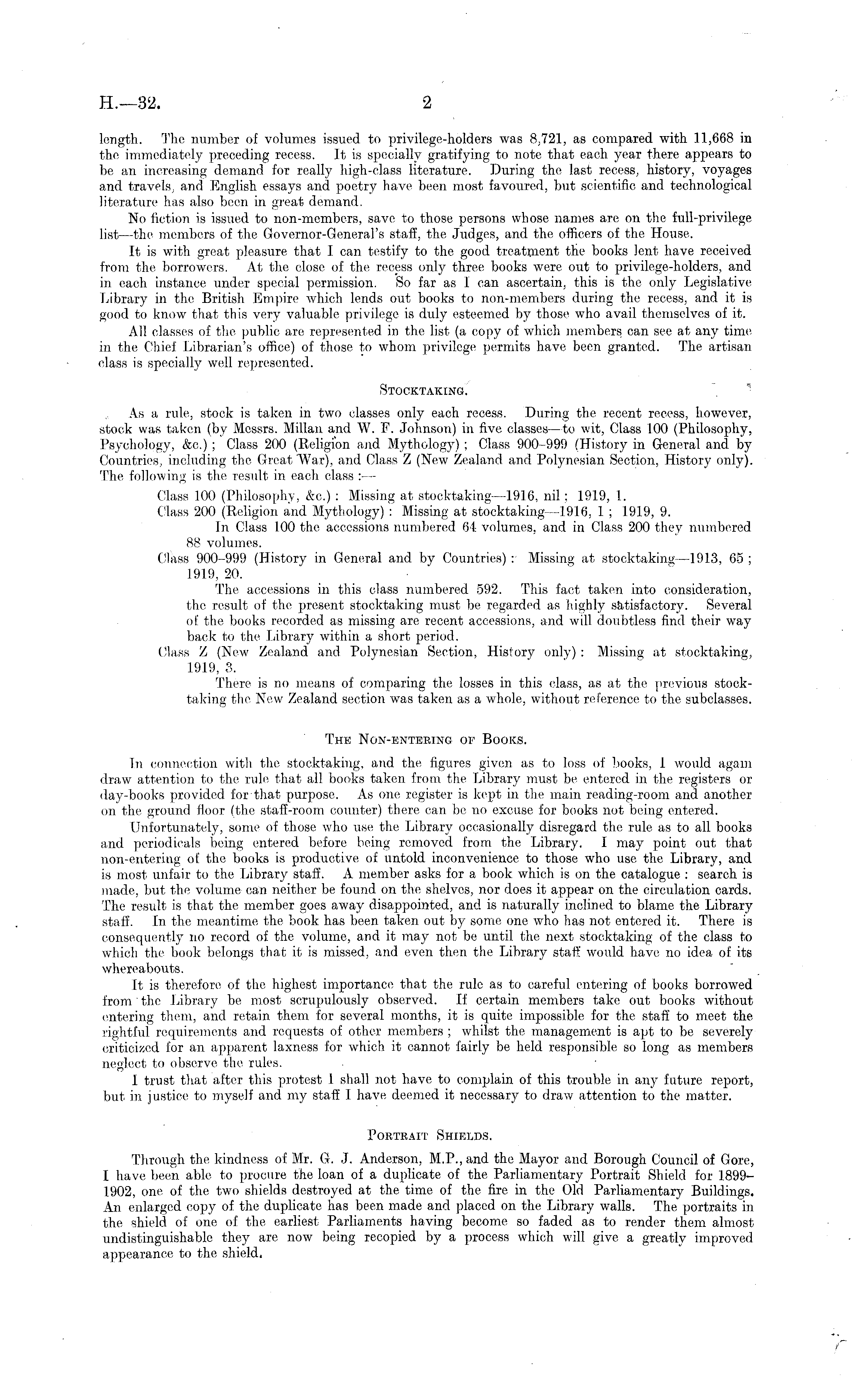 length. The number of volumes issued to privilege-holders was 8,721, as compared with 11,668 in the immediately preceding recess. It is specially gratifying to note that each year there appears to be an increasing demand, for really high-class literature. During the last recess, history, voyages and travels, and English essays and poetry have been most favoured, but scientific and technological literature has also been in great demand. No fiction is issued to non-members, save to those persons whose names are on the full-privilege list —the members of the Governor-General's staff, the Judges, and the officers of the House. It is with great pleasure that I can testify to the good treatment tlie books lent have received from the borrowers. At the close of the recess only three books were out to privilege-holders, and in each instance under special permission. So far as I can ascertain, this is the only Legislative Library in the British Empire which lends out books to non-members during the recess, and it is good to know that this very valuable privilege is duly esteemed by those who avail themselves of it. All classes of the public are represented in the list (a copy of which members can see at any timein the Chief Librarian's office) of those to whom privilege permits have been granted. The artisan class is specially well represented. Stocktaking. As a rule, stock is taken in two classes only each recess. During the recent recess, however, stock was taken (by Messrs. Millan and W. F. Johnson) in five classes —to wit, Class 100 (Philosophy, Psychology, &c.) ; Class 200 (Religion and Mythology) ; Class 900-999 (History in General and by Countries, including the. Great "War), and Class Z (New Zealand and Polynesian Section, History only). The following is the result in each class : — Class 100 (Philosophy, &c.) : Missing at stocktaking—l9l6, nil: 1919, 1. Class 200 (Religion and Mythology) : Missing at stocktaking- 1916, 1 ; 1919, 9. In Class 100 the accessions numbered 64 volumes, and in Class 200 they numbered 88 volumes. Class 900-999 (History in General and by Countries) : Missing at stocktaking—l9l3, 65 ; 1919, 20. The accessions in this class numbered 592. This fact taken into consideration, the result of the present stocktaking must be regarded as highly satisfactory. Several of the books recorded as missing are recent accessions, and will doubtless find their way back to the Library within a short period. Class Z (New Zealand and Polynesian Section, History only) : Missing at stocktaking, 1919, 3. There is no means of comparing the losses in this class, as at the previous stocktaking the New Zealand section was taken as a whole, without reference to the subclasses. The Non-entering of Books. In connection with the stocktaking, and the figures given as to loss of books, I would again draw attention to the rule that all books taken from the Library must be entered in the registers or day-books provided for that purpose. As one register is kept in the main reading-room and another on the ground floor (the staff-room counter) there can be no excuse for books not being entered. Unfortunately, some of those who use the Library occasionally disregard the rule as to all books and periodicals being entered before being removed from the Library. I may point out that non-entering of the books is productive of untold inconvenience to those who use the Library, and is most unfair to the Library staff. A member asks for a book which is on the catalogue : search is made, but the volume can neither be found on the shelves, nor does it appear on the circulation cards. The result is that the member goes away disappointed, and is naturally inclined to blame the Library staff. In the meantime the book has been taken out by some one who has not entered it. There is consequently no record of the volume, and it may not be until the next stocktaking of the class to which the book belongs that it is missed, and even then the Library staff would have no idea of its whereabouts. It is therefore of the highest importance that the rule as to careful entering of books borrowed from the Library be most scrupulously observed. If certain members take out books without entering them, and retain them for several months, it is quite impossible for the staff to meet the rightful requirements and requests of other members ; whilst the management is apt to be severely criticized for an apparent laxness for which it cannot fairly be held responsible so long as members neglect to observe the rules. I trust that after this protest I shall not have to complain of this trouble in any future report, but in justice to myself and my staff I have deemed it necessary to draw attention to the matter. Portrait' Shields. Through the kindness of Mr. G. J. Anderson, M.P.,and the Mayor and Borough Council of Gore, I have been able to procure the loan of a duplicate of the Parliamentary Portrait Shield for 1899--1902, one of the two shields destroyed at the time of the fire in the Old Parliamentary Buildings. An enlarged copy of the duplicate has been made and placed on the Library walls. The portraits in the shield of one of the earliest Parliaments having become so faded as to render them almost undistinguishable they are now being recopied by a process which will give a greatly improved appearance to the shield.