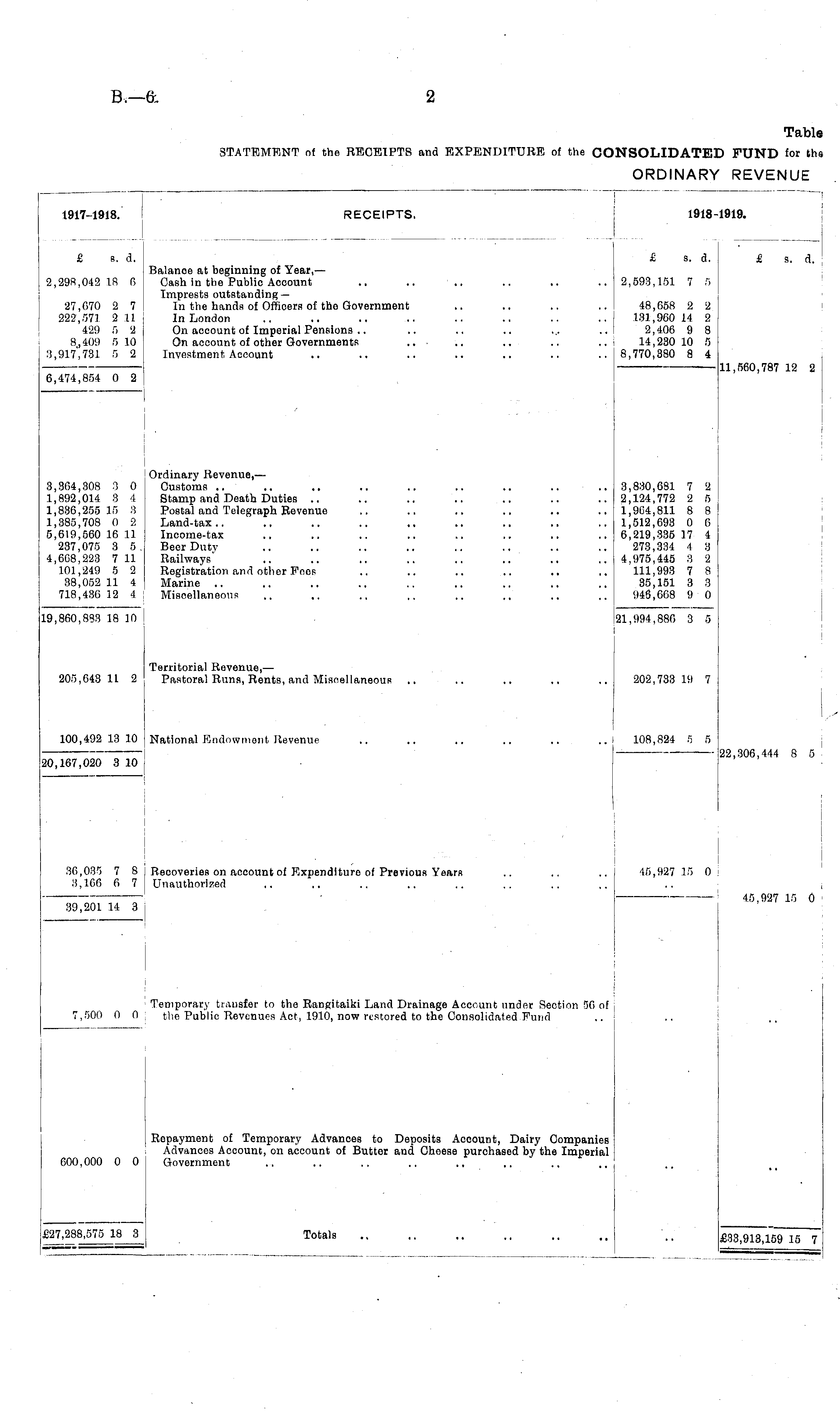 ! ! 1917-1918. RECEIPTS. 19181919. £ a. d. £ a. d. £ s. d. 2,298,042 18 6 27,670 2 7 222,571 2 11 429 S 2 8,409 5 10 8,917,731 fi 2 Balanoe at beginning of Year,— Cash in the Publio Account .. .. ' .. Imprests outstanding — In the hands of Officers of the Government In London On account of Imperial Pensions On aocount of other Governments Investment Aocount 2,593,151 7 S 48,658 2 2 131,960 14 2 2,406 9 8 14,230 10 5 8,770,380 8 4 6,474,854 0 2 11,560,787 12 2 3,364,308 3 0 1,892,014 8 4 1,886,255 15 8 1,385,708 0 2 5,619,560 16 11 237,075 3 5. 4,608,223 7 11 101,249 5 2 38,052 11 4 718,436 12 4 Ordinary Revenue, — Customs Stamp and Death Duties Postal and Telegraph Revenue Land-tax Income-tax Beer Duty Railways Registration and other Pees Marine Miscellaneous 3,830,681 7 2 2,124,772 2 5 1,904,811 8 8 1,512,693 0 6 6,219,335 17 4 273,334 4 3 4,975,445 3 2 111,993 7 8 35,151 3 3 946,668 9 0 .9,860,893 18 10 21,994,886 3 5 205,648 11 2 Territorial Revenue, — Pastoral Runs, Rents, and Miscellaneous 202,733 19 7 100,492 13 10 National Endowment Revenue .. .. .. .. .. 108,824 5 5 22,306,444 8 5 10,167,020 3 10 36,035 7 8 3,166 6 7 Recoveries on account of Expenditure of Previous Years Unauthorized 45,927 15 0 45,927 IS 0 39,201 14 3 7,500 0 0 Temporary transfer to the Rangitaiki Land Drainage Acoount under Section 56 of the Public Revenues Act, 1910, now restored to the Consolidated Fund Repayment of Temporary Advanoes to Deposits Acoount, Dairy Companies Advances Account, on account of Butter and Cheese purchased by the Imperial Government 600,000 0 0 £27,288,575 18 3 Totals £33,913,159 15 7