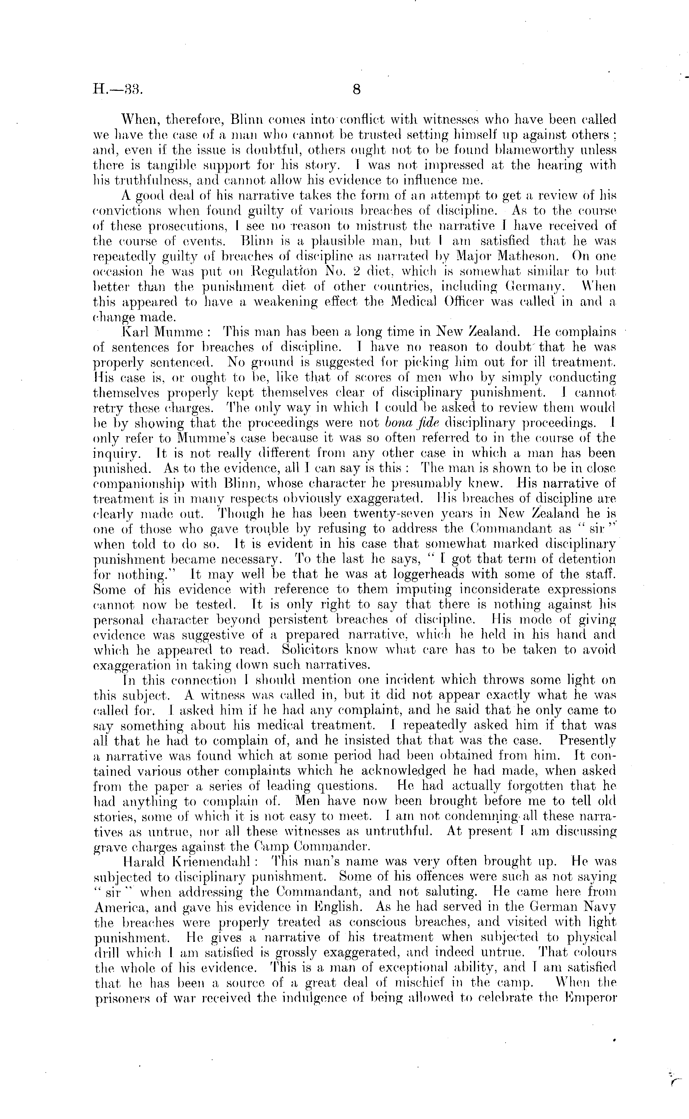 When, therefore, Blinn comes into conflict with witnesses who have been called we have the case of a man who cannot be trusted setting himself up against others : and, even if the issue is doubtful, others ought not to be found blameworthy unless there is tangible support for his story. I was not impressed at the hearing with his truthfulness, and cannot allow his evidence fo influence me. A good deal of his narrative lakes the form of an attempt to get a review of his convictions when found guilty of various breaches of discipline. As to the course of these prosecutions, I see no reason to mistrust the narrative I have received of the course of events. Blinn is a plausible man, but iam satisfied that lie was repeatedly guilty of breaches of discipline as narrated by Major Matheson. On one occasion he was put on Regulation No. 2 diet, which is somewhat similar to but better thin the punishment diet of other countries, including Germany. When this appeared to have a weakening effect the' Medical Officer was called in and a change made. Karl Mumme : "This man has been a, long time in New Zealand. He complains of sentences for breaches of discipline. I have no reason to doubt that he was properly sentenced. No ground is suggested for picking him out for ill treatment. His case is, or ought to be, like that of scores of men who by simply conducting themselves properly kept themselves clear of disciplinary punishment. I cannot retry these charge's. The only way in which I could be asked to review them would be by showing that the proceedings were not bona fide disciplinary proceedings. I only refer to Muiume's ease because it was so often referred to in the course of the inquiry. It is not really different from any other case in which a man has been punished. As to the evidence, all I can say is this : The man is shown to be in close companionship with Blinn. whose character he presumably knew. His narrative of treatment is in many respects obviously exaggerated. Mis breaches of discipline are clearly made out. Though he has been twenty-seven years in New Zealand he is one of those who gave trouble by refusing to address the Commandant as " sir" when told to do so. It is evident in his case that somewhat marked disciplinary punishment became, necessary. To the last he, says, " I got that, term of detention for nothing." It may well be that he was at loggerheads with some of the stall. Some of his evidence with reference to them imputing inconsiderate expressions cannot now be tested. It is only right to say that there is nothing against his personal character beyond persistent breaches of discipline. His mode of giving evidence was suggestive of a prepared narrative, which he held in his hand and which he appeared to read. Solicitors know what care has to be taken to avoid exaggeration in taking down such narratives. In this connection 1 should mention one incident which throws some light on this subject. A witness was called in. but it did not appear exactly what he was called for. I asked him if he had any complaint, and he said that he only came to say something about his medical treatment. I repeatedly asked him if that was all that he had to complain of, and he insisted that that was the case. Presently a, narrative was found which at some period had been obtained from him. It contained various other complaints which he acknowledged he had made, when asked from the paper a series of leading questions. lie had actually forgotten that he had anything to complain of. Men have now been brought before me to tell old stories, some of which it is not easy to meet. lam nol condemning-all these narratives as untrue, nor all these witnesses as untruthful. A 1 present I am discussing grave charges against the Camp Commander. Harald Kriemendahl : This man's name was very often brought up. He was subjected to disciplinary punishment. Some of his offences were such as not saying "sir" when addressing the Commandant, and not saluting. He came here from America, and gave his evidence in English. As he had served in the German Navy the breaches were properly treated as conscious breaches, and visited with light punishment. He gives a narrative 1 , of his treatment whim subjected to physical drill which I am satisfied is grossly exaggerated, and indeed untrue. That colours the whole of his evidence. This is a man of exceptional ability, and lam satisfied that he has been a source of a great deal of mischief in the camp. When the prisoners of war received the indulgence of being allowed to celebrate the Emperor