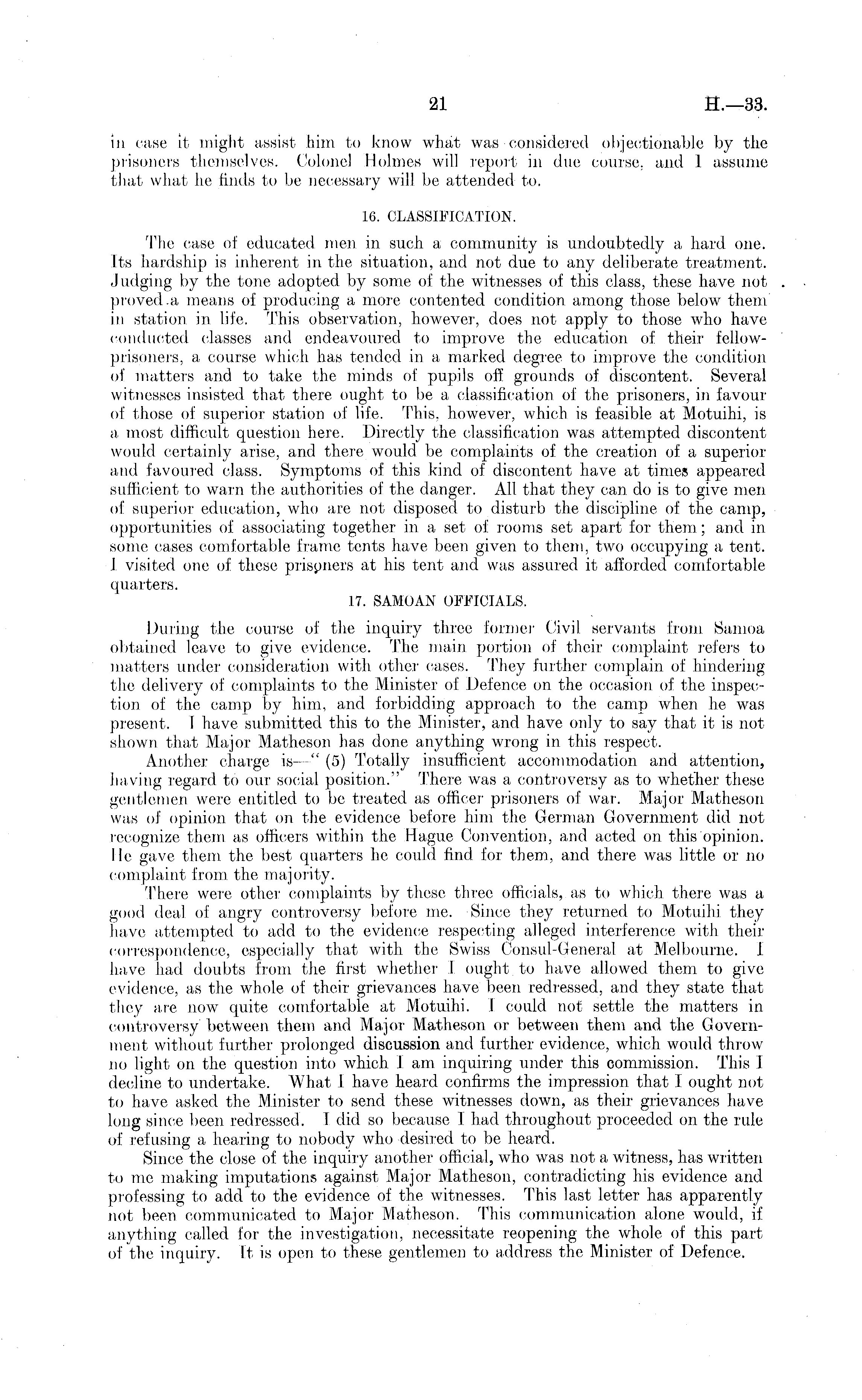 in case it might assist him to know what was considered objectionable by the prisoners themselves. Colonel Holmes will report in due course, and 1 assume that what he finds to be necessary will be attended to. 16. CLASSIFICATION. The case of educated men in such a community is undoubtedly a hard. one. Its hardship is inherent in the situation, and not, due to any deliberate treatment. Judging by the tone adopted by some of the witnesses of this class, these have not proved.a means of producing a more contented condition among those below them, in station in life. This observation, however, does not apply to those who have conducted classes and endeavoured to improve the education of their fellowprisoners, a course which has tended in a marked degree to improve the condition of matters and to take the minds of pupils off grounds of discontent. Several witnesses insisted that there ought to be a classification of the prisoners, in favour of those of superior station of life. This, hoAvever, which is feasible at Motuihi, is a most difficult question here. Directly the classification was attempted discontent would certainly arise, and there would be complaints of the creation of a superior and favoured class. Symptoms of this kind of discontent have at times appeared sufficient to warn the authorities of the danger. All that they can do is to give men of superior education, who are not disposed to disturb the discipline of the camp, opportunities of associating together in a set of rooms set apart for them ; and in some cases comfortable frame tents have been given to them, two occupying a tent. 1 visited one of these prispners at his tent and was assured it afforded comfortable quarters. 17. SAMOAN OFFICIALS. During the course of the inquiry three former Civil servants from Samoa obtained leave to give evidence. The main portion of their complaint refers to matters under consideration with other cases. They further complain of .hindering the delivery of complaints to the Minister of Defence on the occasion of the inspection of the camp by him, and forbidding approach to the camp when he was present. I have submitted this to the Minister, and have only to say that it is not shown that Major Matheson has done anything wrong in this respect. Another charge is—" (5) Totally insufficient accommodation and attention, having regard to our social position." There was a controversy as to whether these gentlemen were entitled to be treated as officer prisoners of war. Major Matheson was of opinion that on the evidence before him the German Government did not recognize them as officers within the Hague Convention, and acted on this opinion. He gave them the best quarters he could find for them, and there was little or no complaint from the majority. There were other complaints by these three officials, as to which there was a good deal of angry controversy before me. Since they returned to Motuihi they have attempted to add to the evidence respecting alleged interference with their correspondence, especially that with the Swiss Consul-General at Melbourne. I have had doubts from the first whether I ought to have allowed them to give evidence, as the whole of their grievances have been redressed, and they state that they are now quite comfortable at Motuihi. I could not settle the matters in controversy between them and Major Matheson or between them and the Government without further prolonged discussion and further evidence, which would throw no light on the question into which I am inquiring under this commission. This I decline to undertake. What 1 have heard confirms the impression that I ought not to have asked the Minister to send these witnesses down, as their grievances have long since been redressed. I did so because 1 had throughout proceeded on the rule of refusing a hearing to nobody who desired to be heard. Since the close of the inquiry another official, who was not, a witness, has written to me making imputations against Major Matheson, contradicting his evidence and professing to add to the evidence of the witnesses. This last letter has apparently not been communicated to Major Matheson. This communication alone would, if anything called for the investigation, necessitate reopening the whole of this part of the inquiry. It is open to these gentlemen to address the Minister of Defence.