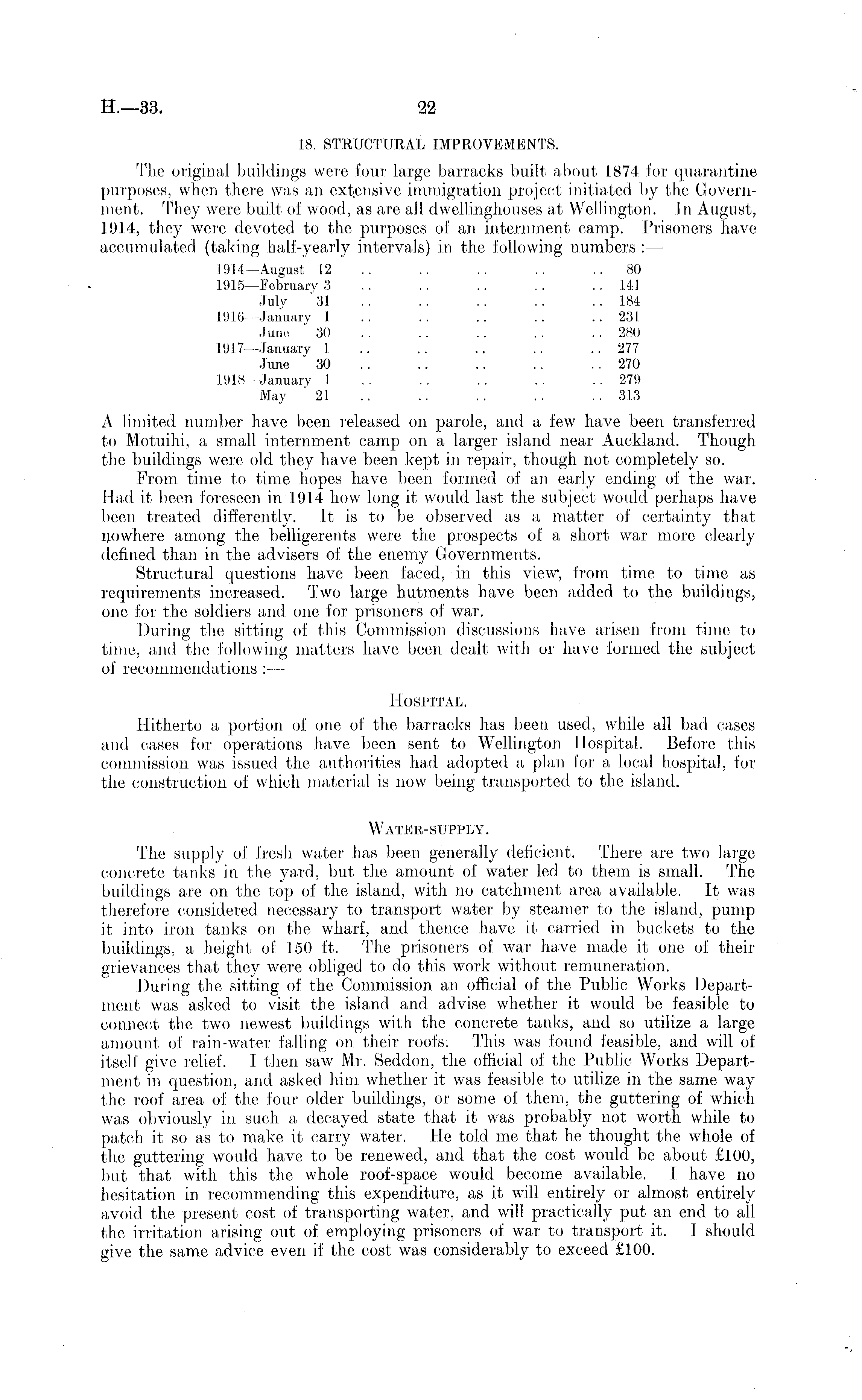 18. STRUCTURAL IMPROVEMENTS. The original buildings were four large barracks built about 1874 for quarantine purposes, when there was an extensive immigration project initiated by the Government. They were built of wood, as are all dwellinghouses at Wellington. In August,, 1914, they were devoted to the purposes of an internment camp. Prisoners have accumulated (taking half-yearly intervals) in the following numbers : — 1914—August 12 .. .. .. .. ..80 1915—February 3 .. .. .. .. .. 14.1 July 31 .. .. .. .. ..184 1916 -January 1 .. .. .. .. ..231 June '30 .. .. ..280 1917—January I .. .. .. .. ..277 June 30 .. .. .. ..270 1918—January 1 . . . . .. . . .. 279 May 21 .. .. .. ... ..313 A limited number have been released on parole, and a few have been transferred to Motuihi, a small internment camp on a larger island near Auckland. Though the buildings were old they have been kept in repair, though not completely so. From time to time hopes have; been formed of an early ending of the war. Had it been foreseen, in 1914 how long it would last the subject would perhaps have been treated differently. It is to be observed as a matter' of certainty that nowhere among the belligerents were the prospects of a short war more clearly defined than in the advisers of the enemy Governments. Structural questions have been faced, in this view, from time to time as requirements increased. Tavo large hutments have been added to the buildings, one for the soldiers and one for prisoners of war. During the sitting of this Commission discussions have arisen from time to time, and the following matters have been dealt with or have formed the subject of recommendations : — Hospital. Hitherto a portion of one of the barracks has been used, while all bad cases and cases for operations have been sent to Wellington Hospital. Before this commission was issued the authorities had adopted a plan for a local hospital, for the construction of which material is now being transported to the island. Water-supply. The supply of fresh water has been generally deficient. There are two huge concrete tanks in the yard, but, the amount of water led to them is small. The buildings are on the, top of the island, with no catchment area available. It was therefore considered necessary to transport, water by steamer to the island, pump it into iron tanks on the wharf, and thence have it carried in buckets to the buildings, a height of 150 ft. The prisoners of war have made it one of their grievances that they were obliged to do this work without remuneration. During the sitting of the Commission an official of the Public, Works Department was asked to visit the island and advise whether it would be feasible to connect the two newest buildings with the concrete tanks, and so utilize a large amount of rain-water falling on their roofs. This was found feasible, and will of itself give relief. I then saw Mr. Sedclon, the official of the Public Works Department in question, and asked him whether it was feasible to utilize in the same way the roof area of the four older buildings, or some of them, the guttering of which was obviously in such a decayed state that it was probably not, worth while to patch it so as to make it carry water. lie told me that he thought the whole of the guttering would have to be renewed, and that the cost would be about £100, but that with this the whole roof-space would become available. I have no hesitation in recommending this expenditure, as it will entirely or almost entirely avoid the present cost of transporting water, and will practically put an end to all the irritation arising out of employing prisoners of war to transport it. I should give the same advice even if the cost was considerably to exceed £100.