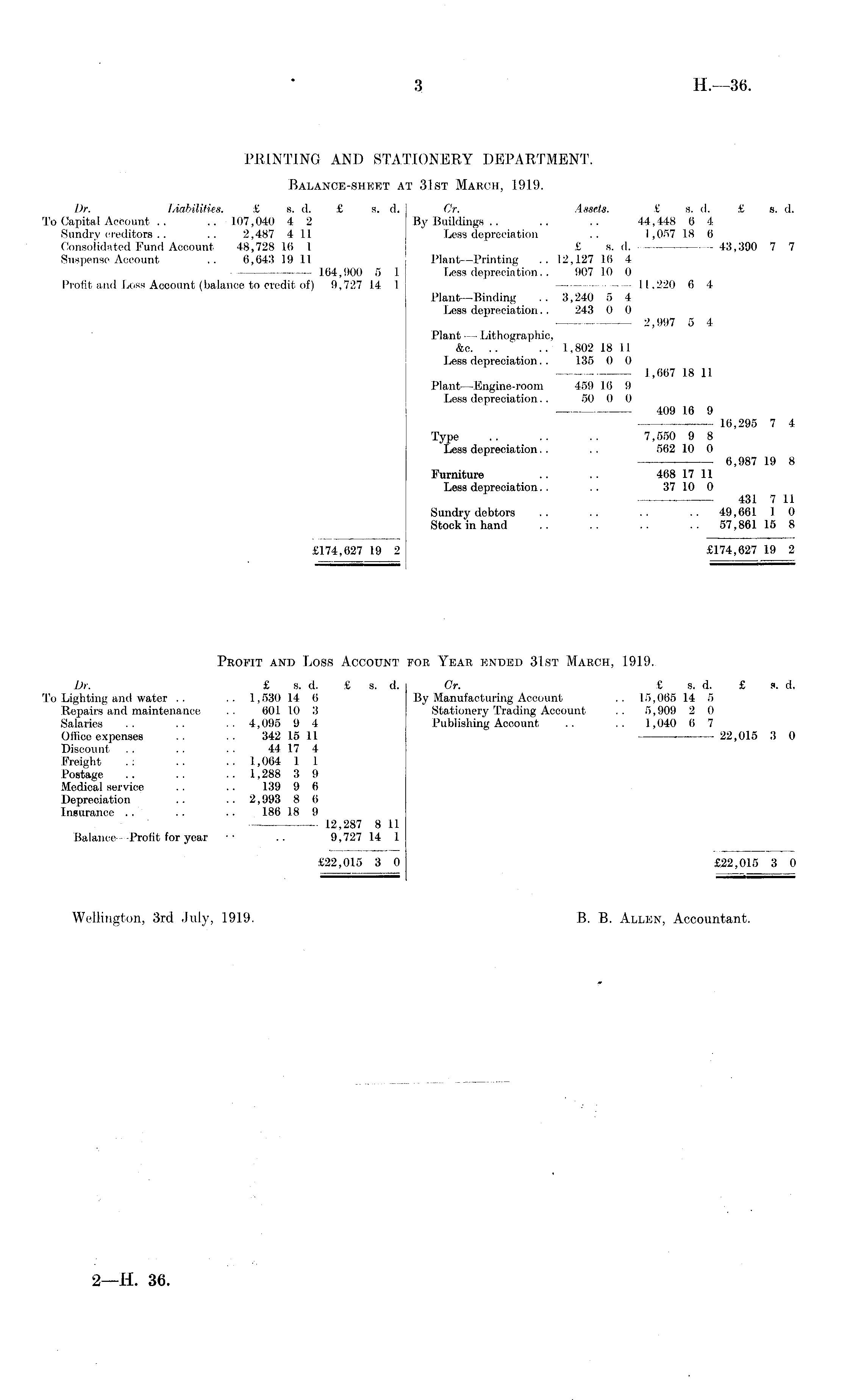 PRINTING AND STATIONERY DEPARTMENT. Balance-sheet at 31st March, 1919. Dr. Liabilities. £ s. d. £ s. d. Or. Assets. £ s. d. £ s. d. To Capital Account . . .. 107,040 4 2 By Buildings . . .. .. 44,448 6 4 Sundry creditors .. .. 2,487 4 11 Less depreciation .. 1,057 18 (i Consolidated Fund Account 48,728 16 I £ s. d. 43,390 7 7 Suspense Account .. 6,643 19 11 Plant—Printing .. 12,127 16 4 164,900 5 1 Less depreciation. . 907 10 0 Profit and boss Aooount (balance to credit of) 9,727 14 1 —11,220 6 4 Plant—Binding .. 3,240 5 4 Less depreciation.. 243 0 0 2,997 5 4 Plant - Lithographic, &c. .. .. 1.802 18 11 Less depreciation. . 135 0 0 ],OG7 18 11 Plant—Engine-room 459 16 9 Less depreciation.. 50 0 0 — 409 16 9 . 16,295 7 4 Type .. .. .. 7,550 9 8 Less depreciation. . .. 562 10 0 6,987 1.9 8 Furniture .. . . 468 17 11 Less depreciation. . . . 37 10 0 431 7 11 Sundry debtors .. .. .. .. 49,661 1 0 Stock in hand .. .. .. .. 57,86115 8 £174,627 19 2 £174,627 19 2 Profit and Loss Account for Year ended 31st March, 191 i). Dr. £ s. d. £ s. d. Or. £ s. d. £ s. d. To Lighting and water .. .. 1,530 14 0 By Manufacturing Account .. 15,065 14 5 Repairs and maintenance . . 601 10 3 Stationery Trading Account . . 5,909 2 0 Salaries .. .. .. 4,095 9 4 Publishing Account .. .. 1,040 6 7 Office expenses .. .. 342 15 11 ■ 22,015 3 0 Discount .. . . .. 44 17 4 Freight . : .. .. 1,064 1 1 Postage .. .. .. 1,288 3 9 Medical service .. .. 139 9 6 Depreciation .. .. 2,993 8 6 Insurance . . .. .. 186 18 9 12,287 8 11 Balance—Profit for year •• .. 9,727 14 1 £22,015 3 0 £22,015 3 0 Wellington, 3rd July, 1919. B. B. Allen, Accountant.