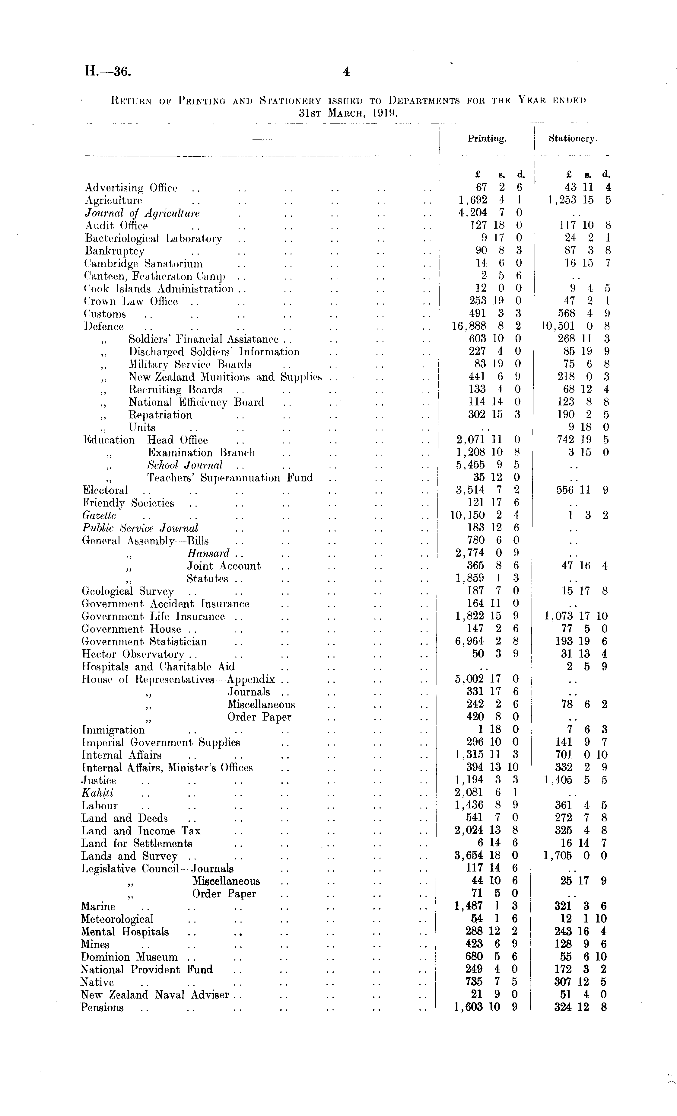 Advertising Office Agriculture Journal of Agriculture Audit Office ' Bacteriological Laboratory Bankruptcy Cambridge Sanatorium Canteen, Featherston Camp Cook Islands Administration Crown Law Office Customs Defence ,, Soldiers' Financial Assistance .. ,, Discharged Soldiers' Information ,, Military Service Boards ,, New Zealand Munitions and Supplies . . ,, Recruiting Boards ,, National Efficiency Board ,, Repatriation ,, Units Education —Head Office ,, Examination Branch ,, School Journal „ Teachers' Superannuation Fund Electoral Friendly Societies Gazette Public Service Journal General Assembly Bills ,, Hansard .. „ Joint Account ,, Statutes Geological Survey Government Accident Insurance Government Life, Insurance Government House Government Statistician Hector Observatory Hospitals and Charitable Aid House of Representatives Appendix . . ,, Journals .. ,, Miscellaneous ,, Order Paper Immigration Imperial Government Supplies Internal Affairs Internal Affairs, Minister's Offices Justice Kahili Labour Land and Deeds Land and Income Tax Land for Settlements Lands and Survey Legislative Council Journals ,, Miscellaneous ,, Order Paper Marine Meteorological Mental Hospitals Mines Dominion Museum National Provident Fund Native New Zealand Naval Adviser Pensions - ■ • • I I Printing. £ s. d. 67 2 6 1.692 4 1 4.204 7 0 127 18 0 9 17 0 90 8 3 L4 6 0 2 5 6 12 0 0 253 .19 0 491 3 3 16,888 8 2 603 10 0 227 4 0 83 19 0 441 6 9 133 4 0 114 14 0 302 15 3 2,071 II 0 1,208 10 8 5,455 9 5 35 12 0 3.514 7 2 121 17 6 10,150 2 4 183 12 6 780 6 0 2.774 0 9 365 8 6 1.859 I 3 187 7 0 164 11 0 1,822 15 9 147 2 6 6,964 2 8 50 3 9 5,002 17 0 331 17 6 242 2 6 420 8 0 1 18 0 296 10 0 1,315 11 3 394 13 10 1,194 3 3 2,081 6 I 1,436 8 9 541 7 0 2,024 13 8 6 14 6 3,654 18 0 117 14 6 44 10 6 71 5 0 1,487 1 3 5.4 1 6 288 12 2 423 6 9 680 5 6 249 4 0 735 7 5 21 9 0 1,603 10 9 I I Stationery. £ 8. d. 43 11 4 1,253 15 5 117 10 8 24 2 J 87 3 8 16 15 7 9 4 5 47 2 1 568 4 9 10.501 0 8 268 IJ 3 85 19 9 75 6 8 218 0 3 68 12 4 123 8 8 190 2 5 9 18 0 742 19 5 3 15 0 556 11 9 1 3 2 47 16 4 15 17 8 1.073 17 10 77 5 0 193 19 6 31 13 4 2 5 9 78 6 2 7 6 3 141 9 7 701 0 10 332 2 9 1.405 5 5 361 4 5 272 7 8 325 4 8 16 14 7 1,705 0 0 25 17 9 321 3 6 12 1 10 243 16 4 128 9 6 55 6 10 172 3 2 307 12 5 51 4 0 324 12 8