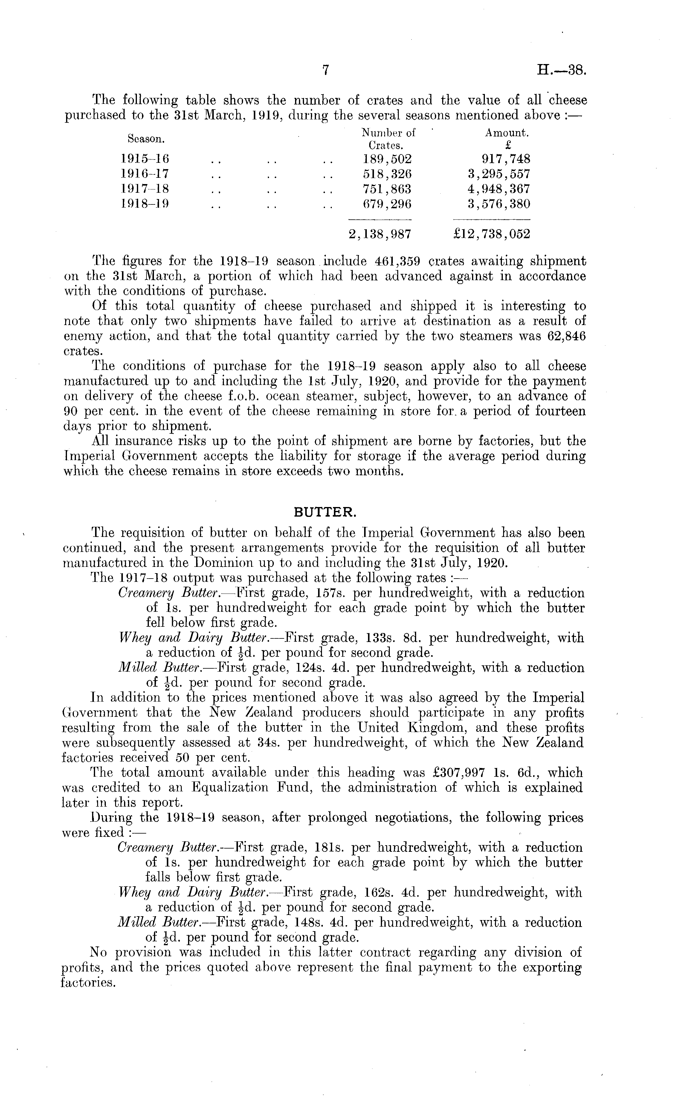 The following table shows the number of crates and the value of all cheese purchased to the 31st March, 1919, during the several seasons mentioned above : — r, . Number of Amount, beason. „ „ Crates. £ 1915-16 .. .. .. 189,502 917,748 1916-17 .. .. .. 518,326 3,295,557 1917-18 .. .. .. 751,863 4,948,367 1918-19 .. .. ~ 679,296 3,576,380 2,138,987 £12,738,052 The figures for the 1918-19 season include 461,359 crates awaiting shipment on the 31st March, a portion of which had been advanced against in accordance with the conditions of purchase. Of this total quantity of cheese purchased and shipped it is interesting to note that only two shipments have failed to arrive at destination as a result of enemy action, and that the total quantity carried by the two steamers was 62,846 crates. The conditions of purchase for the 1918—19 season apply also to all cheese manufactured up to and including the Ist July, 1920, and provide for the payment on delivery of the cheese f.o.b. ocean steamer, subject, however, to an advance of 90 per cent, in the event of the cheese remaining in store for. a period of fourteen days prior to shipment. All insurance risks up to the point of shipment are borne by factories, but the Imperial Government accepts the liability for storage if the average period during which the cheese remains in store exceeds two months. BUTTER. The requisition of butter on behalf of the Imperial Government has also been continued, and the present arrangements provide for the requisition of all butter manufactured in the Dominion up to and including the 31st July, 1920. The 1917-18 output was purchased at the following rates : — Creamery Butter. —First grade, 1575. per hundredweight, with a reduction of Is. per hundredweight for each grade point by which the butter fell below first grade. Whey and Dairy Butter. —First grade, 1335. Bd. per hundredweight, with a reduction of Jd. per pound for second grade. Milled Butter. —First grade, 1245. 4d. per hundredweight, with a reduction of Jd. per pound for second grade. In addition to the prices mentioned above it was also agreed by the Imperial Government that the New Zealand producers should participate in any profits resulting from the sale of the butter in the United Kingdom, and these profits were subsequently assessed at 345. per hundredweight, of which the New Zealand factories received 50 per cent. The total amount available under this heading was £307,997 Is. 6d., which was credited to an Equalization Fund, the administration of which is explained later in this report. During the 1918-19 season, after prolonged negotiations, the following prices were fixed : — Creamery Butter. —First grade, 181s. per hundredweight, with a reduction of Is. per hundredweight for each grade point by which the butter falls below first grade. Whey and Dairy Butter. —First grade, 1625. 4d. per hundredweight, with a reduction of Jd. per pound for second grade. Milled Butter. —First grade, 148s. 4d. per hundredweight, with a reduction of Jd. per pound for second grade. No provision was included in this latter contract regarding any division of profits, and the prices quoted above represent the final payment to the exporting factories.