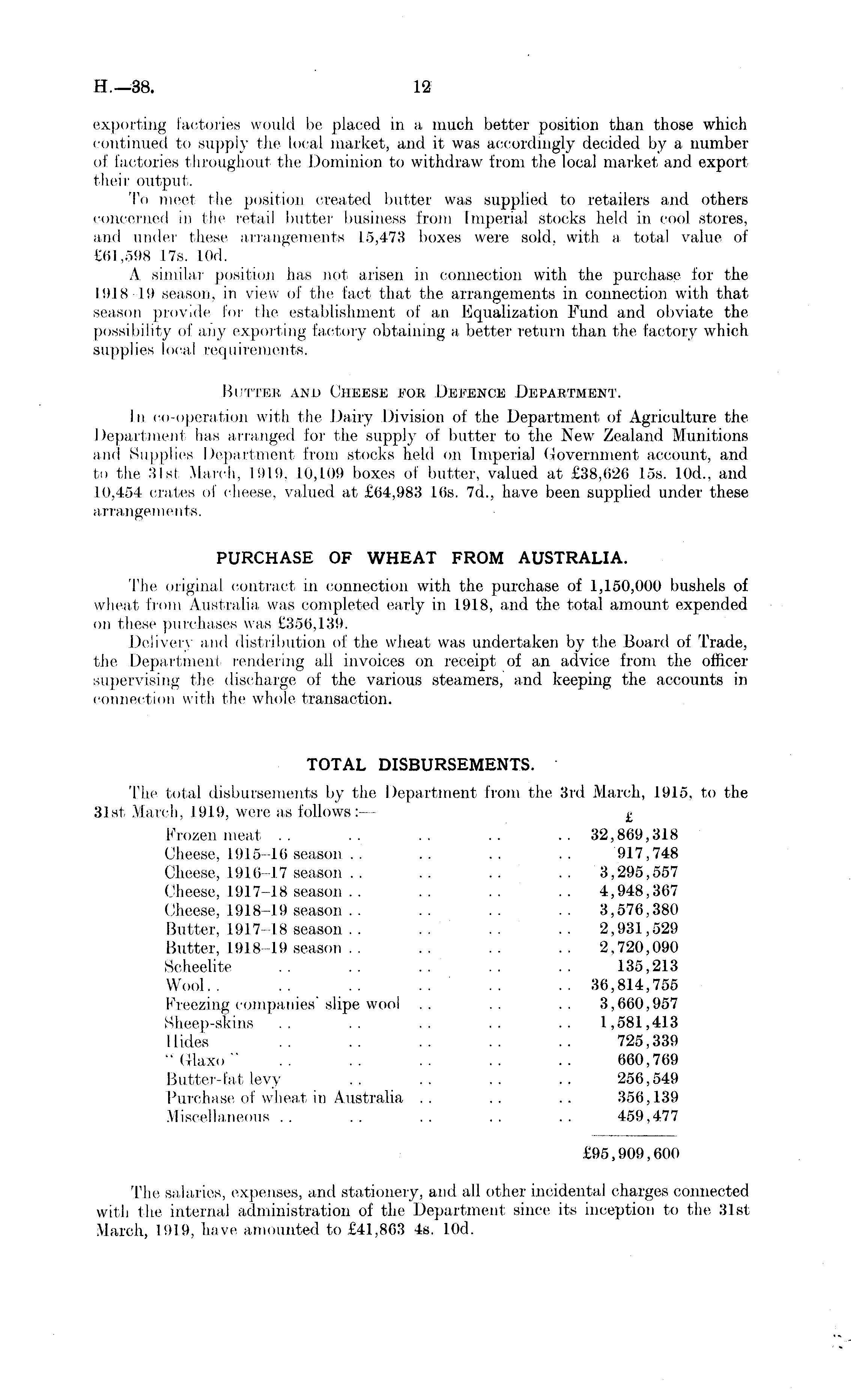 exporting factories would be placed in a, much better position than those which continued to supply the local market, and it was accordingly decided by a number of factories throughout the Dominion to withdraw from the local market and export their output. To meet the position created butter was supplied to retailers and others concerned in the retail butter business from Imperial stocks held in cool stores, and under these arrangements 15,473 boxes were sold, with a total value of £61,598 17s. lOd. A similar position has not arisen in connection with the purchase for the 1918-19 season, in view of the fact that the arrangements in connection with that season provide for the establishment of an Equalization Fund and obviate the possibility of any exporting factory obtaining a better return than the factory which supplies local requirements. Butter and Cheese cor Defence Department. In co-operation with the Dairy Division of the Department of Agriculture the Department: has arranged for the supply of butter to the New Zealand Munitions and Supplies Department from stocks held on Imperial Government account, and to the 31st March, 1919, 10,109 boxes of butter, valued at £38,626 15s. 10d., and 10,454 crates of cheese, valued at £64,983 16s. 7d., have been supplied under these arrangements. PURCHASE OF WHEAT FROM AUSTRALIA. The original contract in connection with the purchase of 1,150,000 bushels of wheat from Australia was completed early in 1918, and the total amount expended on these purchases was £356,139. Delivery and distribution of the wheat was undertaken by the Board of Trade, the Department rendering all invoices on receipt of an advice from the officer supervising the discharge of the various steamers, and keeping the accounts in connection with the whole transaction. TOTAL DISBURSEMENTS. The total disbursements by the Department from the 3rd March, 1915, to the 31st March, 1919, were as follows:— £ Frozen meat .. .. .. .. .. 32,869,318 Cheese, 1915-16 season . . .. .. .. 917,748 Cheese, 1916-17 season . . . . . . .. 3,295,557 Cheese, 1917-18 season . . .. .. .. 4,948,367 Cheese, 1918-19 season . . .. .. .. 3,576,380 Butter, 1917-18 season . . .. .. .. 2,931,529 Butter, 1918-19 season . . .. .. .. 2,720,090 Scheelite .. .. .. .. . . 135,213 Wool.. .. .. .. .. .. 36,814,755 Freezing companies'slipe wool .. .. .. 3,660,957 Sheep-skins .. .. .. .. .. 1,581,413 Hides .. .. .. .. .. 725,339 "Glaxo" .. .. .. .. .. 660,769 Butter-fat levy .. .. .. .. 256,549 Purchase of wheat in Australia .. .. .. 356,139 Miscellaneous .. .. .. .. .. 459,477 £95,909,600 The salaries, expenses, and stationery, and all other incidental charges connected with the internal administration of the Department since its inception to the 31st March, 1919, have amounted to £41,863 4s. lOd.