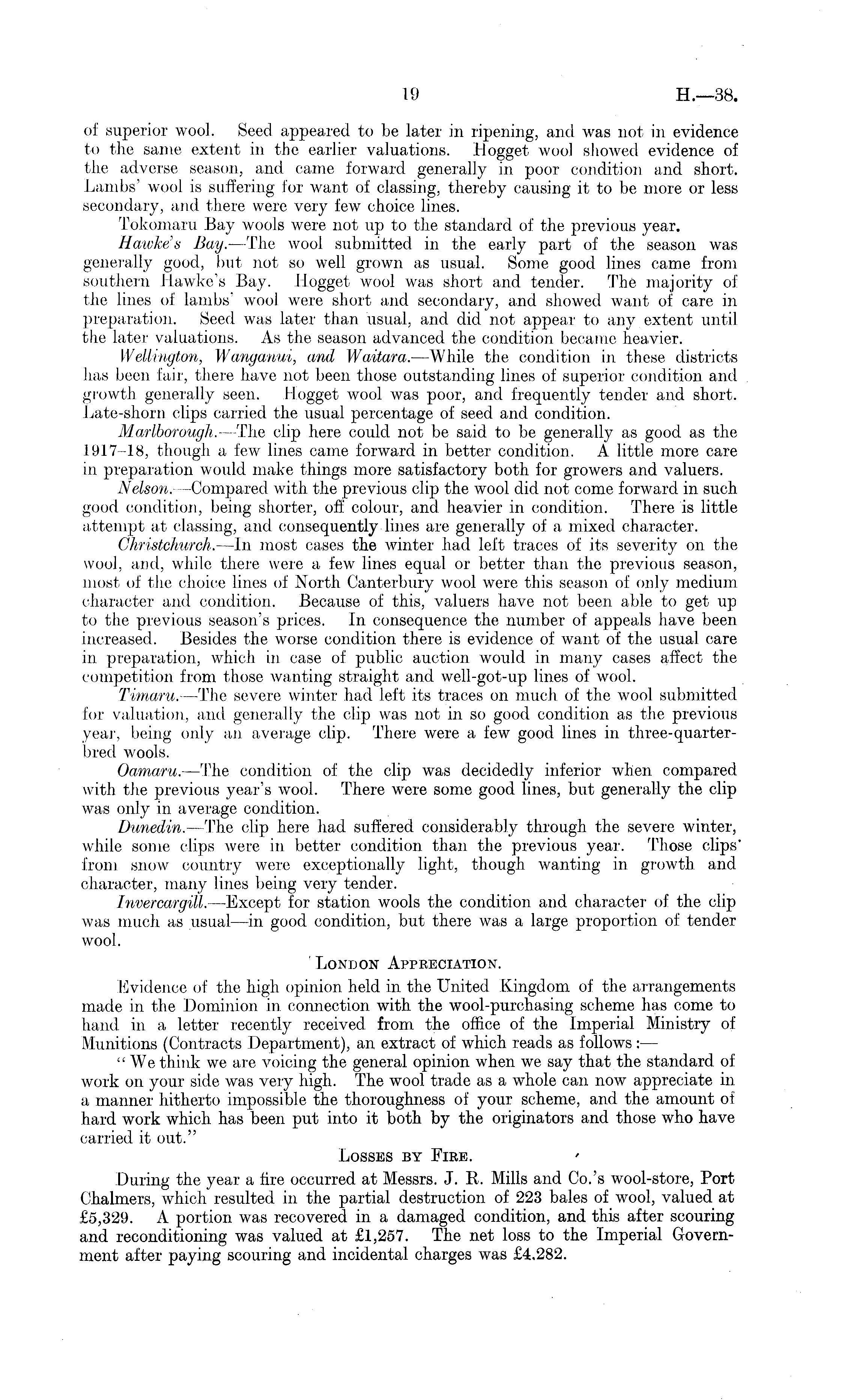 of superior wool. Seed appeared to be later in ripening, and was not in evidence to the same extent in the earlier valuations. Hogget wool showed evidence of the adverse season, and came forward generally in poor condition and short. Lambs' wool is suffering for want of classing, thereby causing it to be more or less secondary, and there were very few choice lines. Tokomaru Bay wools were not up to the standard of the previous year. Ha-wke's Bay. —The wool submitted in the early part of the season was generally good, but not so well grown as usual. Some good lines came from southern Hawke's Bay. Hogget wool was short and tender. The majority of the lines of lambs' wool were short and secondary, and showed want of care in preparation. Seed was later than usual, and did not appear to any extent until the later valuations. As the season advanced the condition became heavier. Wellington, Wanganui, and Waitara. —While the condition in these districts has been fair, there have not been those outstanding lines of superior condition and growth generally seen. Hogget wool was poor, and frequently tender and short. Late-shorn clips carried the usual percentage of seed and condition. Marlborough. —The clip here could not be said to be generally as good as the 1917-18, though a few lines came forward in better condition. A little more care in preparation would make things more satisfactory both for growers and valuers. Nelson. —Compared with, the previous clip the wool did. not come forward in such good condition, being shorter, off colour, and heavier in condition. There is little attempt at classing, and consequently lines are generally of a mixed character. Christchurch. —In most cases the winter had left traces of its severity on the wool, and, while there were a few lines equal or better than the previous season, most of the choice lines of North Canterbury wool were this season of only medium character and condition. Because of this, valuers have not been, able to get up to the previous season's prices. In consequence the number of appeals have been increased. Besides the worse condition there is evidence of want of the usual care in preparation, which in case of public auction would in many cases affect the competition from those wanting straight and well-got-up lines of wool. Timaru. —The severe winter had left its traces on much of the wool submitted for valuation, and generally the clip was not in so good condition as the previous year, being only an average clip. There were a few good lines in three-quarter-bred wools. Oamaru. —The condition of the clip was decidedly inferior when compared with the previous year's wool. Here were some good lines, but generally the clip was only in average condition. Dunedin. —The clip here had suffered considerably through the severe winter, while some clips were in better condition than the previous year. Those clips' from snow country were exceptionally light, though wanting in growth and character, many lines being very tender. Invercargill. —Except for station wools the condition and character of the clip was much as usual —in good condition, but there was a large proportion of tender wool. ' London Appreciation. Evidence of the high opinion held in the United Kingdom of the arrangements made in the Dominion in connection with the wool-purchasing scheme has come to hand in a letter recently received from the office of the Imperial Ministry of Munitions (Contracts Department), an extract of which reads as follows :— " We think we are voicing the general opinion when we say that the standard of work on your side was very high. The wool trade as a whole can now appreciate in a manner hitherto impossible the thoroughness of your scheme, and the amount of hard work which has been put into it both by the originators and those who have carried it out." Losses by Fire. ' During the year a fire occurred at Messrs. J. R. Mills and Co.'s wool-store, Port Chalmers, which resulted in the partial destruction of 223 bales of wool, valued at £5,329. A portion was recovered in a damaged condition, and this after scouring and reconditioning was valued at £1,257. The net loss to the Imperial Government after paying scouring and incidental charges was £4,282.