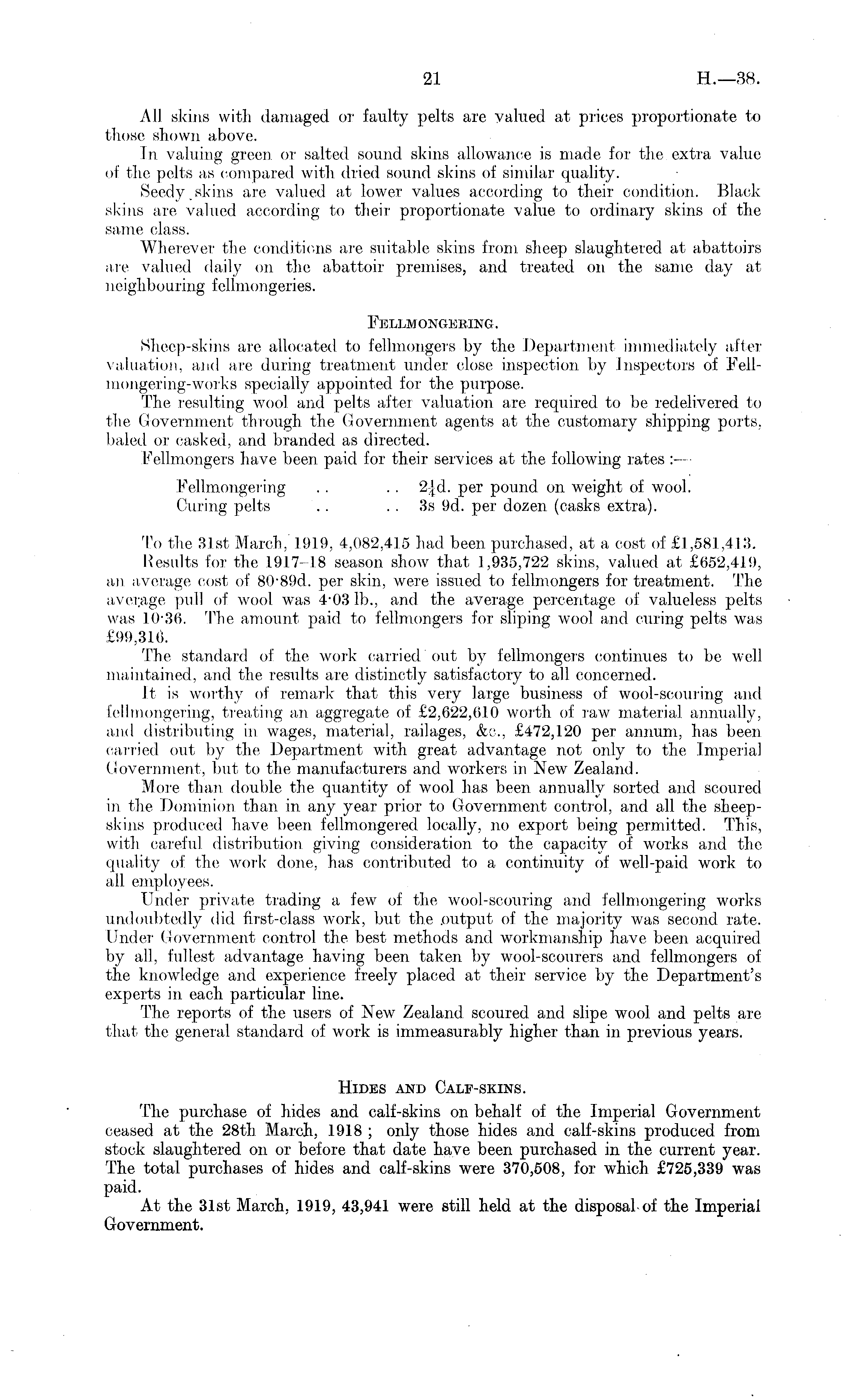 All skins with damaged or faulty pelts are valued at prices proportionate to those shown above. In valuing green, or salted sound skins allowance is made for the extra value of the pelts as compared with dried sound skins of similar quality. Seedy.skins are valued at lower values according to their condition. Black skins are valued according to their proportionate value to ordinary skins of the same class. Wherever the conditions are suitable skins from sheep slaughtered at abattoirs are valued daily on the abattoir premises, and treated on the same day at ileighbouring fellmongeries. Fellmongering . Sheep-skins are allocated to fellmongers by the Department immediately after valuation, and are during treatment under close inspection by Inspectors of Fell-mongering-works specially appointed for the purpose. The resulting wool and pelts after valuation are required to be redelivered to the Government through the Government agents at the customary shipping ports, baled or casked, and branded as directed. Fellmongers have been paid for their services at the following rates :— Fellmongering . . . . 2}d. per pound on weight of wool. Curing pelts '. . 3s 9d. per dozen (casks extra). To the 31st March, 1919, 4,082,415 had been purchased, at a cost of £1,581,413. Results for the 1917-18 season show that 1,935,722 skins, valued at £652,419, an average cost of 80'89d. per skin, were issued to fellmongers for treatment. The average pull of wool was 4.*03 lb., and the average percentage of valueless pelts was 10-36. The amount paid to fellmongers for sliping wool and curing pelts was £99,316. The standard of the work carried out by fellmongers continues to be well maintained, and the results are distinctly satisfactory to all concerned. It is worthy of remark that this very large business of wool-scouring and fellmongering, treating an aggregate of £2,622,010 worth of raw material annually, and distributing in wages, material, railages, &c, £472,120 per annum, has been carried out by the Department with great advantage not only to the Imperial Government, but to the manufacturers and workers in New Zealand. More than double the quantity of wool has been annually sorted and scoured in the Dominion than in any year prior to Government control, and all the sheepskins produced have been fellmongered locally, no export being permitted. This, with careful distribution giving consideration to the capacity of works and the quality of the work done, has contributed to a continuity of well-paid work to all employees. Under private trading a few of the wool-scouring and fellmongering works undoubtedly did first-class work, but the .output of the majority was second rate. Under Government control the best methods and workmanship have been acquired by all, fullest advantage having been taken by wool-scourers and fellmongers of the knowledge and experience freely placed at their service by the Department's experts in each particular line. The reports of the users of New Zealand scoured and slipe wool and pelts are that the general standard of work is immeasurably higher than in previous years. Hides and Calf-skins. The purchase of hides and calf-skins on behalf of the Imperial Government ceased at the 28th March, 1918 ; only those hides and calf-skins produced from stock slaughtered on or before that date have been purchased in the current year. The total purchases of hides and calf-skins were 370,508, for which £725,339 was paid. At the 31st March, 1919, 43,941 were still held at the disposal-of the Imperial Government.