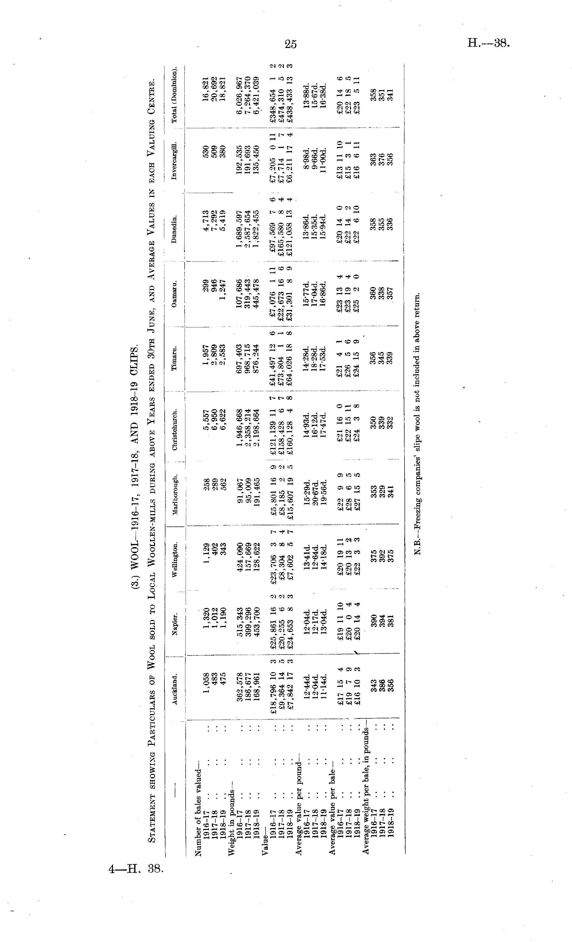 Auckland. Napier. Wellington. .Marlborough. Christchurch. Timaru. Oamaru. Dunedin. Invercargill. Total (Dominion). Number of bales valued — 1916-17 .. 1917-18 .. 1918-19 .. Weight in pounds — 1916-17 .. 1917-18 1918-19 .. 1,058 483 475 1,320 1,012 1,190 1,129 402 343 258 5,557 1,957 299 4,713 289 6,950 2,809 946 7,292 562 6,622 2,583 1.247 5.419 530 16,821 509 20,692 380 18,821 362,578 186,677 168,961 515,343 399,296 453,700 424,090 157,669 128,622 91,067 1,946,668 697,403 107,686 1,689,597 95,009 2,358,214 968,715 319,443 2,587.654 191,465 2,198.664 876.244 445,478 1,822,455 £5,801 16 9 | £121,139 11 7 £41,497 12 6 i £7,076 1 11 £97,569 7 6 £8 185 2 2 £158,428 6 7 £73,804 1 1 [ £22,673 16 6 £165,580 8 4 £15 607 19 5 £160,128 4 8 £64,026 18 8; £31,301 8 9 £121,058 13 4 192,535 6,026,967 191,693 7,264,370 135,450 6,421,039 £7,205 0 11 £348,654 1 2 £7,714 1 7 £474,310 5 2 £6,211 17 4 £438,433 13 3 Value — 1916-17 .. 1917-18 .. 1918-19 Average value per pound — 1916-17 .. 1917-18 .. 1918-19 .. Average value per bale — 1916-17 .. 1917-18 .. 1918-19 .. Average weight per bale, in pounds — 1916-17 .. 1917-18 .. 1918-19 .. £18,796 10 3 £9,364 14 5 £7,842 17 3 12-44d. 12-04d. 1 l-14d. £25,861 16 2 £20,255 6 2 £24,653 8 3 1204d. 12-17d. 1304d. £23,706 3 7 £8,304 8 4 £7.602 5 7 13-41d. 12-64d. 14-18d. 15-29d. 14-93d. 1428d. 1577d. 13-86d. 20-67d. 16-12d. 18'28d. 1704d. 15-.35d. 19-56d. 17-474 1753d. 16-86d. 15-94d. 8-98d. 13-88d. 9-66d. 15-67d. ll-00d. 16-38'd. £17 15 4 £19 7 9 £16 10 3 £19 11 10 £20 0 4 £20 14 4 £20 19 11 £20 13 2 £22 3 3 £22 9 9 £21 16 0 £21 4 1 £23 13 4 £20 14 0 £28 6 5 £22 15 11 £26 5 6 £23 19 4 £22 14 2 £27 15 5 £24 3 8 £24 15 9 £25 2 0 £22 6 10 £13 11 10 £20 14 6 £15 3 1 £22 18 5 £16 6 11 £23 5 11 343 386 356 390 394 381 375 392 375 353 350 356 360 358 329 339 345 338 355 341 332 339 357 336 363 358 376 351 356 341 N.B. —Freezing companies' slipe wool is not included in above return.