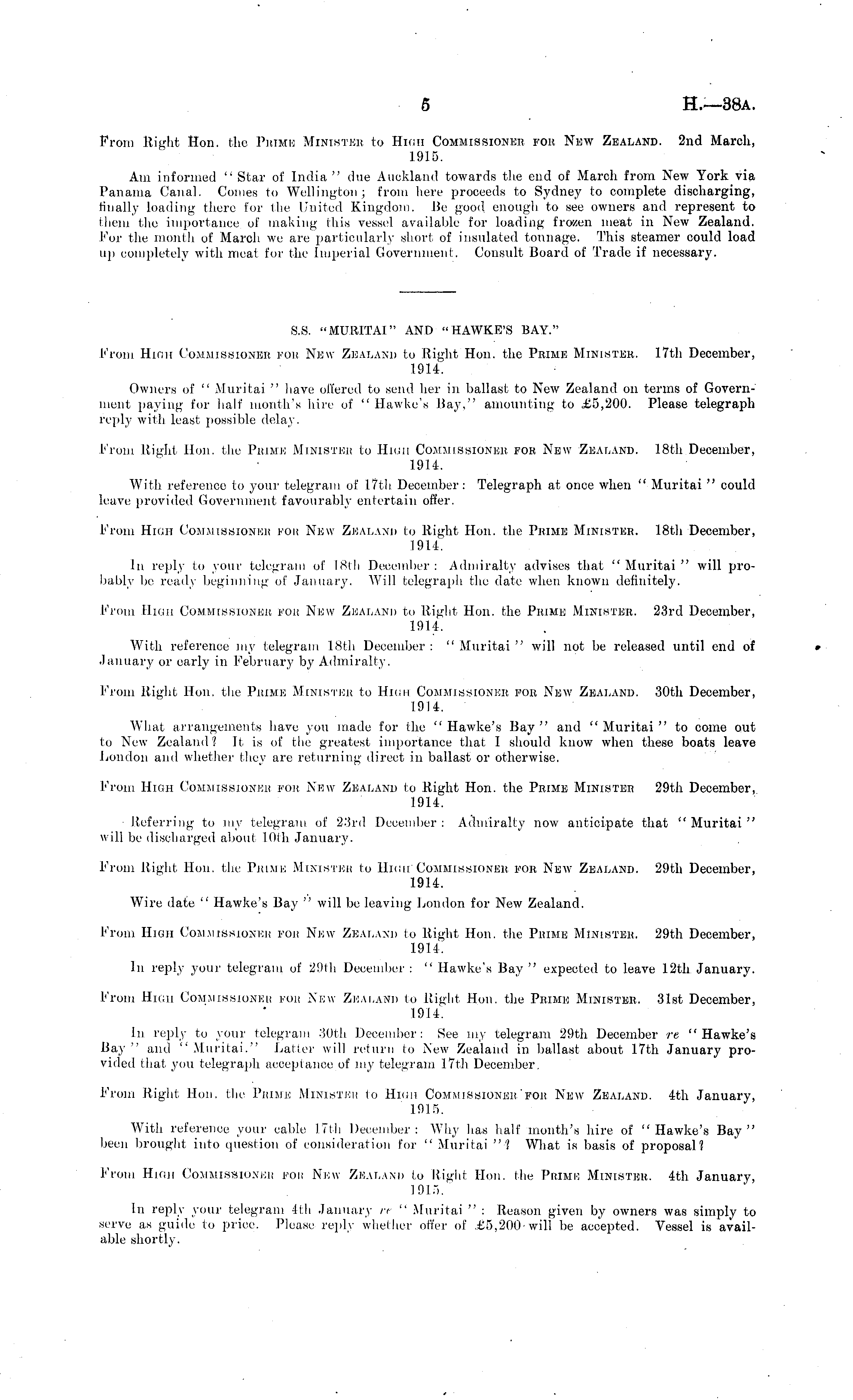 From Right Hon. the Prime Minister to High Commissioner for New Zealand. 2nd March, 1.915. Am informed " Star of India " due Auckland towards the end of March from New York via Panama Canal. Comes to Wellington; from here proceeds to Sydney to complete discharging, finally loading there for the United Kingdom. Be good enough to see owuers and represent to them the importance of making this vessel available for loading frozen meat in New Zealand. For the month of March we are particularly short of insulated tonnage. This steamer could load up completely with meat for the Imperial Government. Consult Board of Trade if necessary. S.S. "MURITAI" AND " HAWKE'S BAY." From High Commissioner for New Zealand to Right Hon. the Prime Minister. 17th December, 1914. Owners of " Muritai " have offered to send her in ballast to New Zealand on terms of Government paying for half month's hire of " Hawke's Bay," amounting to £5,200. Please telegraph reply with least possible delay. From Right Hon. the Prime Minister to High Commissioner for New Zealand. 18th December, 1914. With reference to your telegram of l?tb December: Telegraph at once when " Muritai " could leave provided Government favourably entertain offer. From High Commissioner for New Zealand to Right Hon. the Prime Minister. 18th December, 1914. In reply to your telegram of 18th December: Admiralty advises that "Muritai" will probably be ready beginning of January. Will telegraph the date when known definitely. From High Commissioner for New Zealand to Right Hon. the Prime Minister. 23rd December, 1914. With reference my telegram 18th December: "Muritai" will not be released until end of January or early in February by Admiralty. From Right Hon. the Prime Minister to High Commissioner for New Zealand. 30th December, 1914. What arrangements have you made for the " Hawke's Bay " and " Muritai " to come out to New Zealand? It is of the greatest importance that I should know when these boats leave London and whether they are returning direct in ballast or otherwise. From High Commissioner for New Zealand to Right Hon. the Prime Minister 29th December, 1914, Referring to my telegram of 23rd December : Admiralty now anticipate that " Muritai " will be discharged about 10th January. From Right Hon. the Prime Minister to High Commissioner for New Zealand. 29th December, 1914. Wire date " Hawke's Bay " will be leaving London for New Zealand. From High Commissioner for New Zealand to Right Hon. the Prime Minister. 29th December, 1914. In reply your telegram of 29th December : " Hawke's Bay " expected to leave 12th January. From High Commissioner for New Zealand to Right Hon. the Prime Minister. 31st December, 1914. In reply to your telegram 30th December: See my telegram 29th December re "Hawke's Bay" and "Muritai." Latter will return to New Zealand in ballast about 17th January provided that you telegraph acceptance of my telegram 17th December, From Right Hon. (he Prime Minister to High Commissioner for New Zealand. 4th January, 1915. With reference your cable 17th December: Why has half month's hire of "Hawke's Bay" been brought into question of consideration for "Muritai "? What is basis of proposal? From High Commissioner for New Zealand to Rigid Bon. the Prime Minister. 4th January, 1915. In reply your telegram lih January rt " Muritai " : Reason given by owners was simply to serve as guide to price. Please reply whether offer of £5,200 will be accepted. Vessel is available shortly.
