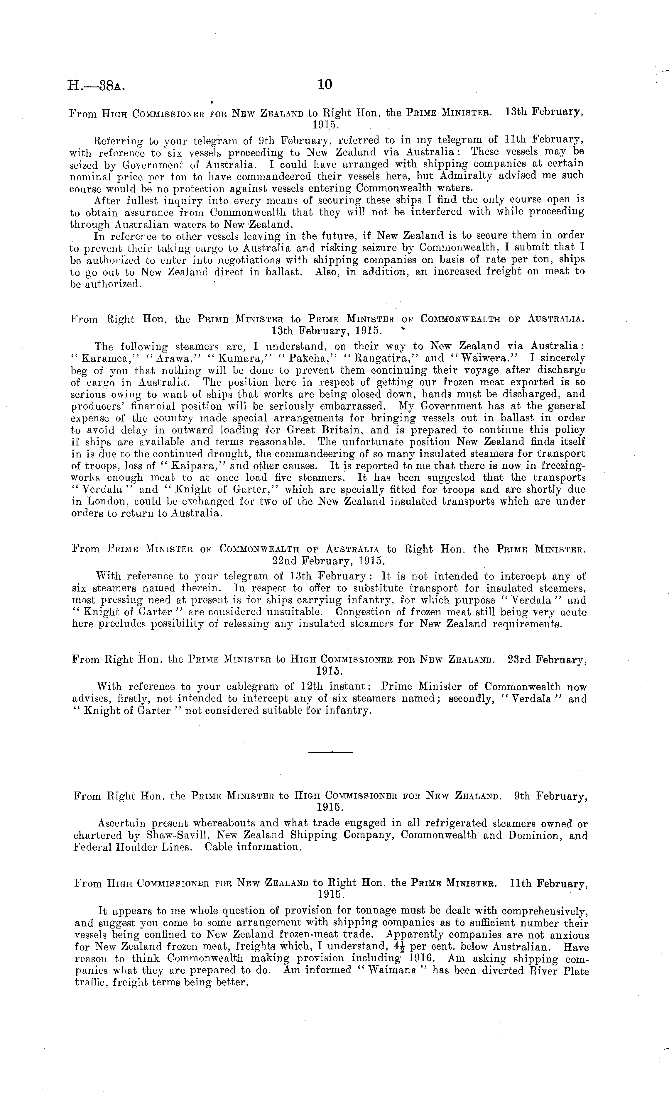 From High Commissioner for New Zealand to Right Hon. the Prime Minister. 13th February, 1915. Referring to your telegram of 9th February, referred to in my telegram of 11th February, with reference to six vessels proceeding to New Zealand via Australia : These vessels may be seized by Government of Australia. I could have arranged with shipping companies at certain nominal price per ton to have commandeered their vessels here, but Admiralty advised me such, course would be no protection against vessels entering Commonwealth waters. After fullest inquiry into every means of securing these ships I find the only course open is to obtain assurance from Commonwealth that they will not be interfered with while proceeding through Australian waters to New 'Zealand. In reference to other vessels leaving in the future, if New Zealand is to secure them in order to prevent their taking cargo to Australia and risking seizure by Commonwealth, I submit that I be authorized to enter into negotiations with shipping companies on basis of rate per ton, ships to go out to New Zealand direct in ballast. Also, in addition, an increased freight on meat to be authorized. From Right Hon. the Prime Minister to Prime Minister of Commonwealth of Australia. 13th February, 1915. The following steamers are, I understand, on their way to New Zealand via Australia: " Karamea," "Arawa," "Kumara," " Pakeha," "Rangatira," and "Waiwera." I sincerely beg of you that nothing will be done to prevent them continuing their voyage after discharge of cargo in Australia*. The position here in respect of getting our frozen meat exported is so serious owing to want of ships that works are being closed down, hands must be discharged, and producers' financial position will be seriously embarrassed. My Government has at the general expense of tho country made special arrangements for bringing vessels out in ballast in order to avoid delay in outward loading for Great Britain, and is prepared to continue this policy if ships are available and terms reasonable. The unfortunate position Now Zealand finds itself in is due to the continued drought, the commandeering of so many insulated steamers for transport of troops, loss of " Kaipara," and other causes. It is reported to me that there is now in freezingworks enough meat to at once load five steamers. It has been suggested that the transports " Verdala " and "Knight of Garter," which are specially fitted for troops and are shortly due in London, could be exchanged for two of the New 'Zealand insulated transports which are under orders to return to Australia. From Prime Minister of Commonwealth of Australia to Right Hon. the Prime Minister. 22nd February, 1915. With reference to your telegram of 13th February: It is not intended to intercept any of six steamers named therein. In respect to offer to substitute transport for insulated steamers, most pressing need at present is for ships carrying infantry, for which purpose "Verdala" and " Knight of Garter " are considered unsuitable. Congestion of frozen meat still being very acute here precludes possibility of releasing any insulated steamers for New Zealand requirements. From Right Hon. the Prime Minister to High Commissioner for New Zealand. 23rd February, 1915. With reference to your cablegram of 12th instant: Prime Minister of Commonwealth now advises, firstly, not intended to intercept any of six steamers named; secondly, "Verdala" and " Knight of Garter " not considered suitable for infantry. From Right Hon. the Prime Minister to High Commissioner for New Zealand. 9th February, 1915. Ascertain present whereabouts and what trade engaged in all refrigerated steamers owned or chartered by Shaw-Savill, New Zealand Shipping Company, Commonwealth and Dominion, and Federal Houlder Lines. Cable information. From High Commissioner for New 'Zealand to Right Hon. the Prime Minister. 11th February, 1915. It appears to me whole question of provision for tonnage must be dealt with comprehensively, and suggest you come to some arrangement with shipping companies as to sufficient number their vessels being confined to New Zealand frozen-meat trade. Apparently companies are not anxious for New Zealand frozen meat, freights which, I understand, 4J per cent, below Australian. Have reason to think Commonwealth making provision including 1916. Am asking shipping companies what they are prepared to do. Am informed " Waimana " has been diverted River Plate traffic, freight terms being better.