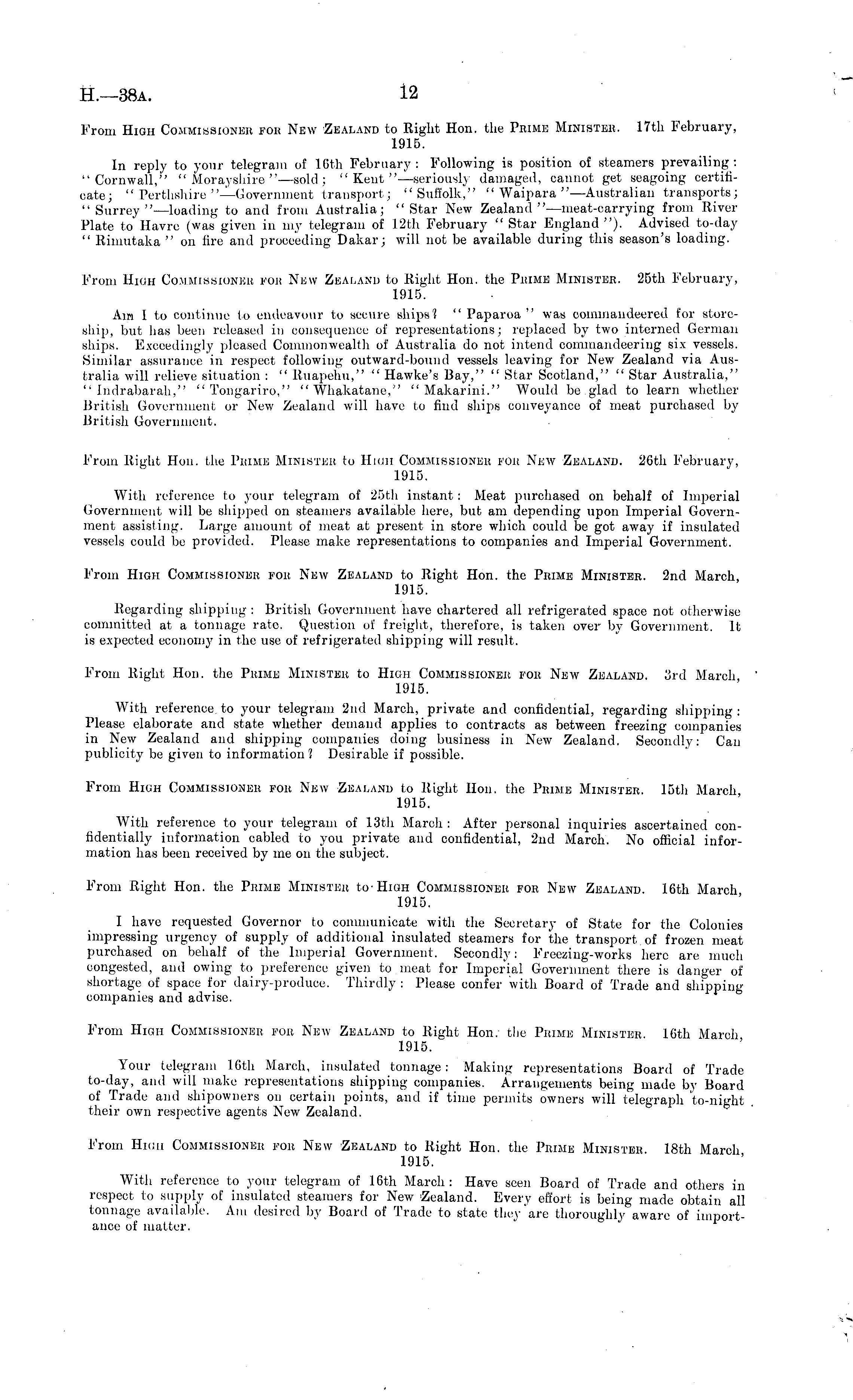 From High Commissioner for New Zealand to Right Hon. the Prime Minister. 17th February, 1915. In reply to your telegram of 16th February : Following is position of steamers prevailing : "Cornwall," "Morayshire" —sold; "Kent" —seriously damaged, cannot get seagoing certificate; " Perthshire "—Government transport; "Suffolk," " Waipara " —Australian transports; "Surrey" —loading to and from Australia; "Star New Zealand"—meat-carrying from River Plate to Havre (was given in my telegram of 12th February " Star England "). Advised to-day " Rimutaka " on fire and proceeding Dakar; will not be available during this season's loading. From High Commissioner for New Zealand to Right Hon. the Prime Minister. 25th February, 1915. Am Ito continue to endeavour to secure ships? " Paparoa " was commandeered for storeship, but has been released in consequence of representations; replaced by two interned German ships. Exceedingly pleased Commonwealth of Australia do not intend commandeering six vessels. Similar assurance in respect following outward-bound vessels leaving for New Zealand via Australia will relieve situation : " Ruapehu," " Hawke's Bay," " Star Scotland," " Star Australia," " Indrabarah," " Tongariro," "Whakatane," " Makarini." Would be glad to learn whether British Government or New Zealand will have to find ships conveyance of meat purchased by British Government. From Right Hon. the Prime Minister to High Commissioner for New Zealand. 26th February, 1915. With reference to your telegram of 25th instant : Meat purchased on behalf of Imperial Government will be shipped on steamers available here, but am depending upon Imperial Government assisting. Large amount of meat at present in store which could be got away if insulated vessels could be provided. Please make representations to companies and Imperial Government. From High Commissioner for New Zealand to Right Hon. the Prime Minister. 2nd March, 1915. Regarding shipping : British Government have chartered all refrigerated space not otherwise committed at a tonnage rate. Question of freight, therefore, is taken over by Government. It is expected economy in the use of refrigerated shipping will result. From Right Hon. the Prime Minister to High Commissioner for New Zealand. 3rd March 1915. With reference to your telegram 2nd March, private and confidential, regarding shipping : Please elaborate and state whether demand applies to contracts as between freezing companies in New Zealand and shipping companies doing business in New Zealand. Secondly: Can publicity be given to information ? Desirable if possible. From High Commissioner for New Zealand to Right Hon. the Prime Minister. 15th March 1915. With reference to your telegram of 13th March: After personal inquiries ascertained confidentially information cabled to you private and confidential, 2nd March. No official information has been received by me on the subject. From Right Hon. the Prime Minister to- High Commissioner for New Zealand. 16th March 1915. I have requested Governor to communicate with the Secretary of State for the Colonies impressing urgency of supply of additional insulated steamers for the transport of frozen meat purchased on behalf of the Imperial Government. Secondly: Freezing-works here are much congested, and owing to preference given to meat for Imperial Government there is danger of shortage of space for dairy-produce. Thirdly : Please confer with Board of Trade and shipping companies and advise. From High Commissioner for New Zealand to Right Hon; the Prime Minister Kith March 1915. Your telegram 16th March, insulated tonnage: Making representations Board of Trade to-day, and will make representations shipping companies. Arrangements being made by Board of Trade and shipowners on certain points, and if time permits owners will telegraph to-night their own respective agents New Zealand. From High Commissioner for New Zealand to Right Hon. the Prime Minister. 18th March 1915. With reference to your telegram of 16th March: Have seen Board of Trade and others in respect to supply of insulated steamers for New Zealand. Every effort is being made obtain all tonnage available. Am desired by Board of Trade to state they'are thoroughly aware of importance of matter.