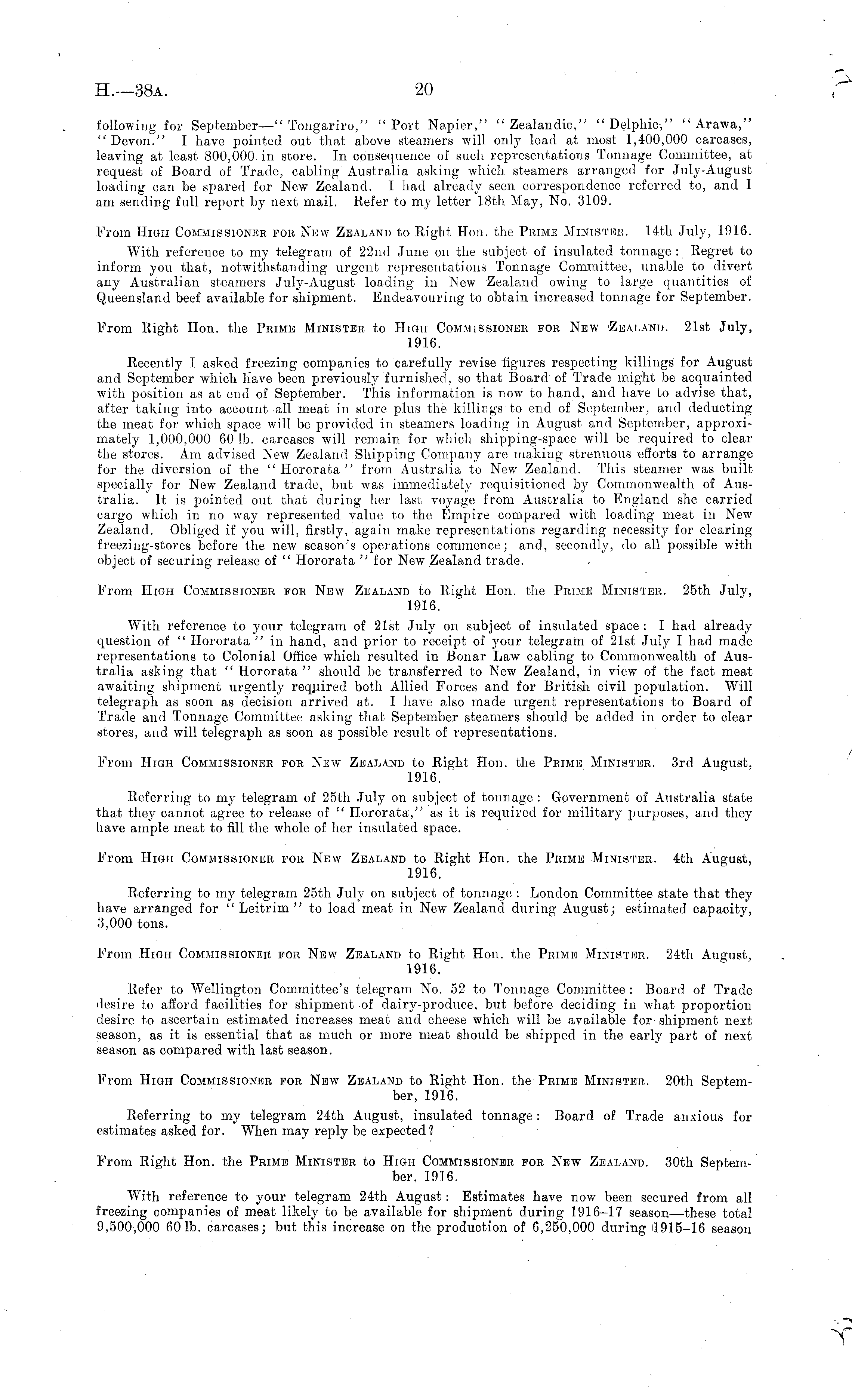 following for September—" Tongariro," "Port Napier," "Zealandic," "Delphic," "Arawa," " Devon." I have pointed out that above steamers will only load at most 1,400,000 carcases, leaving at least 800,000. in store. In consequence of such representations Tonnage Committee, at request of Board of Trade, cabling Australia asking which steamers arranged for July-August loading can be spared for New Zealand. I had already seen correspondence referred to, and 1 am sending full report by next mail. Refer to my letter 18th May, No. 3109. From High Commissioner for New Zealand to Right Hon. the Prime Minister. 14th July, 1916. With reference to my telegram of 22nd June on the subject of insulated tonnage: Regret to inform you that, notwithstanding urgent representations Tonnage Committee, unable to divert any Australian steamers July-August loading in New Zealand owing to large quantities of Queensland beef available for shipment. Endeavouring to obtain increased tonnage for September. From Right Hon. the Prime Minister to High Commissioner for New 'Zealand. 21st July, 1916. Recently I asked freezing companies to carefully revise figures respecting killings for August and September which have been previously furnished, so that Board of Trade might be acquainted with position as at end of September. This information is now to hand, and have to advise that, after taking into account -all meat in store plus the killings to end of September, and deducting the meat for which space will be provided in steamers loading in August and September, approximately 1,000,000 60 Ib. carcases will remain for which shipping-space will be, required to clear the stores. Am advised New Zealand Shipping Company are making strenuous efforts to arrange for the diversion of the "Hororata" from Australia to New Zealand. This steamer was built specially for New Zealand trade, but was immediately requisitioned by Commonwealth of Australia. It is pointed out that during her last voyage from Australia to England she carried cargo which in no way represented value to the Empire compared with loading meat in New Zealand. Obliged if you will, firstly, again make representations regarding necessity for clearing freezing-stores before the new season's operations commence; and, secondly, do all possible with object of securing release of " Hororata " for New Zealand trade. From High Commissioner for New Zealand to Right Hon. the Prime Minister. 25th July, 1916. With reference to your telegram of 21st July on subject of insulated space : I had already question of " Hororata " in hand, and prior to receipt of your telegram of 21st July I had made representations to Colonial Office which resulted in Bonar Law cabling to Commonwealth of Australia asking that " Hororata " should be transferred, to New Zealand, in view of the fact meat awaiting shipment urgently required both Allied Forces and for British civil population. Will telegraph as soon as decision arrived at. I have also made urgent representations to Board of Trade and Tonnage Committee asking that September steamers should be added in order to clear stores, and will telegraph as soon as possible result of representations. From High Commissioner for New Zealand to Right Hon. the Prime Minister. 3rd August, 1916. Referring to my telegram of 25th July on subject of tonnage : Government of Australia state that they cannot agree to release of " Hororata," as it is required for military purposes, and they have ample meat to fill the whole of her insulated space. From High Commissioner for New Zealand to Right Hon. the Prime Minister. 4th August, 1916. Referring to my telegram 25th July on subject of tonnage : London Committee state that they have arranged for " Leitrim " to load meat in New Zealand during August; estimated capacity, 3,000 tons. From High Commissioner for New Zealand to Right Hon. the Prime Minister. 24th August, 1916. Refer to Wellington Committee's telegram No. 52 to Tonnage Committee : Board of Trade desire to afford facilities for shipment of dairy-produce, but before deciding in what proportion desire to ascertain estimated increases meat and cheese which will be available for shipment next season, as it is essential that as much or more meat should be shipped in the early part of next season as compared with last season. From High Commissioner for New Zealand to Right Hon. the Prime Minister. 20th September, 1916. Referring to my telegram 24th August, insulated tonnage : Board of Trade anxious for estimates asked for. When may reply be expected? From Right Hon. the Prime Minister to High Commissioner for New Zealand. 30th September, 1916. With reference to your telegram 24th August : Estimates have now been secured from all freezing companies of meat likely to be available for shipment during 1916-17 season—these total 9,500,000 601b. carcases; but this increase on the production of 6,250,000 during 1915-16 season