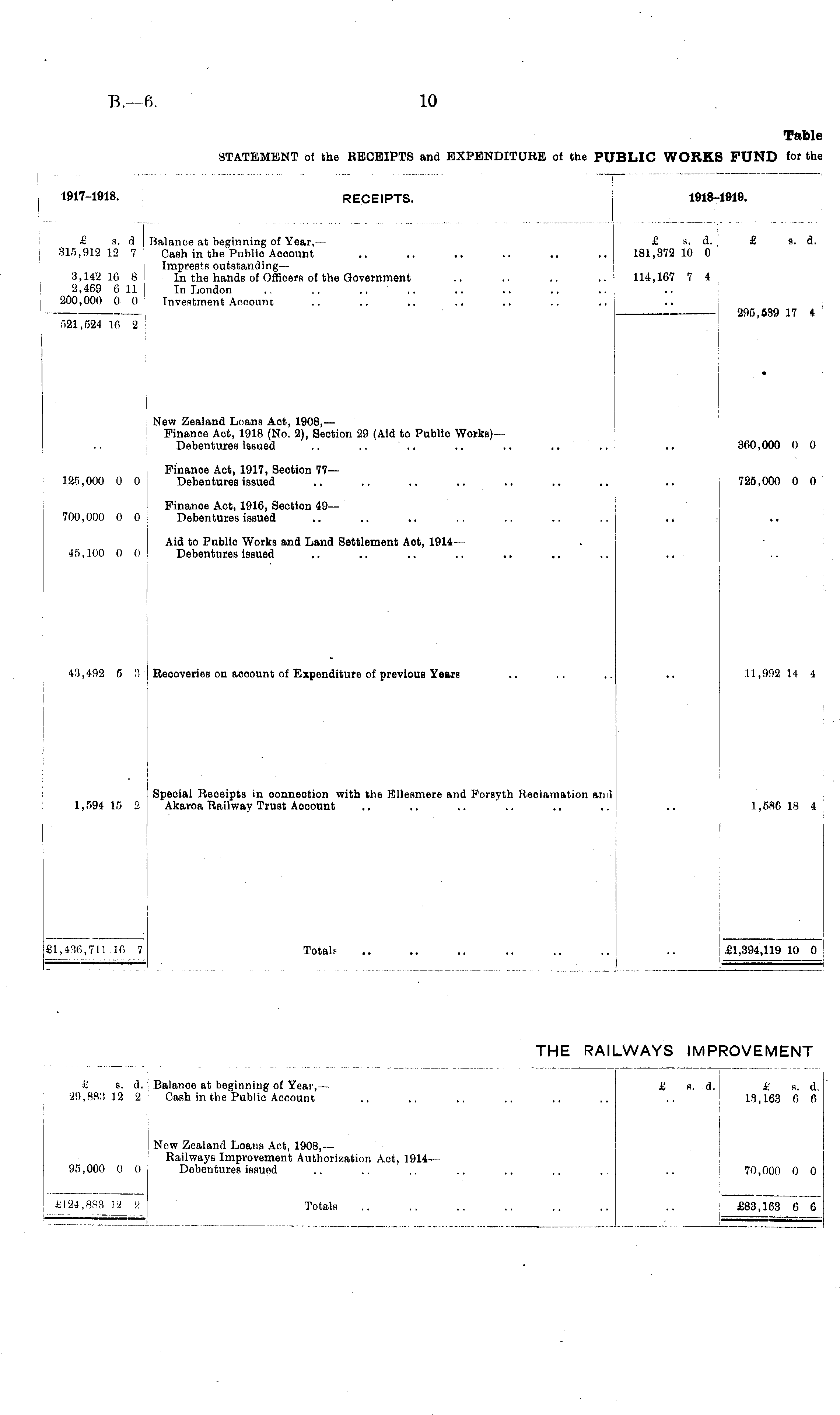 "* ~~ ' I I 1917-1918. RECEIPTS. 1918--1919. £ s. d 315,912 12 7 3,142 16 8 2,469 6 11 200,000 0 0 Balanoe at beginning of Year,— Cash in the Public Aocount Imprests outstanding— In the hands of Officers of the Government In London Investment Account £ a. d. 181,372 10 0 114,167 7 4 £ a. d. 521,524 16 2 295,639 17 4 • New Zealand Loans Aot, 1908, — Finance Aot, 1918 (No. 2), Section 29 (Aid to Publio Works)— Debentures issued .. .. 360,000 0 0 125,000 0 0 Finanoe Act, 1917, Seotion 77— Debentures issued 725,000 0 0 700,000 0 0 Finanoe Act, 1916, Seotion 49— Debentures issued 45,100 0 0 Aid to Publio Works and Land Settlement Aot, 1914--Debentures issued 43,492 6 8 Recoveries on aooount of Expenditure of previous Years 1.1,992 14 4 1,594 18 2 Speoial Receipts in oonneotion with the Elleamere and Forsyth Reclamation and Akaroa Railway Trust Aocount ■ l,58f> 18 4 Totals £1,436,71110 7 £1,394,119 10 0 THE RAIL .WAYS IMPROVEMENT £ s. d. 29,883 12 2 Balance at beginning of Year, — Cash in the Public Account £ a. d. £ a. d. 13,163 fl fl 95,000 0 0 Now Zealand Loans Aot, 1908, — Railways Improvement Authorization Aot, 1914— Debentures issued £124,883 12 2 70,000 0 0 £83,163 6 6 i— ■ Totals