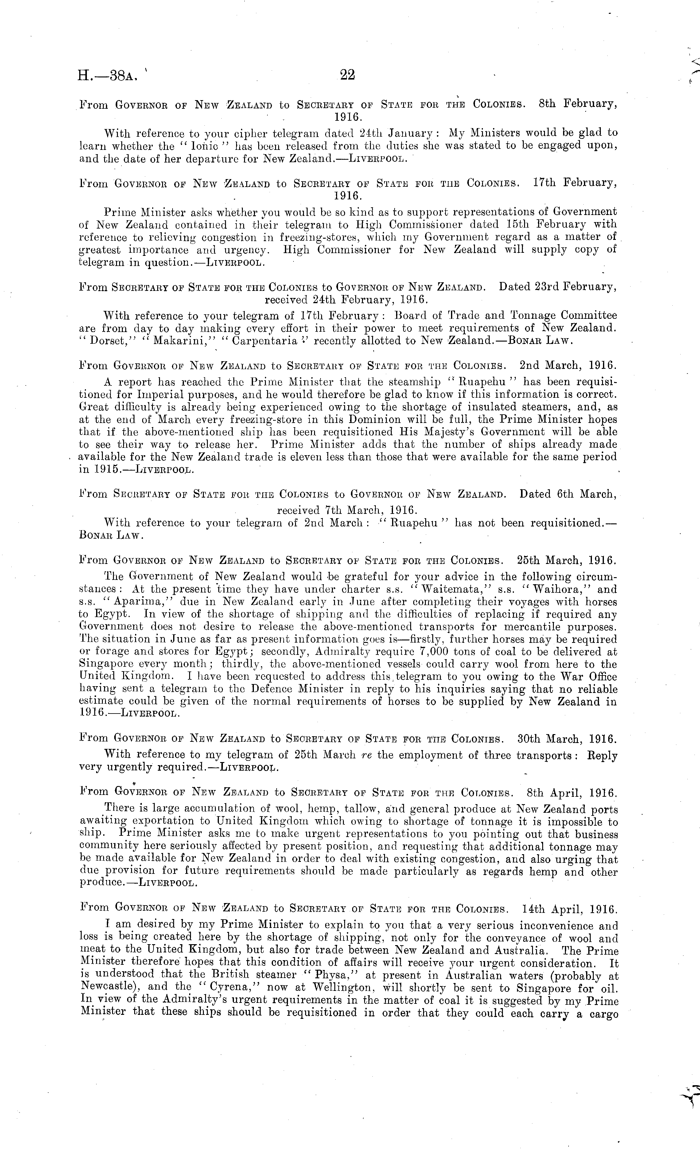 From Governor of New Zealand to Secretary of State for the Colonies. Bth February, ■ . 1916. With reference to your cipher telegram dated 24th January : My Ministers would be glad to learn whether the " lonic " has been released from the duties she was stated to be engaged upon, and the date of her departure for New Zealand. —Liverpool. From Governor of New Zealand to Secretary of State for the Colonies. 17th February, 1916. Prime Minister asks whether you would be so kind as to support representations of Government of New Zealand contained in their telegram to High Commissioner dated 15th February with reference to relieving congestion in freezing-stores, which my Government regard as a matter of greatest importance and urgency. High Commissioner for New Zealand will supply copy of telegram in question.—Liverpool. From Secretary of State for the Colonies to Governor of New Zealand. Dated 23rd February, received 24th February, 1916. With reference to your telegram of 17th February : Board of Trade and Tonnage Committee are from day to day making every effort in their power to meet requirements of New Zealand. " Dorset," " Makarini," " Carpentaria " recently allotted to New Zealand. —Bonar Law. From Governor of New Zealand to Secretary of State for the Colonies. 2nd March, 1916. A report has reached the Prime Minister that the steamship " Ruapehu " has been requisitioned for Imperial purposes, and he would therefore be glad to know if this information is correct. Great difficulty is already being experienced owing to the shortage of insulated steamers, and, as at the end of March every freezing-store in this Dominion will be full, the Prime Minister hopes that if the above-mentioned ship has been requisitioned His Majesty's Government will be able to see their way to release her. Prime Minister adds that the number of ships already made available for the New Zealand trade is eleven less than those that were available for the same period in 1915.—Liverpool. From Secretary of State for the Colonies to Governor of New Zealand. Dated 6th March, received 7th March, 1916. With reference to your telegram of 2nd March : " Ruapehu " has not been requisitioned.— Bonar Law. From Governor of New Zealand to Secretary of State for the Colonies. 25th March, 1916. The Government of New Zealand would be grateful for your advice in the following circumstances : alt the present time they have under charter s.s. " Waitemata," s.s. " Waihora," and s.s. " Aparima," due in New Zealand early in June after completing their voyages with horses to Egypt. In view of the shortage of shipping and the difficulties of replacing if required any Government does not desire to release the above-mentioned transports for mercantile purposes. The situation in June as far as present information goes is—firstly, further horses may be required or forage and stores for Egypt; secondly, Admiralty require 7,000 tons of coal to be delivered at Singapore every month; thirdly, the above-mentioned vessels could carry wool from here to the United Kingdom. I have been requested to address this,telegram to you owing to the War Office having sent a telegram to the Defence Minister in reply to his inquiries saying that no reliable estimate could be given of the normal requirements of horses to be supplied by New Zealand in 1916. —Liverpool . From Governor of New Zealand to Secretary of State for the Colonies. 30th March, 1916. With reference to my telegram of 25th March re the employment of three transports : Reply very urgently required.—Liverpool. From Governor of New Zealand to Secretary of State for the Colonies. Bth April, 1916. There is large accumulation of wool, hemp, tallow, and general produce at New Zealand ports awaiting exportation to United Kingdom which owing to shortage of tonnage it is impossible to ship. Prime Minister asks me to make urgent representations to you pointing out that business community here seriously affected by present position, and requesting that additional tonnage may be made available for N ew Zealand in order to deal with existing congestion, and also urging that due provision for future requirements should be made particularly as regards hemp and other produce.—Liverpool. From Governor of New Zealand to Secretary of State for the Colonies. 14th April, 1916. I am desired by my Prime Minister to explain to you that a very serious inconvenience and loss is being created here by the shortage of shipping, not only for the conveyance of wool aud meat to the United Kingdom, but also for trade between New Zealand and Australia. The Prime Minister therefore hopes that this condition of affairs will receive your urgent consideration. It is understood that the British steamer " Physa," at present in Australian waters (probably at Newcastle), and the " Cyrena," now at Wellington, will shortly be sent to Singapore for oil. In view of the Admiralty's urgent requirements in the matter of coal it is suggested by my Prime Minister that these ships should be requisitioned in order that they could each carry a cargo