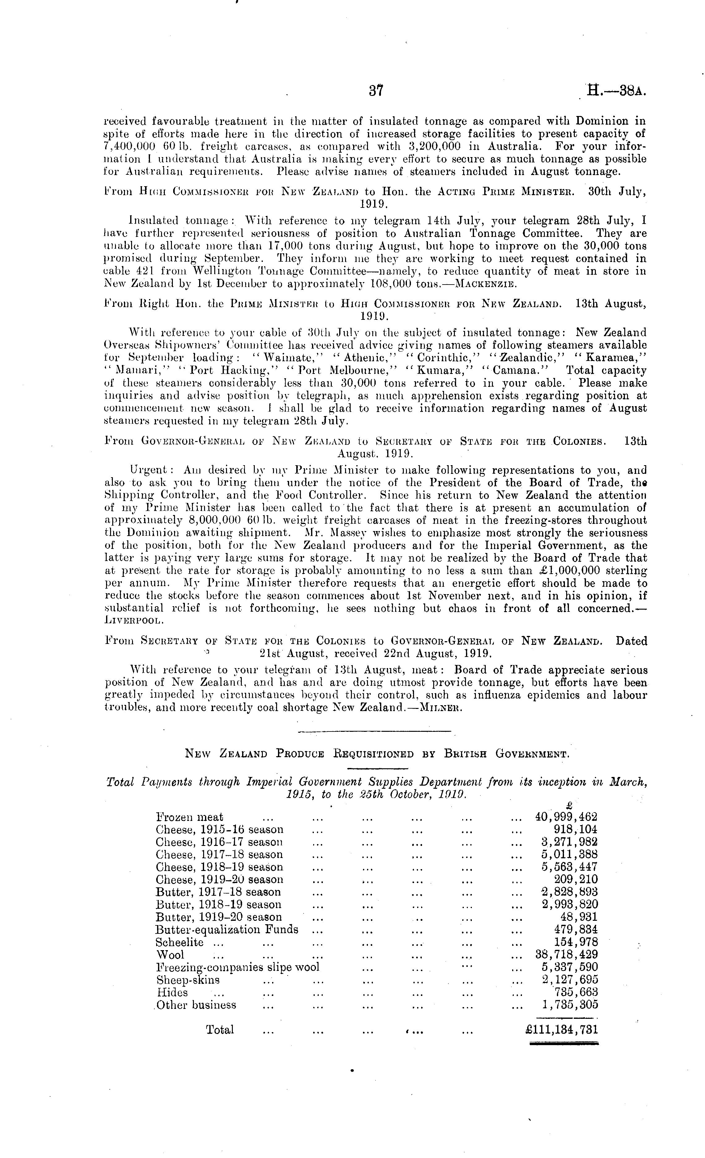 received favourable treatment in the matter of insulated tonnage as compared with Dominion in spite of efforts made here in the direction of increased storage facilities to present capacity of 7,400,000 60 lb. freight carcases, as compared with 3,200,000 in Australia. For your information I. understand that Australia is making every effort to secure as much tonnage as possible for Australian requirements. Please advise names of steamers included in August tonnage. From High Commissioner for New Zealand to Hon. the Acting Prime Minister. 30th July, 1919. Insulated tonnage: With reference to my telegram 14th July, your telegram 28th July, I have further represented seriousness of position to Australian Tonnage Committee. They are unable to allocate more than 17,000 tons during August, but hope to improve on the 30,000 tons promised during September. They inform me they are working to meet request contained in cable 421 from Wellington Tonnage Committee—namely, to reduce, quantity of meat in store in New r Zealand by Ist December to approximately 108,000 tons. —Mackenzie. From Right Hon. the Prime Minister to High Commissioner for New Zealand. 13th August, 1919. With reference to your cable of 30th July on the subject of insulated tonnage: New Zealand Overseas Shipowners' Committee has received advice giving names of following steamers available tor September loading: "Waimate," "Athenic," " Corinthic," "Zealandic," "Karamea," " Mamari," "Port Hacking," " Porl Melbourne," "Kumara," " Caniana." Total capacity of these steamers considerably less than 30,000 tons referred to in your cable. Please make inquiries and advise position by telegraph, as much apprehension exists regarding position at commencement new season. I shall be glad to receive information regarding names of August steamers requested in my telegram 28th July. From Governor-General of New Zealand to Secretary of State for the Colonies. 13th August. 1919. Urgent : Am desired by my Prime Minister to make following representations to you, and also to ask you to bring them under the notice of the President of the Board of Trade, th« Shipping Controller, and the Food Controller. Since his return to New Zealand the attention of my Prime Minister has been called to the fact that there is at present an accumulation of approximately 8,000,000 60 Ib. weight freight, carcases of meat in the freezing-stores throughout the Dominion awaiting shipment. Mr. Massey wishes to emphasize most strongly the seriousness of the position, both for the New Zealand producers and for the Imperial Government, as the latter is paying very large sums for storage. It may not be realized by the Board of Trade that at present the rate for storage is probably amounting to no less a sum than £1,000,000 sterling per annum. My Prime Minister therefore requests that an energetic effort should be made to reduce the stocks before the season commences about Ist November next, and in his opinion, if substantial relief is not forthcoming, he sees nothing but chaos in front of all concerned.— Liverpool. From Secretary of State for the Colonies to Governor-General of New Zealand. Dated 21st August, received 22nd August, 1919. With reference to your telegram of 13th August, meat : Board of Trade appreciate serious position of New Zealand, and has and are doing utmost provide tonnage, but efforts have been greatly impeded by circumstances beyond their control, such as influenza epidemics and labour troubles, and more recently coal shortage New Zealand.—Milner.