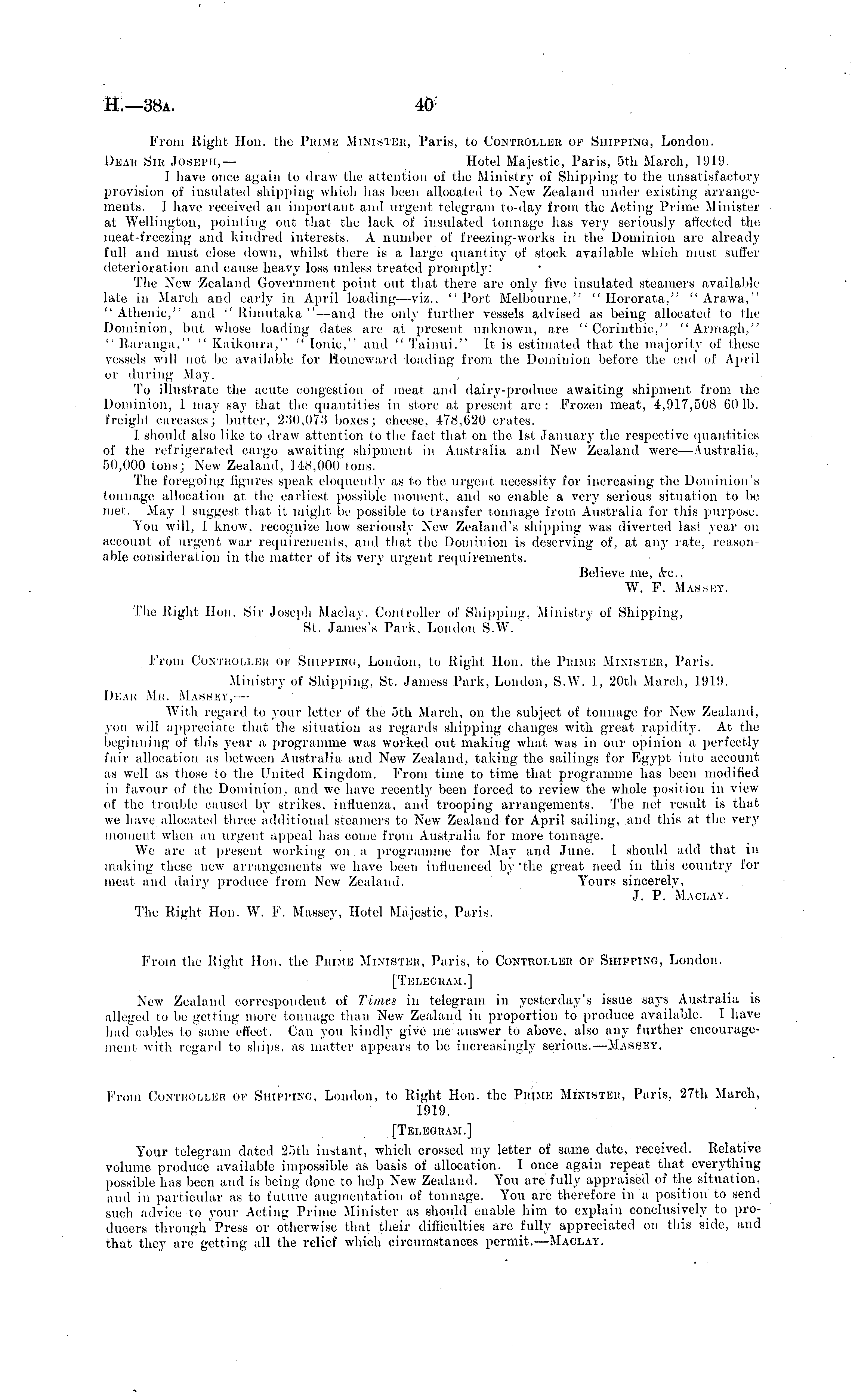 From Right Hon. the Prime Minister, Paris, to Controller of Shipping, London. Dear Sir Joseph,— Hotel Majestic, Paris, sth March, 1919. I have once again to draw the attention of the Ministry of Shipping to the unsatisfactory provision of insulated shipping which has been allocated to New Zealand under existing arrangements. I have received an important and urgent telegram to-day from the Acting Prime Minister at Wellington, pointing out that the lack of insulated tonnage has vei'3 r seriously affected the meat-freezing and kindred interests. A number of freezing-works in the Dominion arc already full and must close down, whilst there is a large quantity of stock available which must suffer deterioration and cause heavy loss unless treated promptly: The New Zealand Government point out that there are only five insulated steamers available late in March and early in April loading—viz., "Port Melbourne," "Hororata," "Arawa," "Athenic," and "Rimutaka"—and the only further vessels advised as being allocated to the Dominion, but, whose loading dates are at present unknown, are " Corinthic," "Armagh," " Raranga," " Kaikoura," " lonic," and " Tainui." It is estimated that the majority of these vessels will not be available for Homeward loading from the Dominion before the end of April or during May. To illustrate the acute congestion of meat and dairy-produce awaiting shipment from the Dominion, 1 may say that the quantities in store at present are: Frozen meat, 4,917,508 601b. freight carcases; butter, 230,073 boxes; cheese, 478,620 crates. I should also like to draw attention to the fact that on the Ist January the respective quantities of the refrigerated cargo awaiting shipment in Australia and New Zealand were—Australia, 50,000 tons; New Zealand, 148,000 tons. The foregoing figures speak eloquently as to the urgent necessity for increasing the Dominion's tonnage allocation at the earliest possible moment, and so enable a very serious situation to be met. May I suggest, that it might be possible to transfer tonnage from Australia for this purpose. You will, I know, recognize how seriously New Zealand's shipping was diverted last year on account of urgent war requirements, and that the Dominion is deserving of, at any rate, reasonable consideration in the matter of its very urgent requirements. Believe me, &C, W. F. Massey. The Right Hon. Sir Joseph Maclay, Controller of Shipping. Ministry of Shipping, St. James's Park, London S.W. From Controller of Shipping, London, to Right Hon. the Prime Minister, Paris. Ministry of Shipping, St. Jamess Park, London, S.W. 1, 20th March, 1919. Dear Mr. Massey,— With regard to your letter of the sth March, on the subject of tonnage for New Zealand, you will appreciate that the situation as regards shipping changes with great rapidity. At the beginning of this year a programme was worked out making what was in our opinion a perfectly fair allocation as between Australia and New Zealand, taking the sailings for Egypt into account as well as those to the United Kingdom. From time to time that programme has been modified in favour of the Dominion, and we have recently been forced to review the whole position in view of the trouble caused by strikes, influenza, and trooping arrangements. The net result is that we have allocated three additional steamers to New Zealand for April sailing, and this at the very moment when an urgent appeal has come from Australia for more tonnage. We are at present working on a programme for May and June. I should add that in making these new arrangements we have been influenced by'the great need in this country for meat and dairy produce from New Zealand. Yours sincerely, J. P. Maclay, The Right Hon. W. F. Massey, Hotel Majestic, Paris. From the Right Hon. the Prime Minister, Paris, to Controller of Shipping, London. [Telegram.] New Zealand correspondent of Times in telegram in yesterday's issue says Australia is alleged to be getting more tonnage than New Zealand in proportion to produce available. I have had cables to same effect. Can you kindly give me answer to above, also any further encouragement with regard to ships, as matter appears to be increasingly serious.—Massey. From Controller of Shipping, London, to Right Hon. the Prime Minister, Paris, 27th March, 1919. [Telegram.] Your telegram dated 25th instant, which crossed my letter of same date, received. Relative volume produce available impossible as basis of allocation. I once again repeat that everything possible has been and is being done to help New Zealand. You are fully appraised of the situation, and in particular as to future augmentation of tonnage. You are therefore in a position to send such advice to your Acting Prime Minister as should enable him to explain conclusively to producers through Press or otherwise that their difficulties arc fully appreciated on this side, and that they are getting all the relief which circumstances permit.—Maclay.