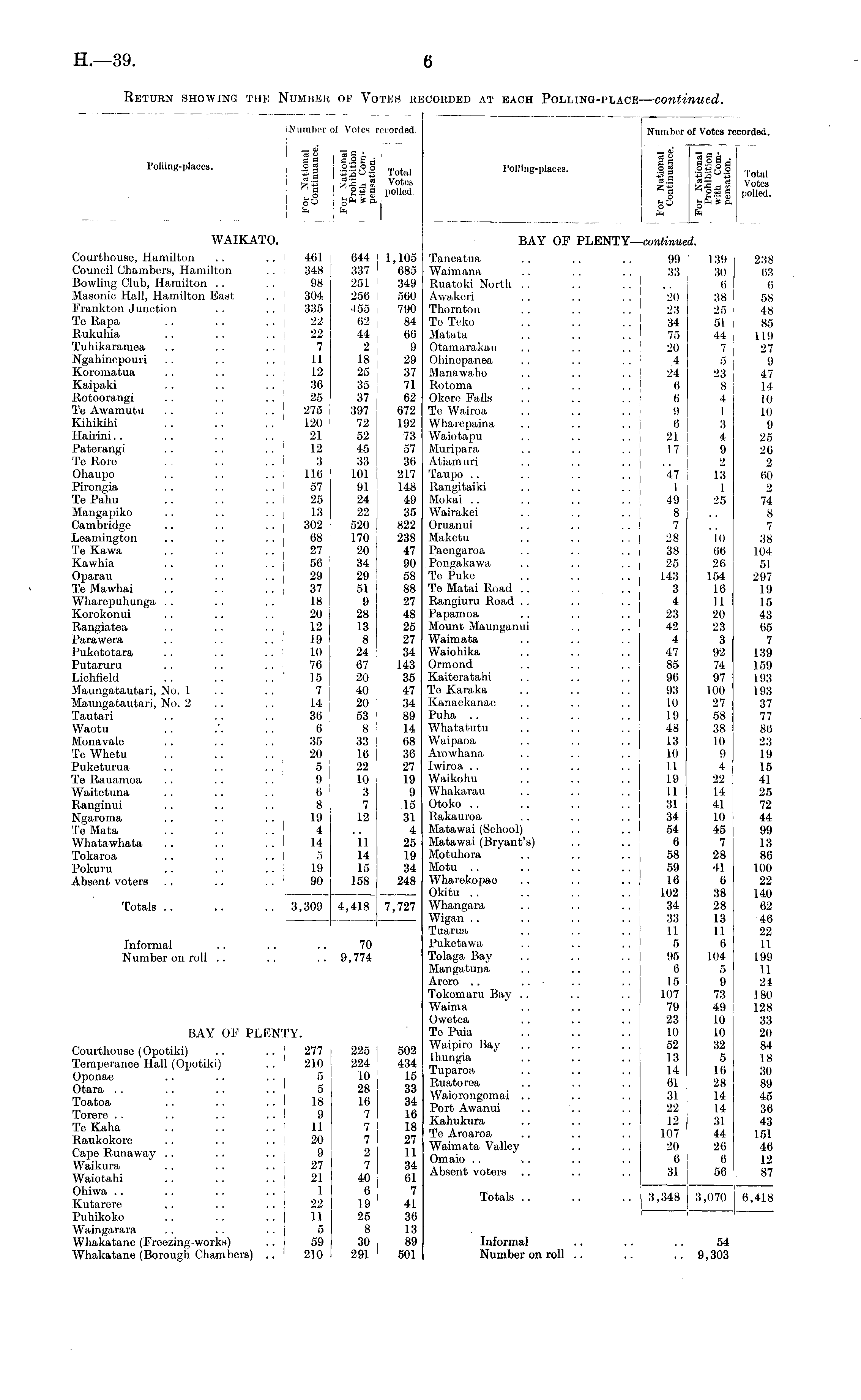Number of Votes recorded Number of Votes recorded. Pollmg-plaees. .2 | |||| Tota | SS S 3 - % Votes *§ r '22 g polled go gMS ft Eh Eh Polling-places. Ii iliaSi IPl Total SS S'~„f Votes 15 g polled. go gSiso, Eh Eh WAIKATO. BAY OF PLENTY continued. Courthouse, Hamilton . . .. I 461 644 ! 1,105 Council Chambers, Hamilton .. 348 337 685 Bowling Club, Hamilton .. .. 98 251 349 Masonic Hall, Hamilton East .. 304 256 560 Frankton Junction . . .. I 335 455 790 Te Rapa .. .. . . 22 62 , 84 Rukuhia .. . . . . 22 44 , 66 Tuhikaramea .. .. .. 7 2 9 Ngahinepouri .. .. .. 11 18 29 Koromatua .. .. .. 12 25 I 37 Kaipaki . . .. .. 36 35 J 71 Rotoorangi .. .. .. 25 37 i 62 TeAwamutu .. .. .. 275 397 672 Kihikihi .. .. .. 120 72 192 Hairini.. .. . . .. 21 52 73 Paterangi .. . . .. 12 45 57 Te Roro . . .. 3 33 36 Ohaupo .. . . .. 116 101 217 Pirongia .. ... .. 57 91 148 Te Pahu .. .. .. 25 24 49 Mangapiko .. . . .. 13 22 35 Cambridge .. . . . . j 302 520 | 822 Leamington .. . . .. 68 170 238 Te Kawa . . . . ... 27 20 47 Kawhia . . . . .. 56 34 90 Oparau . . . . . . 29 29 58 TeMawhai .. .. .. 37 51 88 Wharepuhunga .. .. .. 18 9 27 Korokonui .. .. .. 20 28 48 Rangiatea . . . . . . 12 13 25 Parawera .... .. 19 8 27 Puketotara . . . . .. 10 24 34 Putaruru .. . . .. 76 67 143 Lichfield . . . . . . r 15 20 35 Maungatautari, No. 1 . . .. 7 40 47 Maungatautari, No. 2 .. .'. 14 20 34 Tautari .. .. . . 36 53 89 Waotu .. .'. .. 6 8 14 Monavale .. . . . . 35 33 68 Te Whetu . . . . .. 20 16 36 Puketurua .. .. .. 5 22 27 Te Rauamoa . . .. .. 9 10 19 Waitetuna .. .. .. 6 3 9 Ranginui . . .. .. 8 7 15 Ngaroma .. .. .. 19 12 31 Te Mata .. .. .. 4 .. 4 Whatawhata .. .. .. 14 11 25 Tokaroa .. .. .. 5 14 19 Pokuru .. .. .. 19 15 34 Absent voters .. .. .. 90 158 248 Taneatua Waimana Ruatoki North Awakeri Thornton To Tcko Matata Otamarakau Ohinepanea Manawaho Rotoma Okere Falls Te Wairoa Wharepaina Waiotapu Muripara Atiam uri Taupo Rangitaiki Mokai Wairakei Oruanui .. Maketu Paengaroa Pongakawa To Puke Te Matai Road .. Rangiuru Road Papamoa Mount Maunganui Waimata Waiohika Ormond Kaiteratahi Te Karaka Kanaekanae Puha Whatatutu Waipaoa Arowhana Iwiroa Waikohu Whakarau Otoko Rakauroa Matawai (School) Matawai (Bryant's) Motuhora Motu Wharekopao Okitu Whangara Wigan Tuarua Pukctawa Tolaga Bay Mangatuna Aroro .. Tokomaru Bay Waima Owetea Te Puia Waipiro Bay Ihungia Tuparoa Ruatorea Waiorongomai Port Awanui Kahukura Te Aroaroa Waimata Valley Omaio Absent voters 99 139 238 33 30 63 6 6 20 38 58 23 25 48 34 51 85 75 44 119 20 7 27 .4 5 9 24 23 47 6 8 14 6 4 10 9 I 10 6 3 9 21 4 25 17 9 26 2 2 47 13 60 I 1 2 49 25 74 8 .. 8 7 .. 7 28 10 38 38 66 104 25 26 51 143 154 297 3 16 19 4 11 15 23 20 43 42 23 65 4 3 7 47 92 139 85 74 159 96 97 193 93 100 193 10 27 37 19 58 77 48 38 86 13 10 23 10 9 19 11 4 15 19 22 41 11 14 25 31 41 72 34 10 44 54 45 99 6 7 13 58 28 86 59 41 100 16 6 22 102 38 140 34 28 62 33 13 46 11 II 22 5 6 11 95 104 199 6 5 II 15 9 24 107 73 180 79 49 128 23 10 33 10 10 20 52 32 84 13 5 18 14 16 30 61 28 89 31 14 45 22 14 36 12 31 43 107 44 151 20 26 46 6 6 12 31 56 . 87 Totals .. .. .. ! 3,309 4,418 7,727 Informal . . .. .. 70 Number on roll .. .. .. 9,774 BAY OF PLENTY. Courthouse (Opotiki) .. .. I 277 225 502 Temperance Hall (Opotiki) .. 210 224 434 Oponae .. .. .. 5 10 15 Otara .. . . .. .. 5 28 33 Toatoa .. .. .. 18 16 34 Torere .. . . .. .. 9 7 16 TeKaha .. .. .. 11 7 18 Raukokoro .. . . .. 20 7 27 Cape Runaway .. . . .. 9 2 11 Waikura .. .. .. 27 7 34 Waiotahi .. .. .. 21 40 61 Ohiwa . . .. . . .. 1 6 7 Kutarere .. .. .. 22 19 41 Puhikoko .. .. .. 11 25 36 Waingarara . . .. .. 5 8 13 Whakatane (Freezing-works) .. 59 30 89 Whakatane (Borough Chambers) .. 210 291 501 Totals 3,348 3,070 6,418 Informal Number on roll 54 9,303