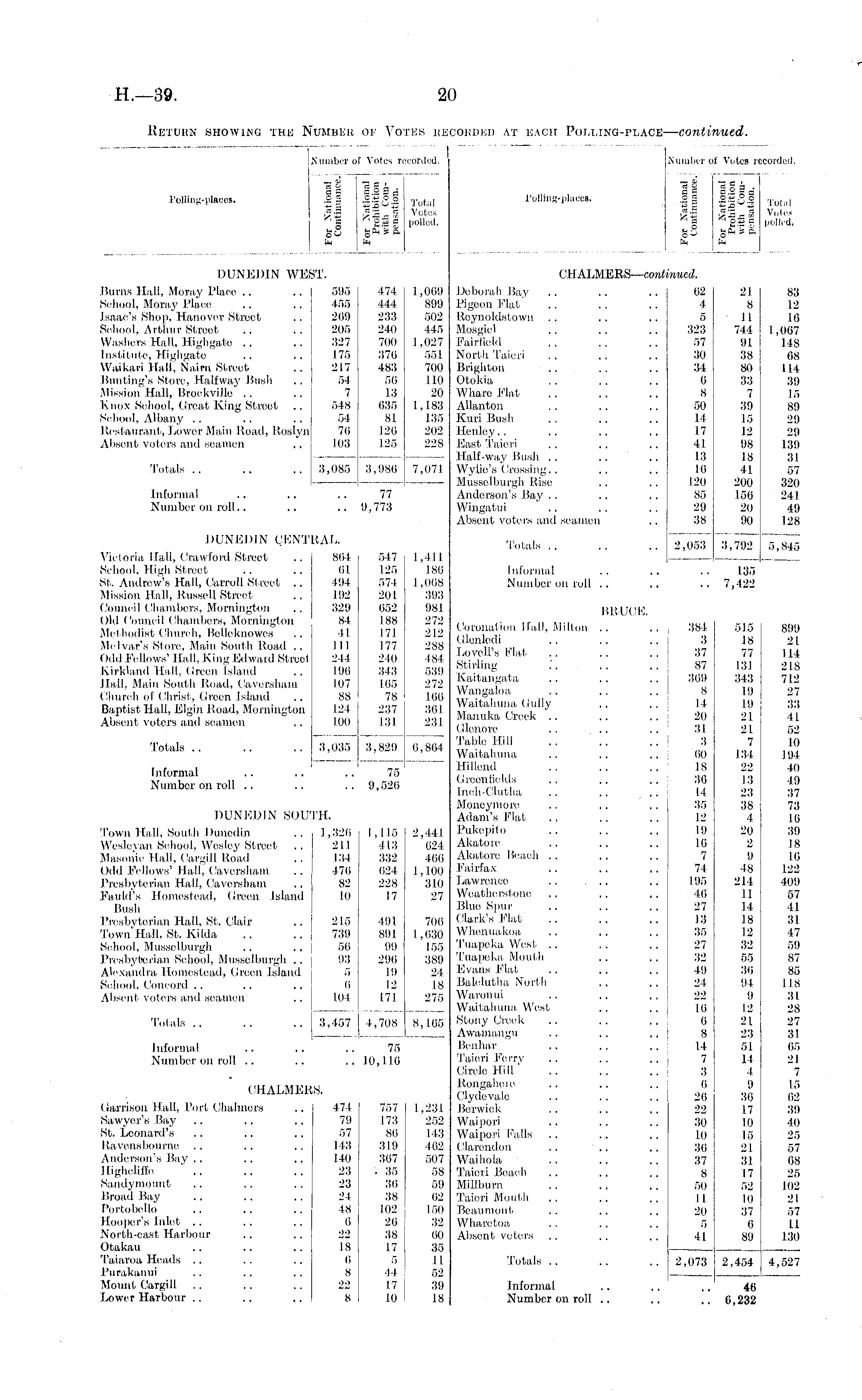 Number of Votes recorded. et-orded. .Number of Votes re ecorded. Pol„n,p,ace, I || 5 | Total *f *fflg polled. Total Votes polled. Polling-places. Eh Eh 'fol nl Voles polled. DUNEDIN WEST. 1 ,069 899 502 445 1,027 551 700 110 20 1,183 135 202 228 CHALMERS— conli '.inued. Burns Hall, Moray Place .. .. 595 474 1,069 School, Moray Place .. .. 455 4 14 899 Isaac's Shop. Hanover Street .. 269 233 502 School, Arthur Street .. .. 205 240 445 Washers Hall, Highgate .. .. 327 700 1,027 Institute, Highgate .. .. 175 370 551 Waikari Hall, Nairn Street .. 217 483 700 Bunting's Store, Halfway Bush .. 54 50 110 Mission Hall, Brockville .. .. 7 13 20 Knox School, Croat King Street .. 548 635 1,183 School, Albany .. .. .. 54 81 135 Restaurant, Lower Main Road, Roslyn 76 126 202 Absent voters and seamen .. 103 125 228 Deborah BayPigeon Flat Reynoldstown Mosgicl Fairfield North Taieri Brighton Otokia Whare Flat AUanton Kuri Bush Henley.. East Taieri Half-way Bush Wylie's Crossing.. Musselburgh Pise Anderson's Bay Wingatui Absent voters and seamen 62 21 4 8 5 11 323 744 57 91 30 38 34 80 6 33 8 7 50 30 II 15 17 12 II 98 13 18 16 41 120 200 85 156 29 20 38 90 83 12 16 1,067 148 68 114 39 15 89 29 29 139 31 57 320 241 49 128 Totals .. .. .. 3,085 3,986 7,071 7,071 Informal .. .. .. 77 Number on roll.. .. .. 9,773 DUNEDIN CENTRAL. Totals 2,053 3,792 5,845 Victoria Hall, Crawford Street .. 864 547 1,411 School. High Street .. .. 61. 125 186 St. Andrew's Hall, Carroll Street .. 494 574 1,068 Mission Hall, Russell Street .. 192 201 393 Council Chambers, Mornington .. 329 652 981 Old Council Chambers, Mornington 84 188 272 Methodist Church, Bclleknowes .. II 171 212 Me I car's SI ore. Main South Road .. Ill 177 288 Odd Fellows' Hall, King Edward Street 211 210 484 Kirkland Hall, Green Island .. 196 343 539 lla.ll. Main South Road, Caversham 107 165 272 Church of Christ, Green Hand .. 88 78 166 Baptist Hall, Elgin Road, Mornington 121 237 361 Absont voters and seamen .. loo 131 231 Informal Number on roll BRUCE. Coronation Hall, Milton Glonledi Lovoll's Flat Stirling Kaitangata Wangaloa Waitahuna Gully Manuka Creek ,. Glenore Table Hill Waitahuna, Hillend Greenfields Inch-Clutha . . . . Moneymore Adam's Flat Pukepito Akaloic Akalorc Beach If airfax Lawrence .. Weatherstono Blue Spur (lark's Flat Whenuakoa Tuapoka West Tuapeka Mouth Evans Flat Balclutha North Waronui Waitahuna, West Stony Creek Awamangu Bcnhar Taieri Ferry Circle Hill' Rongahcre Clvdevale Berwick Waipori Waipori Palls .. Clarendon .. Waihola Taieri Beach Milll.urii Taieri Mouth Beaumont Wharetoa Absent voters 135 .. 7,422 381. 515 3 18 37 77 87 131 369 343 8 19 11 19 20 21 31 21 3 7 60 134 18 22 36 13 14 23 35 38 12 4 19 20 16 2 7 9 74 IS 195 21 I 46 II. 27 14 13 18 35 12 27 32 32 55 49 36 24 91 22 9 16 12 6 21 8 23 14 51 7 14 3 4 6 9 26 36 22 17 30 10 10 15 36 21 37 31 8 17 50 52 11 10 20 37 5 6 41 89 899 21 1II 218 712 27 33 41. 52 10 194 40 4.9 37 73 16 39 18 16 122 109 57 41 31 47 59 87 85 118 31 28 27 31 65 21 7 1.5 62 39 -10 25 57 68 25 102 21 57 ll 130 Totals .. .. .. 3,035 3,829 6,864 Informal . . .. .. 75 Number on roll .. .. .. 9,526 DUNEDIN SOUTH. ■Town Hall, South Dunedin .. 1,326 1,115 2,441 Wcslcv an School. Wesley Street .. 211 413 624 Masonic Hall, Cargill Road .. 131 332 466 Odd Fellows' Hall, Caversham .. 476 624 1,100 Presbyterian Hall, Caversham .. 82 228 310 Fauld's Homestead. Green Island 10 17 27 Bush Presbyterian Hall, St. Clair .. 215 491 706 Town Hall, St. Kilda .. .. 739 891 1,630 School, Musselburgh .. .. j 56 99 155 Presbyterian School, Musselburgh .. | 93 296 389 Alexandra Homestead, Crec.n Island 5 19 24 School, Concord . . . . . . 6 12 18 Absent voters and seamen .. 104 171 275 Totals .. .. .. 3,457 4,708 8,165 Informal .. .. .. 75 Number on roll .. .. .. 10,116 CHALMERS. Garrison Hall, Port Chalmers .. 474 757 1,231 Sawyer's Bay .. .. .. 79 173 252 St. Leonard's .. .. .. 57 86 143 Ravonsbourne .. .. .. 113 319 462 Anderson's Bav . . .. .. 140 367 507 Highcliffe .. .. .. 23 35 58 Sandymount .. .. . . 23 36 59 Broad Bay .. .. .. 24 38 62 Portobello .. .. .. 48 102 150 Hooper's Inlet .. .. .. 6 26 32 North-cast Harbour .. .. 22 38 60 Otakau .. .. .. 18 17 | 35 Taiaroa Heads . . .. .. 6 5 1 11 Purakanui .. .. .. 8 44 52 Mount Cargill . . .. 22 17 j 39 Lower Harbour .. .. .. 8 10 18 Totals 2,073 2,454 2,073 2,454 4,527 4,527 Informal Number on roll 46 .. 6,232 46 6,232