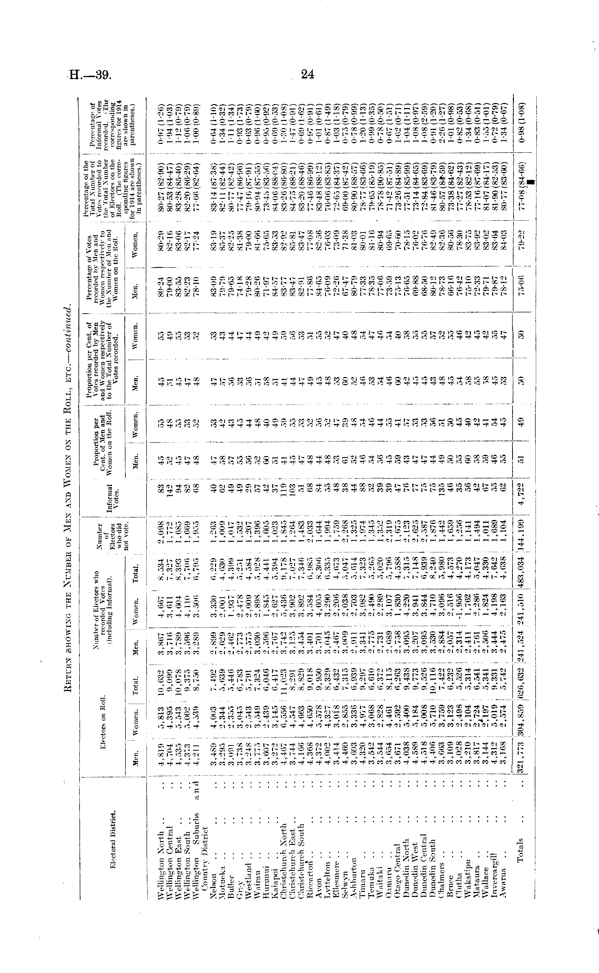 Electoral District. I Electors on Roll. Number of Electors who recorded Votes (including Informal). [en. Women. Total. Proportion per Cent, of ! Percentage of Votes l '? "J™y ?'"'? I *,„ „.„*,„ , „ , Proportion per Votes recorded bv Men recorded l,v Men and al ; N '"» °* *»™'»«? v '' of »—*■ Cent, of Men P and and Women respectively Women respectively to KoESlumbei \SSSl <T& Electors I *°™ a, Women on the Roll. to the Total Xumter of too Xumberof Men and -° K ,° tors on the Sirre ponding who did otes - Votes recorded. Women on the Roll. Ko|| (xhe corns- figures for 1914 — not vote. ■ ' '— ■ ~~— ~— — —— — sponding figures are shown in Men. Women. Men. Women. Men. Women. P"™" 10868 ' 1 - Men. Women. I Total. Men. Women. Total. Men. Women. ! I Wellington North .. Wellington Central Wellington East Wellington South .. Wellington Suburbs Country District Nelson Motueka Boiler Grey West land Wairau . . ... Hurunui Kaiapoi Christchurch North Christchurch East .. Christchurch South Ricearton Avon Lvttelton .. Ellesmere .. Sehvyn Ashburton Timaru Temuka .. Waitaki Oamaru Otago Central Dunedin North Dunedin West Dunedin Central Dunedin South Chalmers Bruce Clutha Wakatipu Mataura Wallace Invercargill A wa rua. Totals ! I I 4,819 5,813 10,632; 3.867 4,667 8.534 2.098 4,704 4.395 9,099 3,716 3,611 7.327 1.772 4,535 5,543 10,07S 3.789 4,604 8.393 1.685] .. ! 4,373 5,002 9,375 3.596 4.110 7,706, 1.669 ' and j 4,211 4,539 8,750 3,289 3.500 6.795 1,955 3,489 4,003 7.492: 2,899 3.330 6,229 1.263 3,295 2.344 5,639 2.629 2.001 : 4,630 1.009 3.001 2.355 5,446 2.462 1,937 4.399 1.047 3,738 3.045 6.783 2.773 2.478 5.251 1.532; 3.248 2.543 5,791 2.575 2.009 4.584 1.207 3,775 3,549 7,324 3,03m 2,898 5,928, 1,396 3,607 2.439 6,046 2.596; ],845 4.441 1,605: 3,272 3,145 6.417 2,767 2,627 5.394 1,023 4,467 6,556 11,023 I 3,742 5.436] 9,178 1,845 3,744 4,547 8,291: 3.125 3,902! 7.027 1,264 4.166 4,663 8.829; 3.454 3.892: 7,340 1,483 .. ! 4,368 4.650' 9.018 3.401 3.584 6.985 2,033 .. I 4,372 5,578: 9,950 3.701 4.605 8,306 1,644 .. i 4.002 4.327 8,329 3.045 3.290 6.335 1,994 3.414 3,018 0.432 2.467 2,206 4.673 1.759 .. I 4,460 2.855 ! 7,315 1 3.009 I 2,038 5,047 i 2,268 3.603 3,336! 6,939 2,911 ! 2,703 5.614! 1,325 4,320 4.977 ! 9,297 3,341 3,982 7,323 ! 1,974 3,542 3,068 6.610 2.775 2,490 5.205 1,345 3,544' 2,828 6.372 2.731 2.289 5,020 1.352 3,654 4,461 8,115 2.689 3,107 5.796 2,319 3,671 2,592 6,263 2.758 1,830 4,588 j 1,675 4,038 5.400 9.43S : 3,095 4.220 7,315! 2.123 4,589' 5,184 9,773 3,207 I 3,941 7,148 2,625 4,518 5,008 9,526 : 3,095 | 3.844 6,939' 2,587 4,406 5,710 : 10.116 : 3,530 4.710 8,240, 1,876 3,663 3,759 7.422! 2,884: 3,096 5,980 ! 1,442 3,109 3,123 6,232 ; 2,057! 2.516 4.573 1,659 3,028 2,498. 5,526! 2,314; -1,956 4,270 1,256 3,210 2,104 5,314 2.411 1.762 4.173 1,141 3,817 2.724 6.541 2.761 , 2,286 5,047 1,494 3,144 2,197 5,341 2.506; 1,824 4,330 1,011 4.312 5.019 , 9,331 : 3,444 4,198 7.642 : 1,689 3,168 2,574; 5.742 2,475 2.163 4.638 1,104 .. [321,773 304,859 1626,632 241,524 241.510 483,034 144.199 83 142! 94 S2 ; 68 40 62 49 49 29 57 42 119 ! 103 ; 51 : 68 84 55 ; 48 I 38 44 88 i 52 39 39 47 76 77 75 75 135 46 35 56 42 67 55 62 4,722 45 52 45 47 48 47 58 57 55 56 52 60 51 41 45 47 48 44 48 61 52 46 54 56 45 59 43 47 47 44 49 50 oo 60 58 59 40 55 51 55 48 oo 53 52 53 42 43 45 44 48 40 49 59 55 53 52 56 52 47 39 48 54 46 44 55 41 57 53 53 56 51 50 45 40 42 41 54 45 49 , 45 51 45 47 48 47 57 56 53 56 51 58 51 41 44 47 49 45 48 53 60 52 46 53 .54 46 60 42 45 45 43 48 45 54 58 55 58 45 53 50 oo 49 55 53 52 53 43 44 47 44 49 42 49 59 56 53 51 55 52 47 40 48 54 47 46 .54 40 58 55 55 57 52 55 46 42 45 42 55 47 50 80-24 79-00 83-55 82-23 78-10 83-09 711-79 79-65 74-18 79-28 80-26 71-97 84-57 83-77 83-47 82-91 77-86 84-65 76-09 72-20 67-47 80-79 77-33 78-35 77-06 73-59 75-13 76-65 69-88 68-50 80-12 78-73 66-16 76-42 75-10 72-33 79-71 79-87 78-12 75-06 80-29 80-27 (82-90) 0-97(1-26) 82-16 80-53(84-47) | 1-94(1-03) 83-06 : 83-28(85-40) : 112(0-79) 82-17 82-20(86-29) I 1-06(0-79) 77-24 77-66(82-64) , 1-00(0-89) 83-19 | 83-14(87-38) i 0-64(1-10) 85-37 82-11(82-44) 1-34(0-32) 82-25 80-77(82-42) 1-11(1-34) 81-38 77-47(86-96) 0-93(1-73) 79-00 79-16(87-91) 0-63(0-79) 81-66 80-94(87-55) ; 0-90(1-60) 75-65 73-15(83-56) : 0-95(0-92) 83-53 84-06(88-04) ; 0-69(0-53) 82-92 83-26(86-80) j 1-30(1-08) 85-81 84-75(88-21) j 1-47(0-91) 83-47 83-20(88-46) j 0-69(1-62) 77-08 77-46(86-99) I 0-97(0-91) 82-56 83-48(88-12) ! 1-01(0-61) 76-03 76-06(83-85) 0-87(1-49) 73-69 72-65(84-37) 1-03(1-18) 71-38 69-00(87-42) 0-75(0-79) 81-03 80-90(88-57) 0-78(0-99) 80-01 78-77(83-66) 1-20(1-13) 81-16 79-65(85-19) 0-99(0-35) 80-94 ' 78-78(90-85) 0-78(0-50) 69-65 71-42(87-51) 0-67(1-51) 70-60 - 73-26 (84-89) 1-02 (0-71) 78-15 77-51(85-99) 1-04(1-11) 76-02 73-14(84-65) 1-08(0-971 76-76 72-84(83-69) 1-08(2-59) 82-49 81-46 (83-79) 0-91(1-20) 82-36 80-57(84-59) 2-26 (1-27) 80-56 73-38(84-62) 1-01(0-98) 78-30 '■ 77-27(82-43) 0-82(0-53) 83-75 78-53(82-12) 1-34(0-68) 83-92 77-16(87-69) 0-83(0-51) 83-02 81-07(84-17) 1-55(1-01) 83-64 81-90(82-53) 0-72(0-79) S4-03 80-77(83-60) 1-34(0-67) 79-22 77-08(84-66) 0-98(1-08) 483.034 144,199 i 4,722 51 49 50 50 0-98(1-08) 1 i