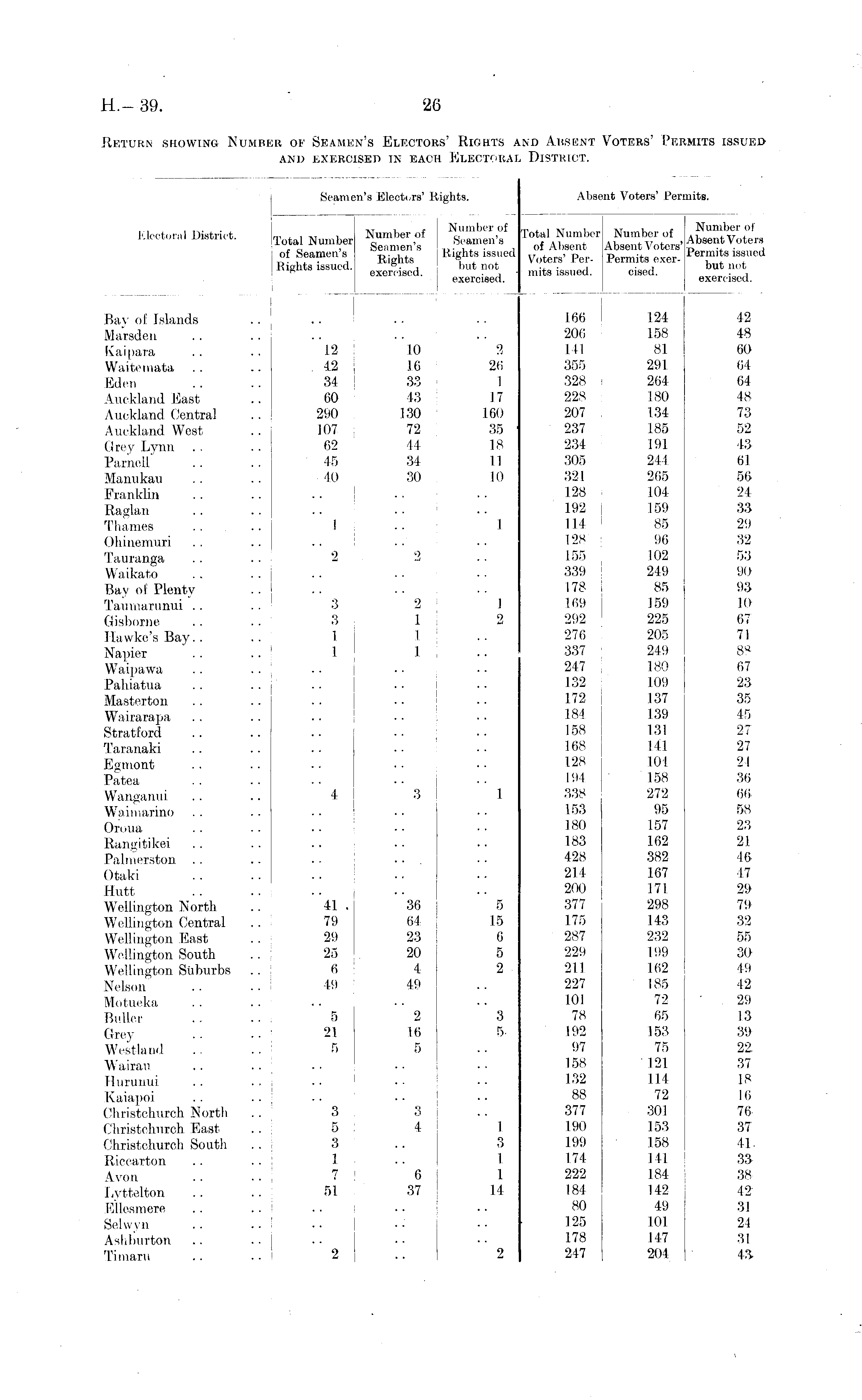 Kleotoral District. Bay of Islands Marsden Kaipara Waitemata .Eden Auckland East Auckland Central Auckland West Grey Lynn Parnell.' Manukau Franklin Raglan Thames Ohinemuri Tauranga Waikato Bay of Plenty Taumarunui . . Gisborne Hawke's Bay. . Napier Waipawa Pahiatua Masterton. Wairarapa Stratford Taranaki Egmont Patea Wanganui Waimarino Oroua Rangitikei Palmerston • • Otaki Seamen's Electors' Rights. , T , ,. Number of m 4 i at i Number ol - , Total Number 0 , Seamen s , ,, , Seamen s „. ... . , of Seamen s „. ,, Bights issued Rights issued. ?•« j but not B exercised. , exercised. '.'. 12 10 2 ,42 16 26 34 33 1 60 43 17 290 130 160 107 72 35 62 44 18 45 34 11 40 30 10 !! i '.'. i 2 2 3 2 1 3 1 2 1. 1 .. 1 1 .. I '.'. 4 ' 3 1 Total Number Number of of Absent Absent Voters' Voters' Per- Permits exermits issued. oised. 166 124 206 158 111 81 355 291 328 264 228 180 207 134 237 185 234 191 305 241 321 265 128 I 104 192 159 114 85 !28 96 155 102 339 249 178 85 169 159 292 225 276 205 337 249 247 180 132 109 172 137 184 139 158 131 16S 141 128 101 191 158 338 272 153 95 180 157 183 162 428 382 21.4 167 200 171 377 298 175 143 287 232 229 199 211 162 227 185 101 72 78 65 192 153 97 75 158 121 132 114 88 72 377 301 190 153 199 158 174 141 222 184 184 142 80 49 125 101 178 147 247 204 Absent Voters' Pen Number of Absent Voters Permits issued but not exercised. Its. 42 48 60 04 64 48 73 52 43 61 56 24 33 29 32 53 90 93 Id 67 71 8« 67 23 35 45 27 27 21 Hutt Wellington North Wellington Central Wellington East Wellington South Wellington Suburbs Nelson Motueka Boiler Grey Westland Wairau llurunui Kaiapoi Christchurch North Christchurch East Christchurch South Ricearton Avon Lyttelton Ellesmere Selwyn Ashburton Timaru 41 . 36 5 .. ! 79 64 15 .. j 29 23 6 .. | 25 20 5 6 4 2 .. I. 49 49 '.'. 5 2 3 21 16 5. 5 5 .. 3 3 5 4 1 3 .. 3 I .. 1 ..761 51 37 14 '.'. 2 '.'. 2 36 86 58 23 21 46 17 29 7'.) 32 55 30 49 42 . 29 13 39 22, 37 18 16 76 37 41. 33 38, 42 31 24 31 43