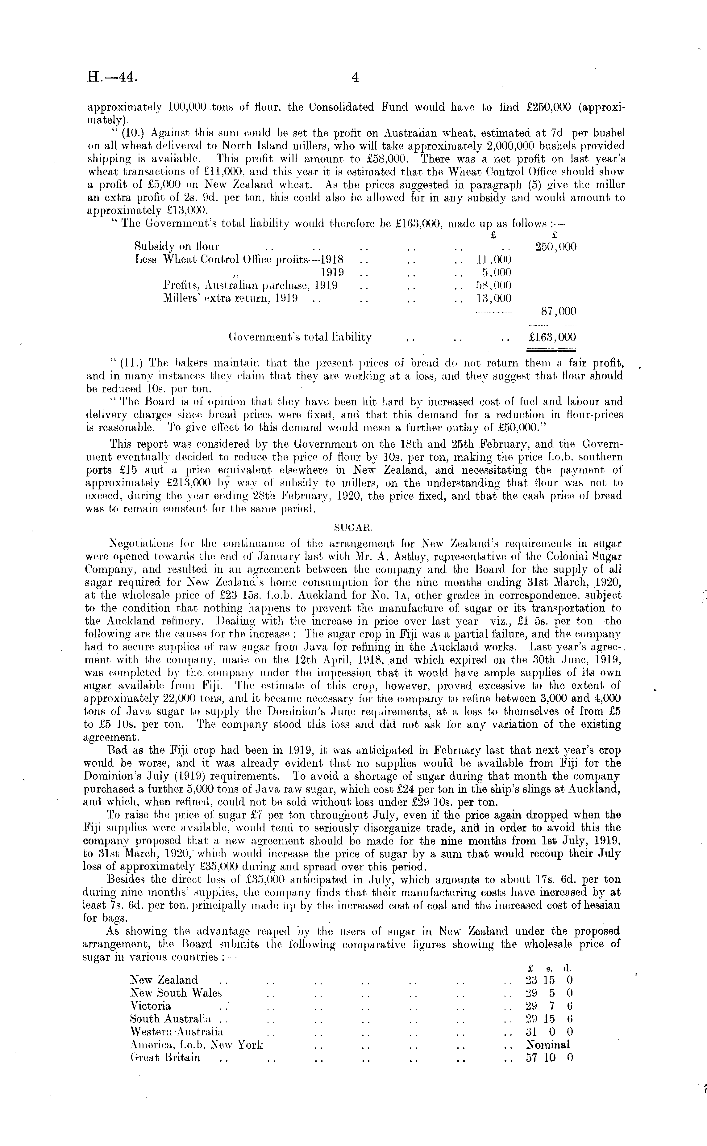 approximately 100,000 tons of flour, the Consolidated Fund would have to find £250,000 (approximately). " (10.) Against this sum could be set the profit on Australian wheat, estimated at 7d pel bushel on all wheat delivered to North Island millers, who will take approximately 2,000,000 bushels provided shipping is available. This profit will amount to £58,000. There was a net profit on last year's wheat transactions of £11,000, and this year it is estimated that the Wheat Control Office should show a profit of £5,000 on New Zealand, wheat. As the prices suggested in paragraph (5) give the miller an extra profit of 2s. 9d. per ton, this could also be allowed for in any subsidy and would amount to approximately £13,000. " The Government's total liability would therefore be, £163,000, made up as follows : £ £ Subsidy on flour .. .. .. .. .. .. 250,000 Less Wheat Control Office profits--1918 .. .. .. 11,000 1919 .. .. .. 5,000 Profits, Australian purchase, 1919 .. .. .. 58,000 Millers'extra return, 1919 .. .. .. .. 13,000 87,000 Government's total liability .. .. .. £1.63,000 "(11.) The. bakers maintain that the present prices of bread do not return them a fair profit, and in many instances they claim that they are working at a loss, and. they suggest that flour should be reduced 10s. per ton. " The, Board is of opinion that they have been hit hard by increased cost of fuel and labour and delivery charges since bread prices were fixed, and that this demand, for a reduction in flour-prices is reasonable. To give effect to this demand would mean a further outlay of £50,000." This report was considered by the Government on the 18th and 25th February, and the Government eventually decided to reduce the [nice of flour by 10s. per ton, making the price f.o.b. southern ports £15 and a price equivalent elsewhere in New Zealand, and necessitating the, payment of approximately £213,000 by way of subsidy to millers, on the understanding that, flour was not to exceed, during the year ending 28th February, 1920, the price fixed, and. that the, cash price of bread was to remain constant for the same period. SUGAR. Negotiations for the continuance of the arrangement for New Zealand's requirements in sugar were opened towards the end of January last with Mr. A. Astley, representative of the Colonial Sugar Company, and resulted in an agreement between the company and the Board for the supply of all sugar required for New Zealand's home consumption for the nine months ending 31st March, 1920, at the wholesale price of £23 15s. f.o.b. Auckland for No. la, other grades in correspondence, subject to the condition that nothing happens to prevent the manufacture of sugar or its transportation to the Auckland refinery. Dealing with the increase in price over last year- viz., £1 ss. per ton -the following are the causes for the increase : The sugar crop in Fiji was a partial failure, and the company had to secure supplies of raw sugar from Java for refining in the Auckland works. Last year's agree-, ment with the company, made on the 12th April, 1918, and which expired on the 30th June, 1919, was completed by the company under the impression that it woidd have ample supplies of its own sugar available from Fiji. The estimate of this crop, however, proved excessive to the extent of approximately 22,000 tons, and it became necessary for the company to refine between 3,000 and 4,000 tons of Java sugar to supply the Dominion's June requirements, at a, loss to themselves of from £5 to £5 10s. per ton. 'The company stood this loss and did not ask for any variation of the existing agreement. Bad as the Fiji crop had been in 1919, it was anticipated in February last that next year's crop would be worse, and it was already evident that no supplies would be available from Fiji for the Dominion's July (1919) requirements. To avoid a shortage of sugar during that month the company purchased a further 5,000 tons of Java raw sugar, which cost £24 per ton in the ship's slings at Auckland, and which, when, refined, could not be sold without loss under £29 10s. per ton. To raise the price of sugar £7 per ton throughout July, even if the price again dropped when the F'iji supplies were available, would tend to seriously disorganize trade, and in order to avoid this the company proposed that a new agreement should bo made for the nine months from Ist July, 1919, to 31st March, 1920,'which would increase the price of sugar by a sum that would recoup their July loss of approximately £35,000 during and spread over this period. Besides the direct loss of £35,000 anticipated in July, which amounts to about 17s. 6d. per ton during nine months' supplies, the company finds that their manufacturing costs have increased by at least 7s. 6d. per ton, principally made up by the increased cost of coal and the increased cost of hessian for bags. As showing the advantage reaped by the users of sugar in New Zealand under the proposed arrangement, the Board submits the following comparative figures showing the wholesale price of sugar in various countries : — £ s. d. New Zealand .. .. .. .. .. .. . . 23 15 0 New South Wales . . .. .. .. .. .. 29 5 0 Victoria ..' ■ .. .. . . .. .. 29 7 6 South Australia. . . . . .. . . . . . . . . 29 15 6 Western Australia .. .. .. .. .. .. 31 0 0 America, f.o.b. New York . . . . . . .. .. Nominal Great Britain .. .. .. .. .. .. .. 57 10 0