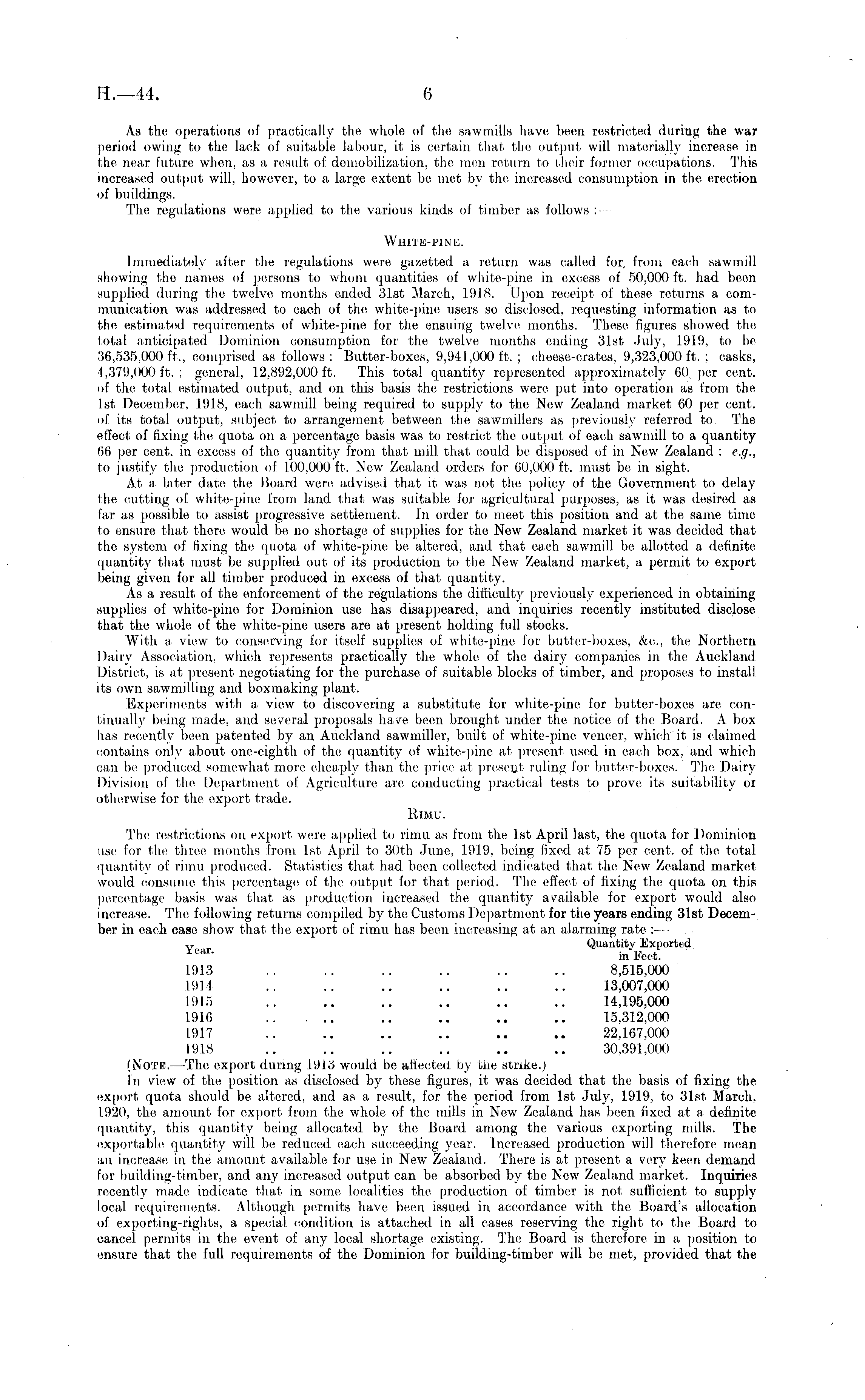 As the operations of practically the whole of the sawmills have been restricted duriug the war period owing to the lack of suitable labour, it is certain that the output will materially increase in the near future when, as a result of demobilization, the, men return to their former occupations. This increased output will, however, to a large extent be met by the increased consumption in the erection of buildings. The regulations were applied to the various kinds of timber as follows : White-pine. Immediately after the regulations were gazetted a return was called for, from each sawmill showing the names of persons to whom quantities of white-pine in excess of 50,000 ft. had been supplied during the twelve months ended 31st March, 1918. Upon receipt of these returns a communication was addressed to each of the white-pine users so disclosed, requesting information as to the estimated requirements of white-pine for the ensuing twelve months. These figures showed the total anticipated Dominion consumption for the, twelve months ending 31st July, 1919, to bo 36,535,000ft., comprised as follows: Butter-boxes, 9,941,000ft. ; cheese-crates, 9,323,000ft. ; casks, 4,379,000 ft.; general, 12,892,000 ft. This total quantity represented approximately 60. per cent, of the total estimated output, and on this basis the restrictions were put into operation as from the Ist December, 1918, each sawmill being required to supply to the New Zealand market 60 per cent, of its total output, subject to arrangement between the sawmillers as previously referred to The effect of fixing the quota on a percentage basis was to restrict the output of each sawmill to a quantity 66 per cent, in excess of the quantity from that mill that could be disposed of in New Zealand : e.g., to justify the production of 100,000 ft. New Zealand orders for 60,000 ft. must be in sight. At a later dare the Board were advised that it was not the policy of the Government to delay the cutting of white-pine from land that was suitable for agricultural purposes, as it was desired as far as possible to assist progressive settlement. In order to meet this position and at the same time to ensure that there would be no shortage of supplies for the New Zealand market it was decided that the system of fixing the quota of white-pine be, altered, and that each sawmill be allotted a definite quantity that must be supplied out of its production to the New Zealand market, a permit to export being given for all timber produced in excess of that quantity. As a result of the enforcement of the regulations the difficulty previously experienced in obtaining supplies of white-pine for Dominion use has disappeared, and inquiries recently instituted disclose that the whole of the white-pine users are at present holding full stocks. With a view to conserving for itself supplies of white-pine for butter-boxes, &c, the Northern Dairy Association, which represents practically the whole of the dairy companies in the Auckland District, is at present negotiating for the purchase of suitable blocks of timber, and proposes to install its own sawmilling and boxmaking plant. Fxperiments with a view to discovering a substitute for white-pine for butter-boxes are continually being made, and several proposals have been brought under the notice of the Board. A box has recently been patented by an Auckland sawmiller, built of white-pine veneer, which it is claimed contains only about one-eighth of the quantity of white-pine at present used in each box, and which can be produced somewhat more cheaply than the price at present ruling for butter-boxes. The Dairy Division of the Department of Agriculture arc conducting practical tests to prove its suitability or otherwise for the, export trade. RIMU. The restrictions on export were applied to rimu as from the Ist April last, the quota for Dominion use for the throe, months from Ist April to 30th June, 1919, being fixed at 75 per cent, of the total quantity of rimu produced. Statistics that had been collected indicated that the New Zealand market would consume this percentage of the output for that period. The effect of fixing the quota on this percentage basis was that as production increased the quantity available for export would also increase. The following returns compiled by the Customs Department for the years ending 31st December in each case show that the, export of rimu has been increasing at an alarming rate : v Quantity Exported * ear - in Eeet. 1913 .. .. .. .. .. .. 8,515,000 1914 .. .. .. .. .. .. 13,007,000 1915 .. .. .. .. .. .. 14,195,000 1.916 .. .. .. .. 15,312,000 1917 .. .. .. .. .. .. 22,167,000 1918 .. .. .. .. .. .. 30,391,000 (Note:. —The export during 1913 would be affected by the strike.) In view of the position as disclosed by these figures, it was decided that the basis of fixing the export quota should be altered, and as a result, for the period from Ist July, 1919, to 31st March, 1920, the amount for export from the whole of the mills in New Zealand has been fixed at a definite quantity, this quantity being allocated by the Board among the various exporting mills. The exportable quantity will be reduced each succeeding year. Increased production will therefore mean an increase in the amount available for use in Now Zealand. There is at present a very keen demand for building-timber, and any increased output can be absorbed by the New Zealand market. Inquiries recently made indicate that in some localities the production of timber is not sufficient to supply local requirements. Although permits have been issued in accordance with the Board's allocation of exporting-rights. a special, condition is attached in all cases reserving the right to the Board to cancel permits in the event of any local shortage existing. The Board is therefore in a position to ensure that the full requirements of the Dominion for building-timber will be met, provided that the
