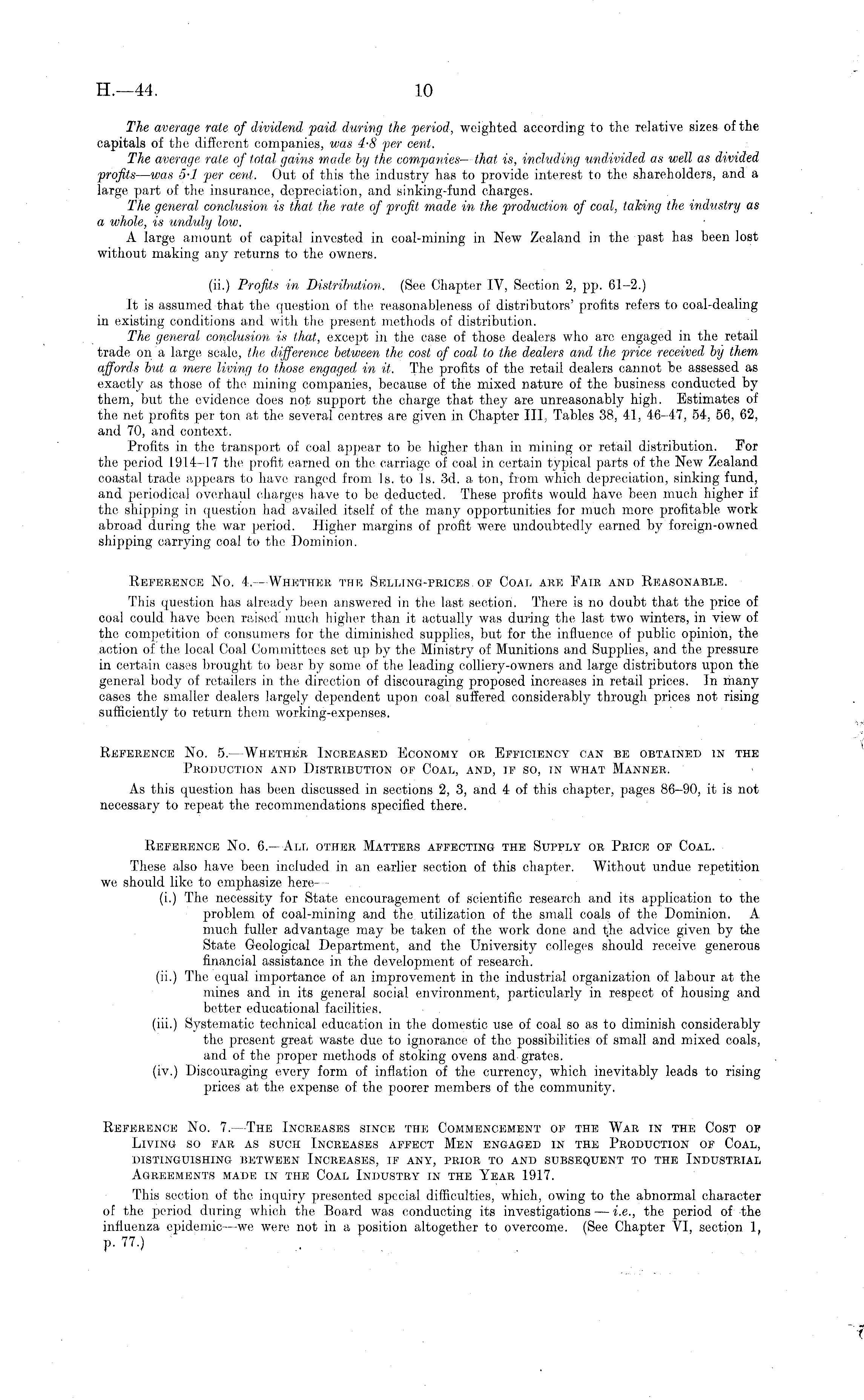 The average rale of dividend paid during the period, weighted according to the relative sizes of the capitals of the different companies, was 4-8 per cent. The average rate of total gains made by the companies — that is, including undivided as well as divided profits — was 5-1 per cent. Out of this the industry has to provide interest to the shareholders, and a large, part of the insurance, depreciation, and sinking-fund charges. The general conclusion is that the rate of profit made in the production of coal, taking the industry as a whole, is unduly low. A large amount of capital invested in coal-mining in New Zealand in the past has been lost without making any returns to the owners. (ii.) Profits in Distribution. (See Chapter IV, Section 2, pp. 61-2.) It is assumed that the question of the reasonableness of distributors' profits refers to coal-dealing in existing conditions and with the present methods of distribution. The general conclusion is that, except in the case of those dealers who are engaged in the retail trade, on a large scale, the difference between the cost of coal to the dealers and the price received by them affords but a mere living to those engaged, in it. The profits of the retail dealers cannot be assessed as exactly as those of the mining companies, because of the mixed nature of the business conducted by them, but the evidence does not support the charge that they are unreasonably high. Estimates of the net profits per ton at the several centres are given in Chapter 111, Tables 38, 41, 46 47, 54, 56, 62, and 70, and context. Profits in the transport of coal appear to be higher than in mining or retail distribution. For the period 1914-17 the profit earned on the carriage of coal in certain typical parts of the New Zealand coastal trade appears to have ranged from Is. to Is. 3d. a ton, from which depreciation, sinking fund, and periodical overhaul charges have to be deducted. These profits would have been much higher if the shipping in question had availed itself of the many opportunities for much more profitable work abroad, during the war period. Higher margins of profit were undoubtedly earned by foreign-owned shipping carrying coal to the Dominion. Reference No. 4.—Whether the Selling-prices. of Coal are Fair and Reasonable. This question has already' been answered in the last section. There is no doubt that the price of coal could have been raised much higher than it actually was during the last two winters, in view of the competition of consumers for the diminished supplies, but for the influence of public opinion, the action of the local Coal Committees set up by the Ministry of Munitions and Supplies, and the, pressure in certain cases brought to bear by some of the leading colliery-owners and large distributors upon the general body of retailers in the direction of discouraging proposed increases in retail prices. In many cases the smaller dealers largely dependent upon coal suffered considerably through prices not rising sufficiently to return them working-expenses. Reference No. s.—Whether Increased Economy or Efficiency can be obtained in the Production and Distribution of Coal, and, if so, in what Manner. As this question has been discussed in sections 2, 3, and 4 of this chapter, pages 86-90, it is not necessary to repeat the recommendations specified there. Reference No. 6.- All other Matters affecting the Supply or Price of Coal. These also have been included in an earlier section of this chapter. Without undue repetition we should like to emphasize here(i.) The necessity for State, encouragement of scientific research and its application to the problem of coal-mining and the utilization of the small coals of the Dominion. A much fuller advantage may be taken of the work done and the advice given by the State Geological Department, and the University colleges should receive generous financial assistance in the development of research, (ii.) The equal importance of an improvement in the industrial organization of labour at the mines and in its general social environment, particularly in respect of housing and better educational facilities, (iii.) Systematic technical education in the domestic use of coal so as to diminish considerably the present great waste due to ignorance of the possibilities of small and mixed coals, and of the proper methods of stoking ovens and grates, (iv.) Discouraging every form of inflation of the currency, which inevitably leads to rising prices at the expense of the poorer members of the community. Reference No. 7.—-The Increases since the Commencement of tub Wak in the Cost of Living, so far as such Increases affect Men engaged in the Production of Coal, distinguishing between Increases, if any, prior to and subsequent to the Industrial Agreements made in the Coal Industry in the Year 1917. This section of the inquiry presented special difficulties, which, owing to the abnormal character of the period during which the Board was conducting its investigations — i.e., the period of the influenza epidemic—we were not in a position altogether to overcome. (See Chapter VI, section 1,