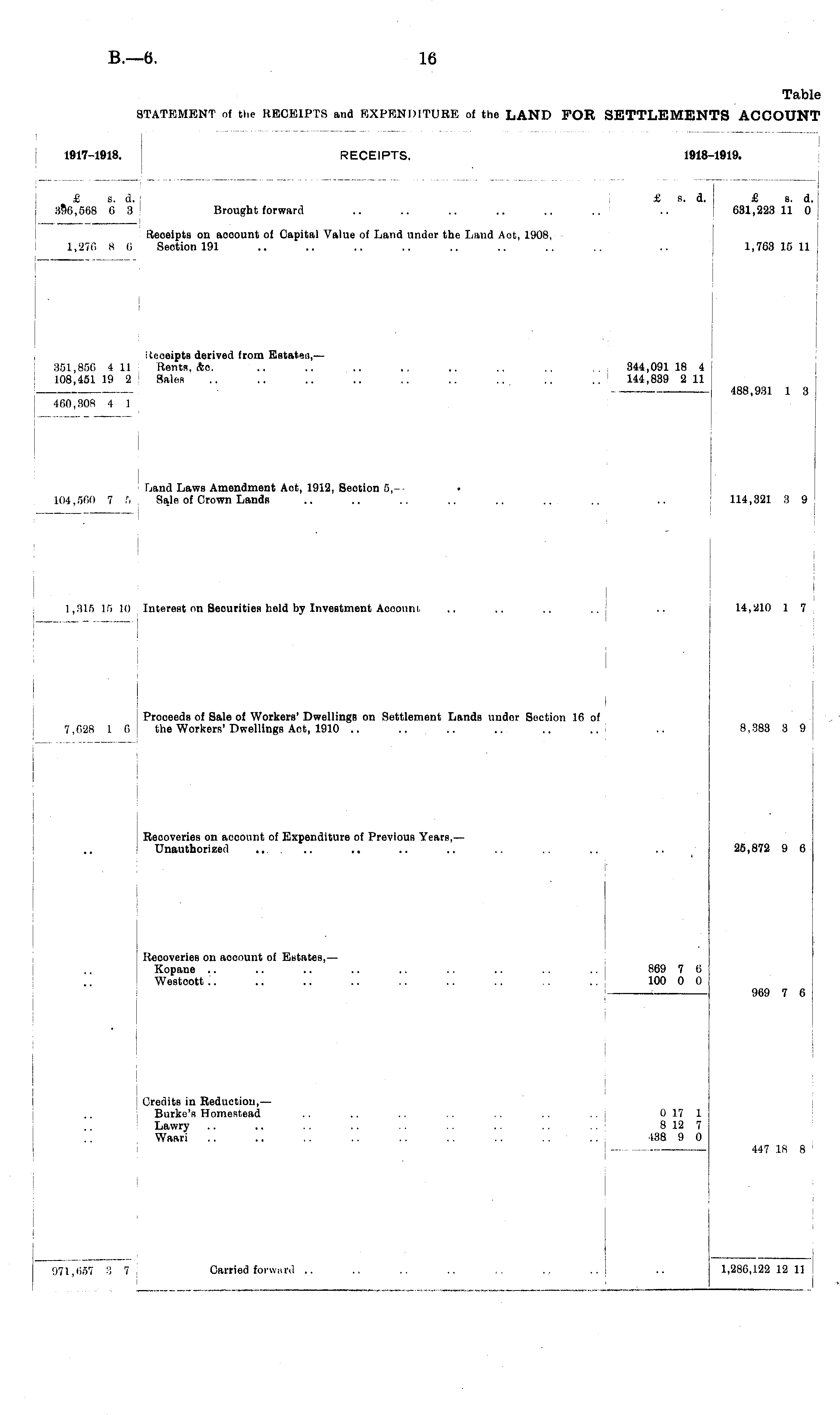 1917-1918. RECEIPTS. 1918-: [919. I "~ " ~ " " '" ' " £ s. d. j 3§6,568 6 3 ; Brought forward £ s. d. £ s. d. 681,223 11 0 Reoeipts on acoount of Capital Value of Land under the Land Aot, 1908, 1,276 8 6 Seotion 191 1,763 15 11 iteoeipts derived from Estates, — 351,856 4 11 Rents, &o. 108,451 19 2 I Sales .. .. .. .. .. .. .. .. 460,808 4 1 344,091 18 4 144,839 2 11 488,931 1 3 i Land Laws Amendment Act, 1912, Seotion 5,--104,560 7 5 Sale of Crown Lands 114,321 3 9 . 14,210 1 7 1,315 15 10 Interest on Securities held by Investment Aonount Proceeds of Sale of Workers' Dwellings on Settlement Lands under Section 16 of 7,628 1 6 the Workers'Dwellings Aot, 1910 .. i ' , . 8,383 3 9 Recoveries on acoount of Expenditure of Previous Years, — Unauthorized .... 25,872 9 6 Recoveries on aocount of Estates, — Kopane Westoott '.. 869 7 6 100 0 0 869 7 6 100 0 0 969 7 6 I Credits in Reduction, — Burke's Homestead Lawry Waari 0 17 1 8 12 7 438 9 0 447 18 8 ■ ■ 971,657 3 7 | Carried forward .. 1,286,122 12 11 i _ I