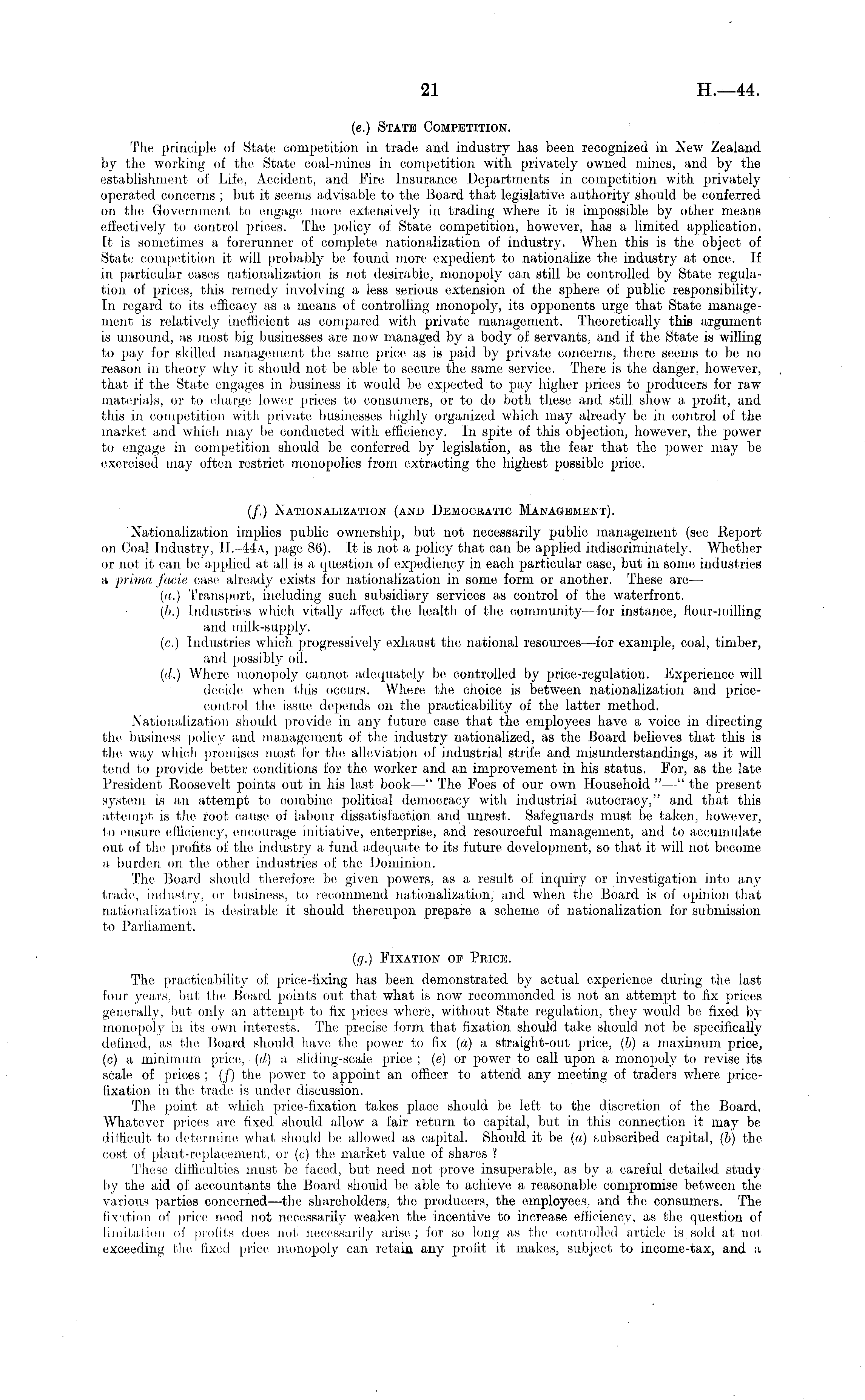 (e.) State Competition. The principle of State, competition in trade and industry has been recognized in New Zealand by the working of the State coal-mines in competition with privately owned mines, and by the establishment of Life, Accident, and Fire Insurance Departments in competition with privately operated concerns ; but it seems advisable, to the Board that legislative, authority should be conferred on the Government to engage, more, extensively in trading where it is impossible by other means effectively to control prices. The policy of State, competition, however, has a limited application. It is sometimes a forerunner of complete nationalization of industry. When this is the object of State competition it will probably be found more expedient to nationalize, the industry at once. If in particular oases nationalization is not desirable, monopoly can still be controlled by State regulation of prices, this remedy involving a less serious extension of the sphere of public responsibility. In regard to its efficacy as a means of controlling monopoly, its opponents urge that State management is relatively inefficient as compared with private management. Theoretically this argument is unsound, as most big businesses are now managed by a body of servants, and if the State is willing to pay for skilled management the same price as is paid by private concerns, there seems to be no reason in theory why it should not be able to secure the same service. There is the danger, however, that if the State engages in business it would be expected to pay higher prices to producers for raw materials, or to charge lower prices to consumers, or to do both these and. still show a profit, and this in competition with private; businesses highly organized which may already be, in control of the market and which .may be, conducted with efficiency. In spite of this objection, however, the power to engage in competition should be l , conferred by legislation, as the fear that the power may be exercised may often restrict monopolies from extracting the, highest possible price. (/.) Nationalization (and Democratic Management). Nationalization implies public ownership, but not necessarily public management (see Report on Coal Industry, H.-44A, page 86). It is not a policy that can be applied indiscriminately. Whether or not it can be applied at all is a question of expediency in each particular case, but in some industries a prima facie case already exists for nationalization in some form or another. These are — (a.) Transport, including such subsidiary services as control of the waterfront. (b.) Industries which vitally affect the health of the community—for instance, flour-milling anel milk-supply. (c.) Industries which progressively exhaust the national resources —for example, coal, timber, and possibly oil. (d.) Where monopoly cannot adequately be controlled by price-regulation. Experience will eleeaele; wheui this occurs. Where, the choice is between nationalization and pricecontrol the' issue l , depends on the practicability of the latter method. Nationalization should provide in any future case that the employees have a voice in direeyting the', business policy and management of the; industry nationalized, as the Board believes that this is the; way which promises most for the alleviation of industriai strife and misunderstandings, as it will tend to provide, better conditions for the worker and an improvement in his status. For, as the late President Roosevelt points out in his last book —" The Foes of our own Household " —" the present system is an attempt to oombine political democracy with industrial autocracy," and that this attempt is the foot cause of labour dissatisfaction and unrest. Safeguards must be taken, however, to ensure efficiency, encourage initiative, enterprise, and resourceful management, and to accumulate out eff the; profits of the industry a fund adequate to its future development, so that it will not become a burden em the other industries of the Dominion. The Board should therefore be given powers, as a result of inquiry e>r investigation into any trade;, industry, or business, to recommend nationalization, ami when the Board is of opinion that nationalization is desirable it should thereupon prepare a scheme', of nationalization for submission to Parliament. (//.) Fixation op Price. The practicability of price-fixing has been demonstrated by actual experience during the last four years, but the, Board points out that what is now recommended is not an attempt te> fix prices generally, but only an attempt to fix prices where, without State regulation, they would lie fixed by monopoly in its own interests. The precise form that fixation should take should not be specifically defined, as the Board should have the power to fix (a) a straight-out price, (b) a maximum price, (c) a minimum price, (d) a sliding-scale price ; (e) or power to call upon a monopoly to revise its scale of prices ; (/) the power to appoint an officer to attend any meeting of traders where pricefixation in the trade is under discussion. The, point at which price-fixation takes place should be; left to the discretion of the Bejard. Whatever prices are fixed should allow a fair return to capital, but in this connection it may be difficult to determine what should be allowed as capital. Should it be (a) subscribed capital, (b) the cost of plant-replacement, or (c) the market value of shares ? These difficulties must be faced, but neeei not prove insuperable, as by a careful detailed study by the aid of accountants the Board should be able to achieve a reasonable compromise between the various parties concerned—the shareholders, the: producers, the employees, and the consumers. The fixation of price need not necessarily weaken the incentive, to increase efficiency, as the, question of limitation of profits dex's not necessarily arise ; lor so long as the controlled article is sold at not exceeeling flu