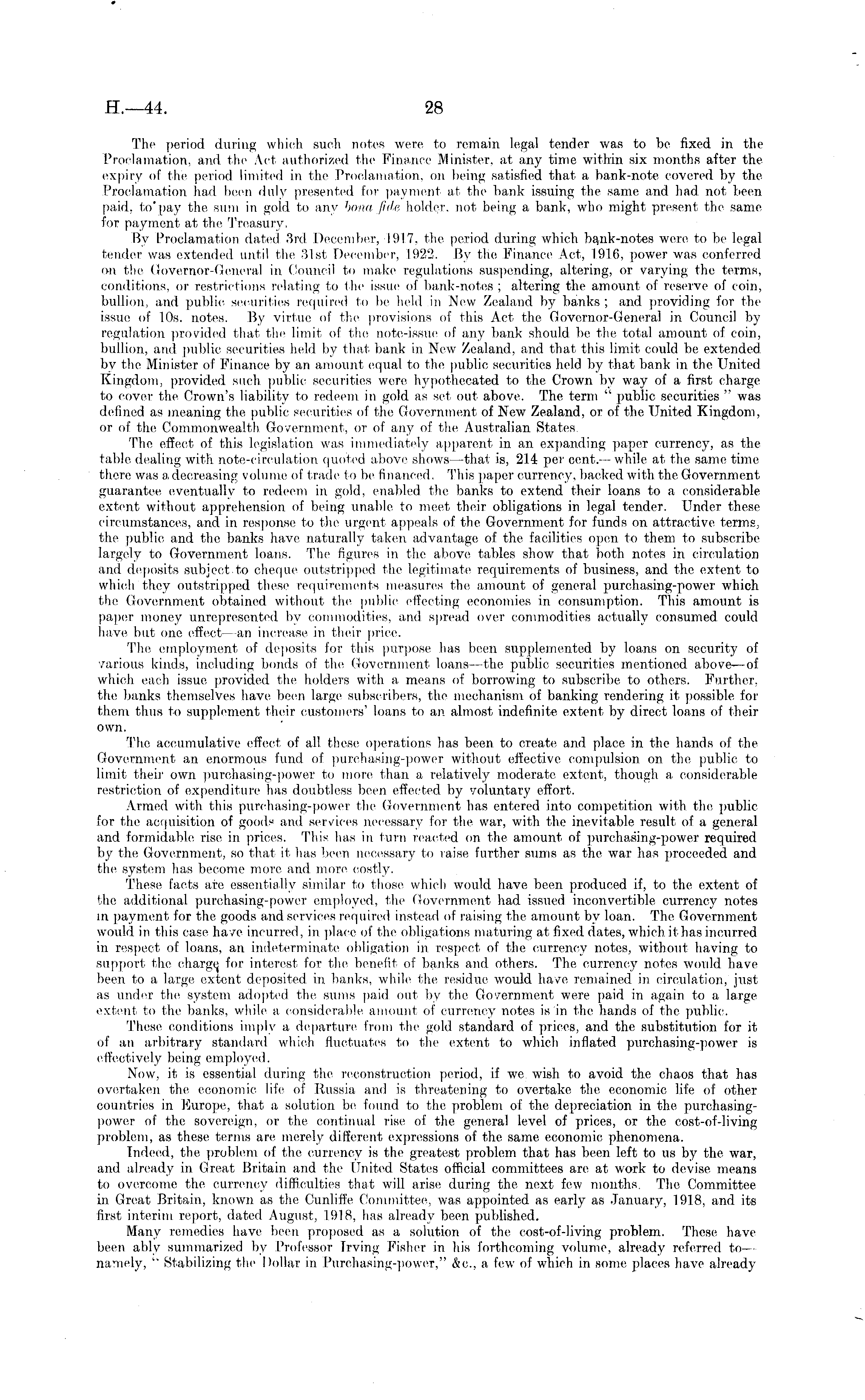 The period during which suedi note's were to remain le;gal tender was to be fixed in the Proclamation, anel. the Act authorized the Finance Minister, at any time within six months after the expiry e>f the period limited in the Proclamation; on being satisfied that a bank-note covered by the Proclamation had been duly presented for payment at the bank issuing the same and had not been paid, to'pay the sum in gold to any bona fide holder, not being a bank, who might present the same for payment at the; Treasury. By Proclamation dated 3rd December, 1917. the period during which bank-notes were to be legal tender was extended until the 31st December, 1922. By the Finance Act, 1916, power was cemferred on the Governor-Gcne;ral in Council to make regulations suspending, altering, or varying the terms, conditions, eir restrictions relating to tin' issue of bank-notes ; altering the amount of reserve of coin, bullion, and public securities required to be held in New Zealand by banks ; and providing for the issue e>f 10s. notes. By virtue of the previsions of this Act the Governor-General in Council by regulation provided that the limit eif the note-issue of any bank should be the total amount of coin, bullion, and public securities held by that bank in New Zealand, and that this limit could be extended by the Minister of Finance by an amount equal to the public securities held by that bank in the United Kingdom, provided such public securities were hypothecated to the Crown by way of a first charge to cover the. Crown's liability to redeem in gold as set out above. The term " public securities " was defined as meaning the public securities of the Gervernment of New Zealand, or of the. United Kingdom, or eif the Commonwealth Government, or of any of the Australian States. The effect of this legislation was immediately apparent in an expanding paper currency, as the table dealing with note-circulation quoted above; shows —that is, 214 per cent.— while at the same time there was adecreasing volume of trade' to be financed. This, paper currency, backed with the. Government guarantee eventually to redeem in gold, enabled the banks to extend their loans to a e'onsiderable extent without apprehemsiein of being unable to meet their obligations in legal tender. Under these circumstances, and in response to the urgent appeals of the Government for funds on. attractive terms, the public and the banks have naturally taken advantage of the facilities open to them to subscribe largely to Government loans. The figure's in the above tables show that both notes in circulation anel depeisits subject to cheque' outstripped the legitimate requirements of business, and the extent to which they outstripped these requirements measures the amount of general purchasing-power which the Government obtained without the public effecting economies in consumption. This amount is paper money unrcpresenteel by commodities, and spread over commodities actually consumed could have but one effect—an increase in their price. The employment of deposits for this purpose has been supplemented by loans on security of various kinds, including bonds of the; Government loans the public securities mentioned above—of which each issue provided the holders with a means eif borrowing to subscribe, to others. Further, the banks themselves have bee;n large' subscribers, the mechanism of banking rendering it possible for them thus to supplement their customers' loans to an almost indefinite, extent by direct loans of their own. The, accumulative effect, of all these operations has been to create and place in the hands of the Government an enormous fund of purchasing-power without effective compulsion on the public to limit their own purchasing-power to more than a relatively moderate extent, though a considerable restriction of expenditure has doubtless been effee-ted by voluntary effort. Armed with this purchasing-power the Government has entered into competition with the public for the acquisition of goods anel service's necessary for the war, with the inevitable result of a general and formidable rise in prices. This has in turn reacted em the amount of purchasing-power required by the Government, so that it has been necessary to raise; further sums as the war has proceeded and the system has become more, and more; costly. These facts are essentially similar to those which weuild have been produced if, to the extent of the additional purchasing-power employed, the Government had issued inconvertible currency notes in payment for the goods and services required instead of raising the amount by loan. The Governmemt would in this case have incurred, in place of the- obligations maturing at fixed elates, which it has incurred in respect of loans, an indeterminate obligation in respect of the currency notes, without having to support the ediargej for interest for the benefit of banks and others. The currency notes would have been to a large extent depositee! in banks, while; the residue would have remained in circulation, just as under the system adopted the sums paiel out by the Government were paid in again to a large extent to the banks, while a considerable amount eif currency notes is in the hands of the public These conditions imply a departure from the gold standard of prices, and the substitution for it of an arbitrary standard which fluctuates to the extent to which inflated purchasing-peiwer is effectively being employed, Now, it is essential during the' reconstruction period, if we wish to avoid the chaos that has overtaken the, economic life' eif Russia and is threatening to overtake! the economic life eif either countries in Europe, that a, solution be; found to the, problem of the depreciation in the purchasingpower of the sovereign, or the continual rise of the; general level of prices, or the cost-of-living problem, as these terms are merely different expressions of the same economic, phenomena. Indeed, the problem of the cu