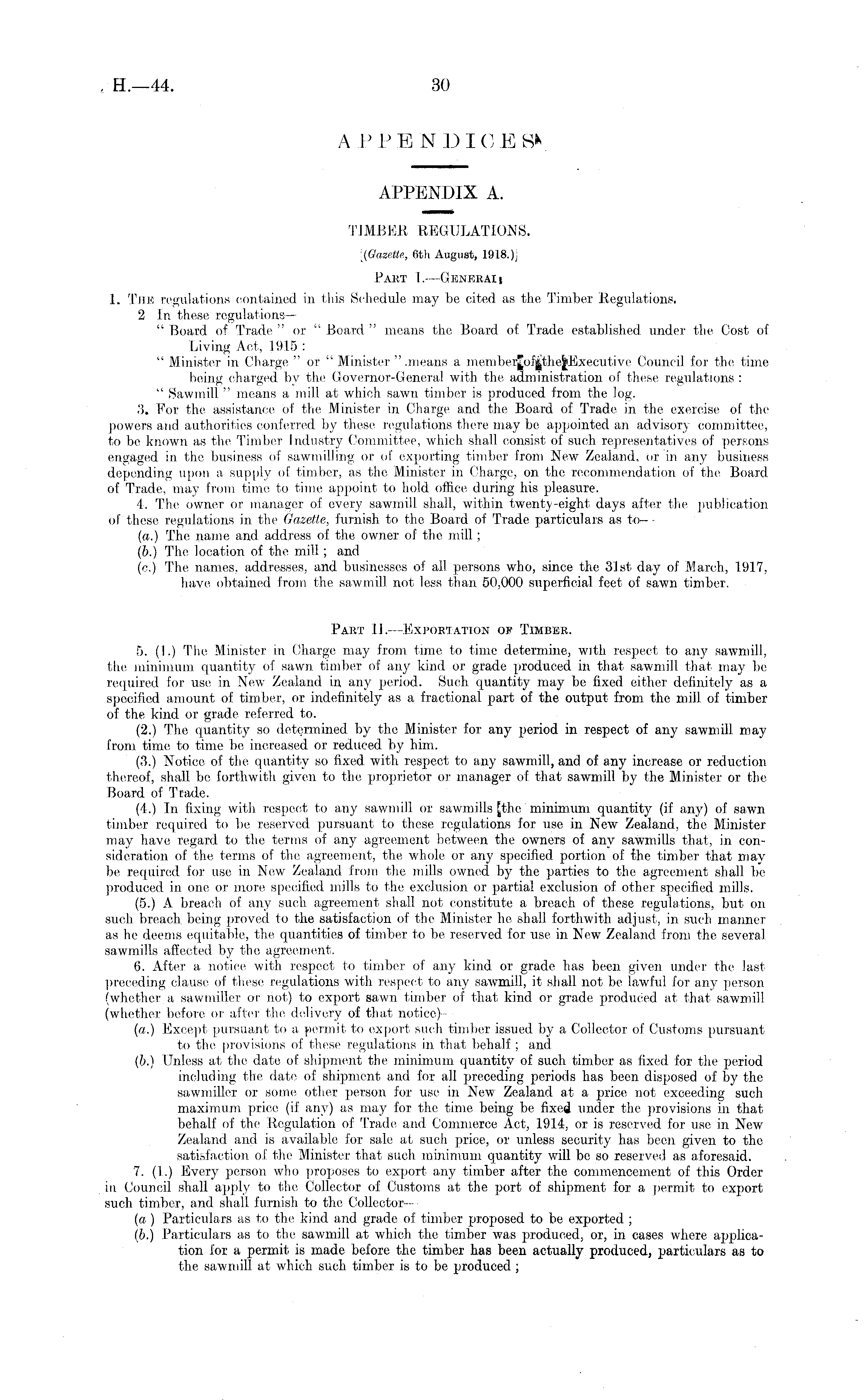A P PEN DICE BV. APPENDIX A. TIMBER REGULATIONS. [(Gazette,, 6th August, 1918.)j Part I. —Generau 1. The regulations contained in this Sediedule may be cited as the Timber Regulations, 2 In these regulations— " Board of Trade " or " Board " means the Board of Trade established, under the Cost of Living Act, 1915 : " Minister in Charge " or " Minister ".means a memberfof|the|Executive Council for the time being charged by the Governor-General with the administration of these regulations : " Sawmill " means a mill at which sawn timber is produced from the log. 3. For the assistance of the Minister in Charge and. the Board of Trade in the exercise of the powers and authorities conferred by these regulations there may be appointed an advisory committee, to be known as the Timber Industry Committee, which shall consist of such representatives of persons engaged in the business eif sawmilling or of exporting timber from New Zealand, or in any business depending upon a supply of timber, as the Minister in Charge, on the recommendation of the Board of Trade, may from time to time appoint to hold office during his pleasure. 4. The owner or manager of every sawmill shall, within twenty-eight days after the publication of these regulations in the Gazette, furnish to the Board of Trade particulars as to— - (a.) The name and address of the owner of the mill ; (b.) The location of the mill; and (c.) The names, addresses, and businesses of all persons who, since the 31st day of March, 1917, have; obtained from the sawmill not less than 50,000 superficial feet of sawn timber. Part ll.—Exportation of Timber. 5. (I.) The Minister in Charge may from time to time determine, with respect to any sawmill, the' minimum quantity of sawn timber of any kinel or grade produced in that sawmill that may be required for use in New Zealand in any period. Sue;h quantity may be fixed either definitely as a specified amount of timber, or indefinitely as a fractional part of the output from the mill, of timber of the kind or grade referred to. (2.) The quantity so determined by the Minister for any period in respect of any sawmill may from time to time be increased or reduced by him. (3.) Notice of the quantity so fixed with respect to any sawmill, and of any increase or reduction thereof, shall be forthwith given to the proprietor or manager of that sawmill by the Minister or the Board of Trade. (4.) In fixing with respect to any sawmill or sawmills [the minimum quantity (if any) of sawn timber required tei be reserved pursuant to these regulations for use in New Zealand, the Minister may have regard to the terms of any agreement between the owners of any sawmills that, in consideration of the terms of the agreement, the whole or any specified portion of the timber that may be required for use in New Zealand from the mills owned by the parties to the agreement shall be produced in one or more specified mills to the exclusion eir partial exclusion of other specified mills. (5.) A. breach of any such agreement shall not constitute a breach of these regulations, but on such breach being proved to the satisfaction of the Minister he shall forthwith adjust, in such manner as he deems equitable, the quantities of timber to be, reserved for use, in New Zealand, from the several sawmills affected by the agreement. 6. After a notice with respect to timber of any kind or grade has been given under the last preceding clause of these regulations with respect to any sawmill, it shall not be lawful for any person (whether a sawmiller or not) to export sawn timber of that kind or grade produced at that sawmill (whether before or after the delivery of that noticc)(a.) Except pursuant to a permit to export such timber issued by a Collector of Custeims pursuant to the provisions of these regulations in that behalf ; and (6.) Unless at the date of shipment the minimum quantity of such timber as fixed for the period including the date; of shipment and for all preceding periods has been disposed of by the sawmiller or some other person for use in New Zealand at a price not exceeding such maximum price (if any) as may for the time being be fixed under the provisions in that behalf eif the Regulation of Trade and Commerce Act, 1914, or is reserved for use in New Zealand and is available for sale at such price, or unless security has been given to the satisfaction of the Minister that such minimum quantity will be so reserved as aforesaid. 7. (1.) Every person who proposes to export any timber after the commencement of this Order in Council shall apply to the Collector of Customs at the port of shipment for a permit to export such timber, and shall furnish to the Collector--(a ) Particulars as to the kind and grade of timber proposed to be exported ; (b.) Particulars as to the' sawmill at which the timber was produced, or, in cases where application for a permit is made before the timber has been actually produced, particulars as to the sawmill at which such timber is to be produced ;