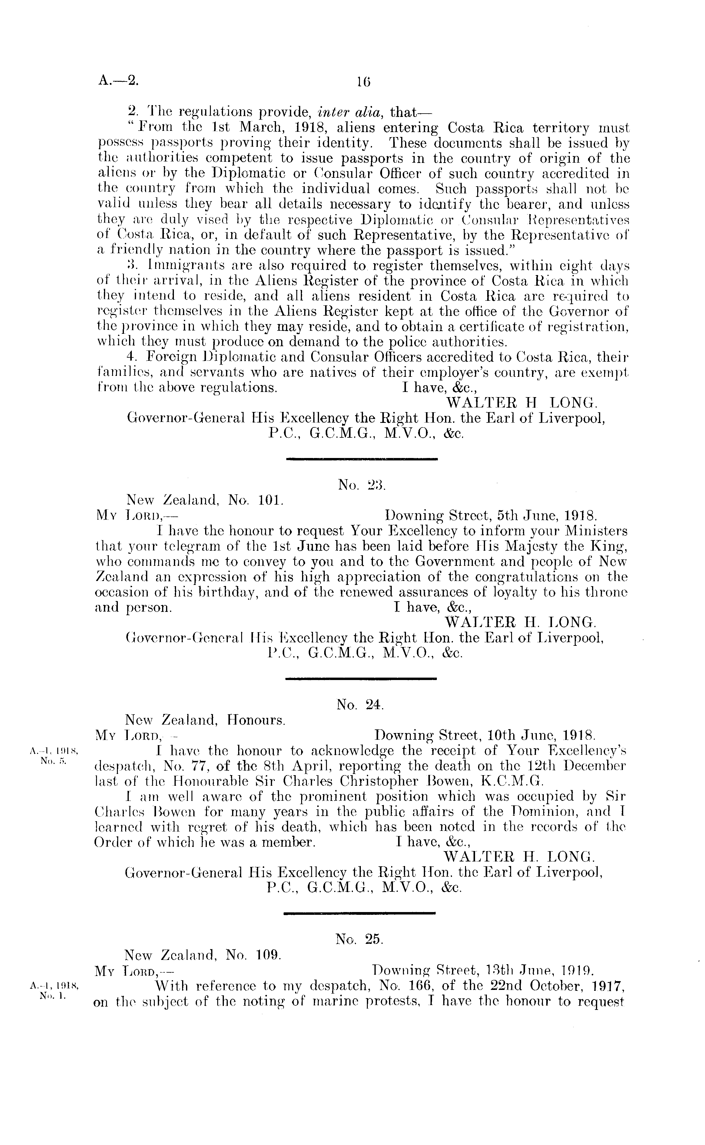 No. 24. New Zealand, Honours. My Lord, — Downing Street, 10th June, 1918. I have the honour to acknowledge the receipt of Your Excellency's despatch, No. 77, of the Bth April, reporting the death on the 12th December last of the Honourable Sir Charles Christopher Bowen, K.C.M.G. I am well aware of the prominent position which was occupied by Sir Charles Bowen for many years in the public affairs of the Dominion, and I learned with regret of his death, which has been noted in the records of the Order of which he was a member. I have, &e, WALTER H. LONG. Governor-General His Excellency the Right Hon. the Earl of Liverpool, P.C., G.C.M.G, M.V.0., &c.