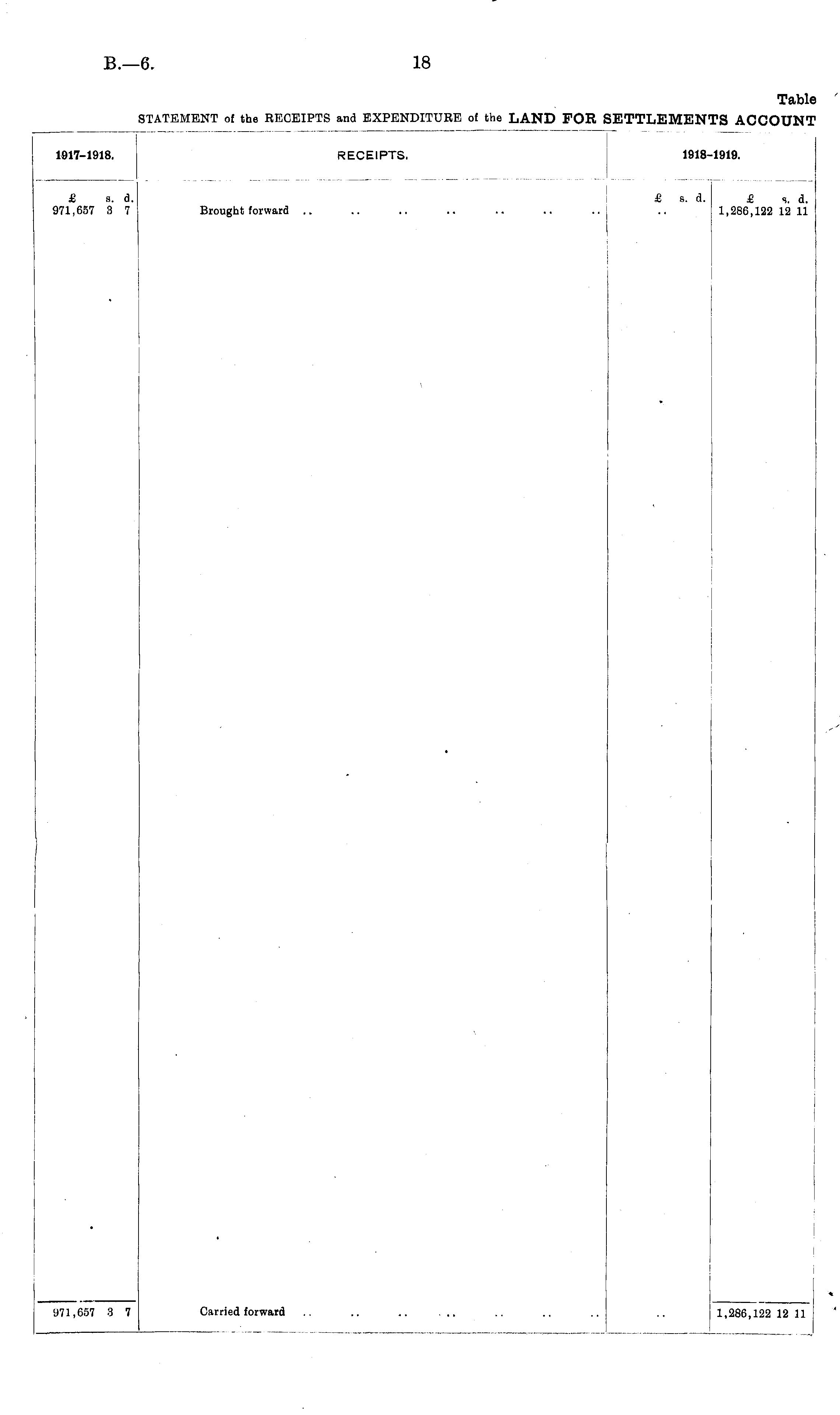 1917-1918. RECEIPTS. 1918 1919. £ s. d. 971,657 3 7 Brought forward £ s. d. £ s. d. 1,286,122 12 11 \ • Carried forward 971,657 3 7 1,286,122 12 11