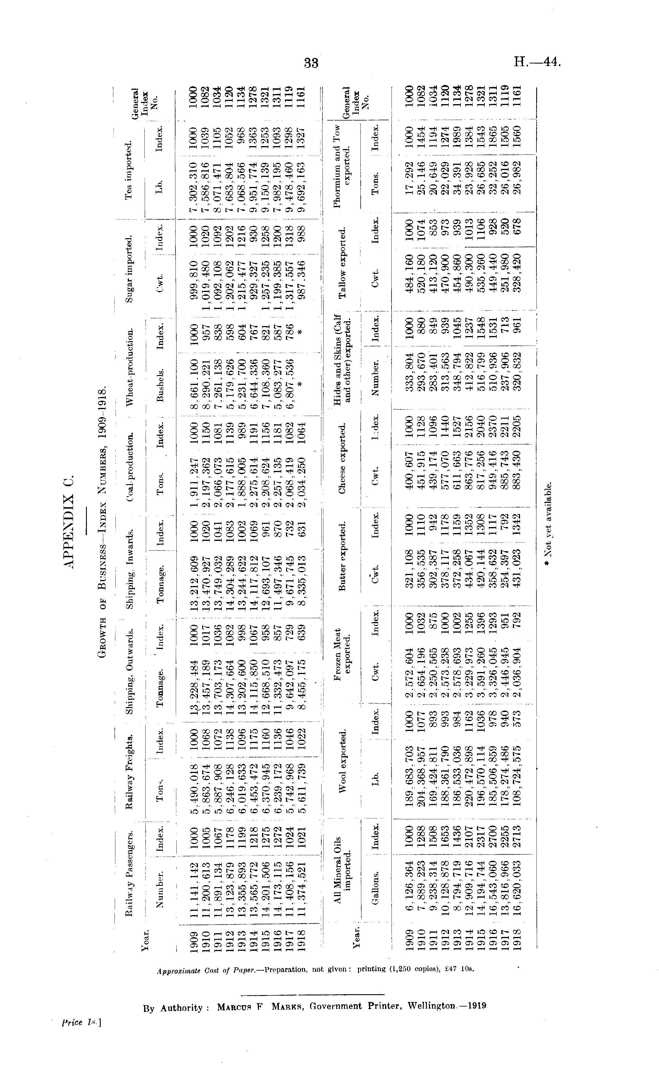 i iii Year. Railway Passengers. Railway Freights. Shipping, Outwards. Shipping, Inwards. Coal-production. Wheat-production. Sugar imported. Tea imported. ': |i No. Number. ■ Index. Tons. Index. Tonnage. Index. Tonnage. j Index. Tons. Index. Bushels. Index. Cwt. j Index. Lb. Index. 1909 1910 1911 1912 1913 1914 1915 1916 1917 1918 | I 11.141.142 1000 5.490.018 1000 1,3.228,484 1000 13.212.609 1000 1.911.247 1000 . 8.661 .100 1000 999.810 1000 7.302,310 ! 1000 1000 11.200.613 1005 5,863.674 1068 13.457.189 1017 13.470.927 1020 I 2.197.362 1150 8.290.221 | 957 1,019.480 1020 7.586,816 : 1039 1082 11.891.134 1067 5.887.908 1072 13.703.173 1036 ; 13.749.032 1041 2,066,073 1081 7.261.138 ' 838 1,092.108 1092 8,071.471 1105 1034 13.123.879 1178 6.246.128 1138 14.307.664 1082 ' 14.304.289 1083 2.177,615 1139 5.179.626 598 1.202,062 1202 7,683,804 1052 1120 13.355.893 1199 6.019.633 1096 13.202.600 998 13.244.622 1002 1.888.005 989 5.231.700 ' 604 1,215.477 '■ 1216 7,068.566 968 1134 13.565.772 1218 6.453.472 1175 14.115.850 1067 14.117.812 1069 2.275.614 1191 6.644.336 767 929.327 930 9.951,774 1363 1278 14.201.506 '• 1275 6.370.945 1160 12.668,510 958 12,693.107 961 2,208.624 1156 7.108,360 ! 821 1,257.235 I 1258 9,150,139 1253 1321 14.173.115 1272 6.239.172 1136 11.332,473 857 11.497.346 870 2.257.135 1181 5.083.277 587 ', 1,199.385 1200 7.982.195 1093 1311 11.408.156 1024 5.742.968 1046 9.642.097 729 9.671.745 732 2,068.419 1082 6.807.536 786 1,317,557 , 1318 9,478.460 1298 1119 11.374.521 ! 1021 5.611.739 1022 8.455.175 639 8.335.013 631 2.034.250 1064 * * 987.346 988 9.692.163 1327 1161 ' __J_, ' ,|_. .... i ! 'I i _ ! .. .!_.. . J. Year. All Mineral Oils ,, T , . , Frozen Meat „ ,, , , „, . , Hides and Skins (Calf „ „ . ■. Phormium and Tow imported. Wool exported. exported. Butter exported. Cheese exported. and other ) exported. Tallow exported. exported. General | ! ' Index r No. Gallons. j Index. : Lb. Index. Cwt. Index. Cwt. Index. Cwt. I .dex. Number. Index. Cwt. Index. Tons. I Index. Wool exported. export ■ted. Butter ex] [ported. Cheese Gallons. Index. Lb. Index. Cwt. Index. ('wt. Index. Cwt, 1909 6.126.364 1000 1910 7.889.223 1288 1911 9,238,314 1508 1912 10.128.878 1653 1913 8.794,719 1436 1914 12.909,716 2107 1915 14,194,744 j 2317 1916 16.543,060 2700 1917 13,816,966 2255 1918 16,620,033 2713 189.683.703 204.368,957 169.424.811 188,361.790 186.533.036 220.472,898 196,570,114 185,506,859 178,274,486 108,724,575 1000 i 2.572.604 1077 i 2.654.196 893 i 2.250.565 993 I 2,573.238 984 : 2.578,693 1162 : 3,229,973 1036 I 3,591,260 978 ! 3.326,045 940 ; 2,446.945 573 2,036.904 1000 1032 875 1000 1002 1255 1396 1293 951 792 321, 108 1000 356.535 1110 302.387 ! 942 378.117 1178 372.258 1159 434.067 1352 420,144 1308 358.632 ; 1117 254.397 : 792 431.023 ; 1342 400.607 1000 I 451,915 1128 439.174 : 1096 577.070 1440 611,663 '' 1527 863,776 i 2156 817.256 j 2040 949.416 2370 885,743 2211 | 883.430 2205 333.804 1000 293,670 880 283.401' 849 313.563 939 348.794 1045 412.822 1237 516,799 1548 510,936 1531 237,906 713 320.832 961 484.160 520,180 413.120 470,900 454,860 490.300 535.260 449,440 251,980 328.420 1000 I 1074 j 853 • 973 ! 939 1013 [ 1106 928 : 520 678 j 17.292 1000 25.146 1454 20,649 i 1194 22.029 1274 34.391 1989 23.928 1384 26,685 1543 32.252 1865 26,016 1505 26,982 1560 : 100( 1085 10& 112( 113' 1271 132! 1311 111! ii6: * Not yet available.