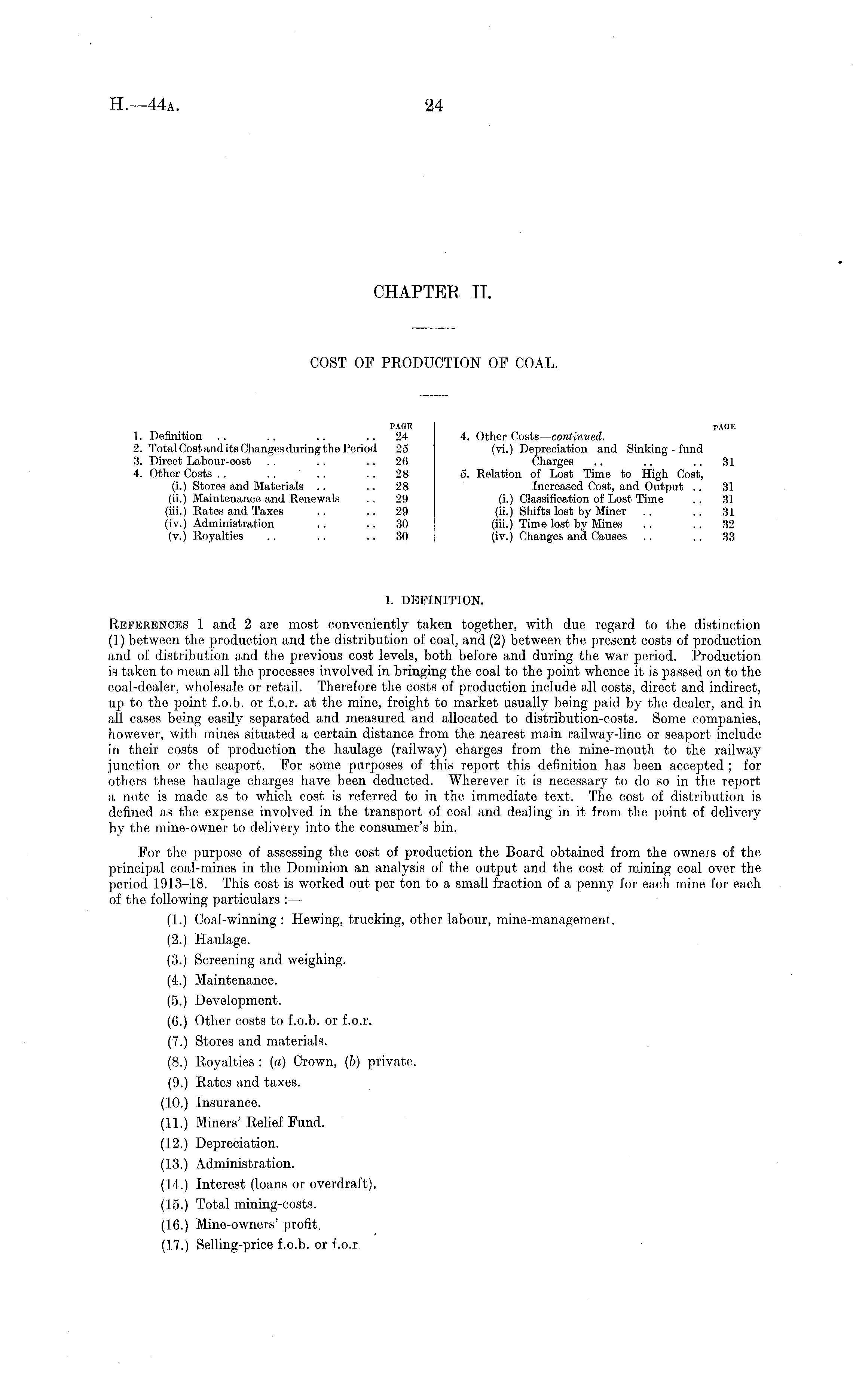 CHAPTER IT. COST OF PRODUCTION OP COAL. TAfiP, pAGE 1. Definition .. .. .. 24 4. Other Costs— continued. 2. TotalOostanditsOhangesduringthe Period 25 (vi.) Depreciation and Sinking-fund 3. Direct Labour-cost . . . . . . 26 Charges .. .. 31 4. Other Costs .. .. . . 28 5. Relation of Lost Time to High Cost, (i.) Stores and Materials .. .. 28 Increased Cost, and Output ~ 81 (ii.) Maintenance and Renewals . . 20 (i.) Classification of Lost Time . . 31 (iii.) Rates and Taxes .. .. 29 (ii.) Shifts lost by Miner .. . . 31 (iv.) Administration .. .. 30 (iii.) Time lost by Mines .. .. 32 (v.) Royalties .. .. 30 (iv.) Changes and Causes .. .. 33 1. DEFINITION. References 1 and 2 are most conveniently taken together, witli due regard to the distinction (]) between the production and the distribution of coal, and (2) between the present costs of production and of distribution and the previous cost levels, both before and during the war period. Production is taken to mean all the processes involved in bringing the coal to the point whence it is passed on to the ooal-dealer, wholesale or retail. Therefore the costs of production include all costs, direct and indirect, up to the point f.o.b. or f.o.r. at the mine, freight to market usually being paid by the dealer, and in all cases being easily separated and measured and allocated to distribution-costs. Some companies, however, with mines situated a certain distance from the nearest main railway-line or seaport include in their costs of production the haulage (railway) charges from the mine-mouth to the railway junction or the seaport. For some purposes of this report this definition has been accepted ; for others these haulage charges have been deducted. Wherever it is necessary to do so in the report a note is made as to which cost is referred to in the immediate text. The cost of distribution is denned as the expense involved in the transport of coal and dealing in it from the point of delivery by the mine-owner to delivery into the consumer's bin. For the purpose of assessing the cost of production the Board obtained from the owners of the principal coal-mines in the Dominion an analysis of the output and the cost of mining coal over the period 1913-18. This cost is worked out per ton to a small fraction of a penny for each mine for each of the following particulars :— (1.) Coal-winning : Hewing, trucking, other labour, mine-management. (2.) Haulage. (3.) Screening and weighing. (4.) Maintenance. (5.) Development. (6.) Other costs to f.o.b. or f.o.r. (7.) Stores and materials. (8.) Royalties : (a) Crown, (b) private. (9.) Rates and taxes. (10.) Insurance. (11.) Miners' Relief Fund. (12.) Depreciation. (13.) Administration. (14.) Interest (loans or overdraft). (15.) Total mining-costs. (16.) Mine-owners' profit. (17.) Selling-price f.o.b. or f.o.r