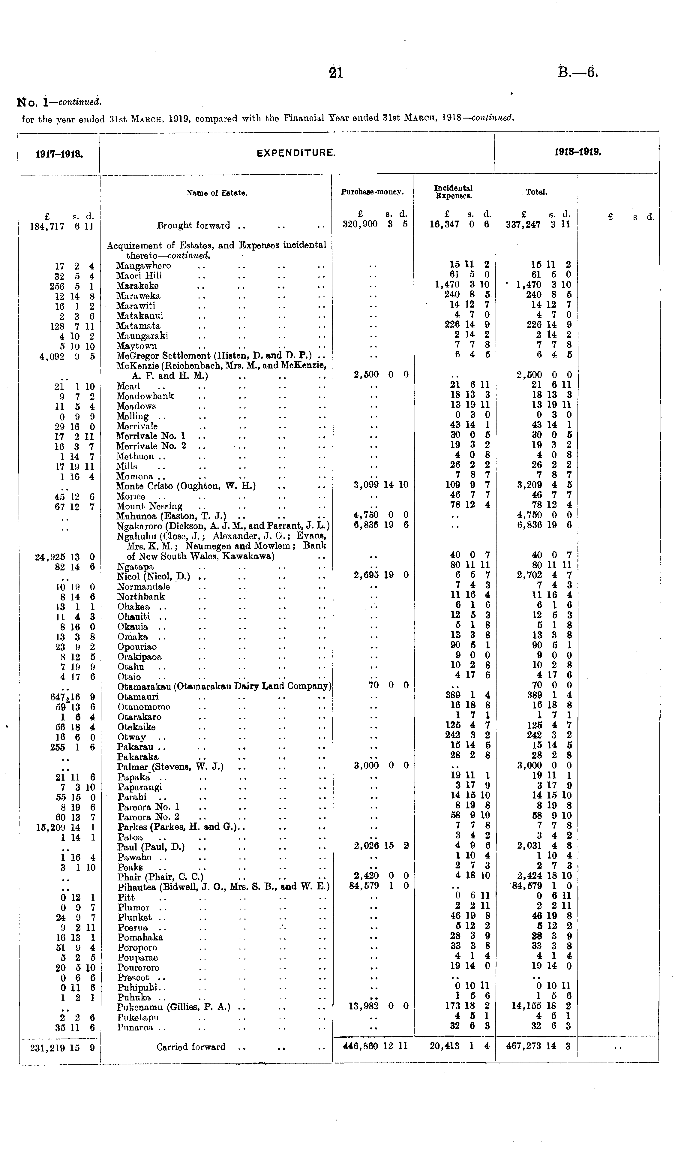 1917-1918. EXPENDITURE. 1918-1919. £ s. d. 184,717 6 11 Name of Estate. Purchase-money. Incidental Expenses. Total. Brought forward £ s. d. 320,900 3 5 £ s. d. 16,347 0 6 £ s. d. 337,247 3 11 £ s 17 2 4 32 5 4 256 5 1 12 14 8 16 1 2 2 3 6 128 7 11 4 10 2 5 10 10 4,092 9 5 21 1 10 9 7 2 11 5 4 0 9 9 29 16 0 17 2 11 16 3 7 1 14 7 17 19 11 1 16 4 45*12 6 67 12 7 24,925 13 0 82 14 6 10 19 0 8 14 6 13 1 1 11 4 3 8 16 0 13 3 8 23 9 2 8 12 5 7 19 9 4 17 6 Acquirement of Estates, and Expenses incidental thereto — continued. Mangawhoro Maori Hill Marakeke Maraweka Marawiti Matakamii Matamata Maungaraki Maytown MoGregor Settlement (Histen, D. and D. P.) .. McKenzie (Reichenbach, Mrs. M., and McKenzie, A. F. and H. M.) Mead Meadowbank Moadows Melling Merrivale Merrivale No. 1 .. .. .. .. Merrivale No. 2 .. Methuen Mills Momona Monte Cristo (Oughton, W. H.) Morioe Mount Nessing Muhunoa (Easton, T. J.) .. Ngakaroro (Diokson, A. J. M., and Parrant, J. L.) Ngahuhu (('lose, J.; Aloxander, J. G.; Evans, Mrs. K. M.; Neumegen and Mowlem; Bank of Now South Wales, Kawakawa) Ngatapa Nicol (Nicol, D.) Normandale Northbank Ohakea Ohauiti Okauia Omaka Opouriao Orakipaoa Otahu Otaio Otamarakau (Otamarakau Dairy Land Company) Otamauri Otanomomo Otarakaro Otekaike Otway Pakarau Pakaraka Palmer (Stevens, W. J.) Papaka Paparangi Parahi Pareora No. 1 Pareora No. 2 Parkes (Parkes, H. and G.).. Patoa Paul (Paul, D.) .. Pawaho Peaks . ■ ■ • . • ■• Phair (Phair, C. C.) Pihautea (Bidwell, J. O., Mrs. S. B., and W. E.) Pitt Plumer Plunket Poerua Pornahaka Poroporo Pouparae Pourerero Prescot Puhipuhi Puhuka Pukenamu (Gillies, P. A.) .. I'uketapu Punaroa 2,500 0 0 3,099 14 10 4,750 0 0 6,836 19 6 2,695 19 0 15 11 2 61 5 0 1,470 3 10 240 8 5 14 12 7 4 7 0 226 14 9 2 14 2 7 7 8 6 4 5 21 6 11 18 13 3 13 19 11 0 3 0 43 14 1 30 0 5 19 3 2 4 0 8 26 2 2 7 8 7 109 9 7 46 7 7 78 12 4 40 0 7 80 11 11 6 5 7 7 4 3 11 16 4 6 16 12 5 3 5 18 13 3 8 90 5 1 9 0 0 10 2 8 4 17 6 15 11 2 61 5 0 • 1,470 3 10 240 8 5 14 12 7 4 7 0 226 14 9 2 14 2 7 7 8 6 4 5 2,500 0 0 21 6 11 18 13 3 13 19 11 0 3 0 43 14 1 30 0 5 19 3 2 4 0 8 26 2 2 7 8 7 3,209 4 5 46 7 7 78 12 4 4,750 0 0 6,836 19 6 40 0 7 80 11 11 2,702 4 7 7 4 3 11 16 4 6 1 6 12 5 3 5 1 8 13 3 8 90 5 1 9 0 0 10 2 8 4 17 6 70 0 0 389 1 4 16 18 8 1 7 1 125 4 7 242 3 2 15 14 5 28 2 8 3,000 0 0 19 11 1 3 17 9 14 15 10 8 19 8 58 9 10 7 7 8 3 4 2 2,031 4 8 1 10 4 2 7 3 2,424 18 10 84,579 1 0 0 6 11 2 2 11 46 19 8 5 12 2 28 3 9 33 3 8 4 1 4 19 14 0 70 0 0 389 1 4 16 18 8 1 7 1 125 4 7 242 3 2 15 14 5 28 2 8 647_16 9 59 13 6 1 6 4 56 18 4 16 6 0 255 1 6 3,000 0 0 19 11 1 3 17 9 14 15 10 8 19 8 58 9 10 7 7 8 3 4 2 4 9 6 1 10 4 2 7 3 4 18 10 21 11 6 7 3 10 55 15 0 8 19 6 60 13 7 15,209 14 1 1 14 1 2,026 15 2 i*16 4 3 1 10 2,420 0 0 84,579 1 0 0 12 1 0 9 7 24 9 7 9 2 11 16 13 1 51 9 4 5 2 5 20 5 10 0 6 6 0 11 6 1 2 1 0 6 11 2 2 11 46 19 8 5 12 2 28 3 9 33 3 8 4 1 4 19 14 0 13,982 0 0 0 10 11 1 5 6 173 18 2 4 5 1 32 6 3 0 10 11 1 5 6 14,155 18 2 4 5 1 32 6 3 2* 2 6 35 11 6 231,219 15 9 Carried forward 446,860 12 11 20,413 1 4 467,273 14 3