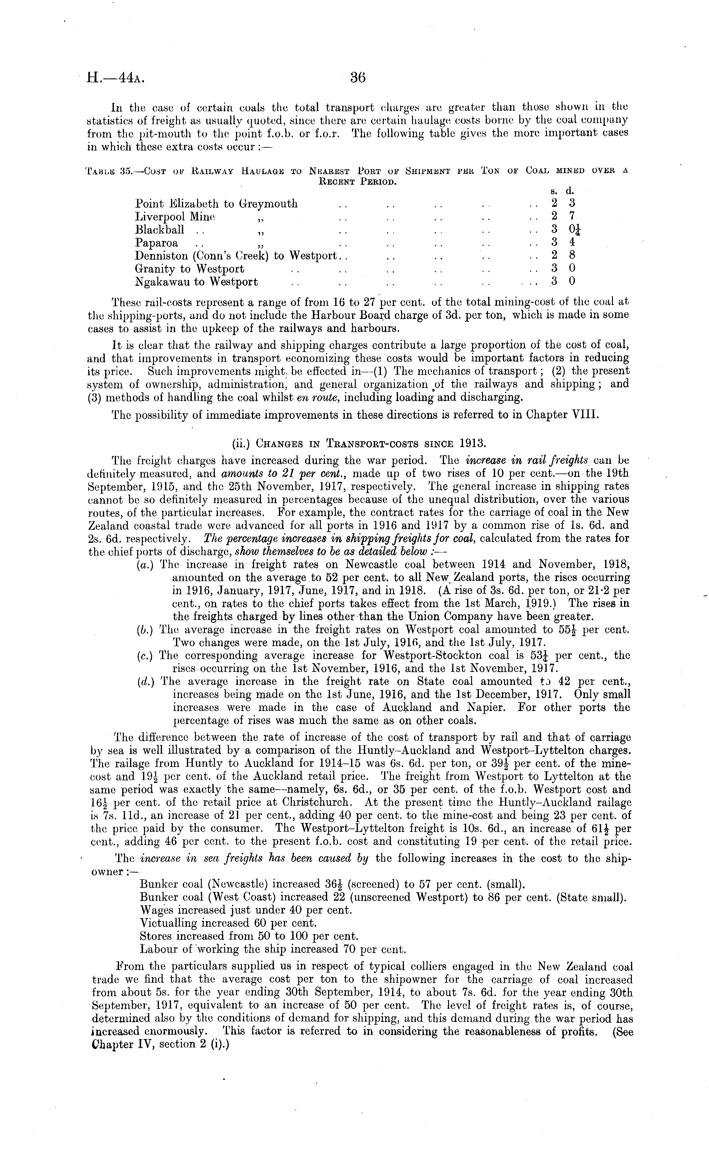 In the case of certain coals the total transport charges are greater than those shown in the statistics of freight as usually quoted, since there are certain haulage costs borne by the coal company from the pit-mouth to the point f.o.b. or f.o.r. The following table gives the more important eases in which these extra costs occur :— Tablb 35.—Cost oj? Railway Haulage to Nuarest Port of Shipment PHB Ton or Coal minkd ovjsk a Recent Period. s. d. Point Elizabeth to (ireymouth . . . . . . . . ..23 Liverpool Mine ~ . . . . . . . . ..27 Blackball . . „ . . .. .. . . .. 3 0£ Paparoa .. „ .. .. .. .. ..34 Denniston (Conn's Creek) to Westport., .. .. .. ..28 Granity to Westport . . . . . . . . . . ..30 Ngakawau to Westport . . . . . . . . . . ... 3 0 These rail-costs represent a range of from 16 to 27 per cent, of the total mining-cost of the coal at the shipping-ports, and do not include the Harbour Board charge of 3d. per ton, which is made in some cases to assist in the upkeep of the railways and harbours. It is clear that the railway and shipping charges contribute a largo proportion of the cost of coal, and that improvements iti transport economizing these costs would be important factors in reducing its price. Such improvements might, be effected in— (1) The mechanics of transport; (2) the present system of ownership, administration, and general organization a of the railways and shipping ; and (3) methods of handling the coal whilst en route, including loading and discharging. The possibility of immediate improvements in these directions is referred to in Chapter VIII. (ii.) Changes in Transport-costs since 1913. The freight charges have increased during the war period. The increase in rail freights can be definitely measured, and amounts to 21 per cent., made up of two rises of 10 per cent. —on the 19th September, 1915, and the 25th November, 1917, respectively. The general increase in shipping rates cannot be so definitely measured in percentages because of the unequal distribution, over the various routes, of the particular increases. For example, the contract rates for the carriage of coal in the New Zealand coastal trade were advanced for all ports in 1916 and 1917 by a common rise of Is. 6d. and 2s. 6d. respectively. The percentage increases in shipping freights for coal, calculated from the rates for the chief ports of discharge, show themselves to be as detailed below : — (a.) The increase! in freight rates on Newcastle coal between 1914 and November, 1918, amounted on the average to 52 per cent, to all New Zealand ports, the rises occurring in 1916, January, 1917, June, 1917, and in 1918. (A rise of 3s. 6d. per ton, or 21-2 per cent., on rates to the chief ports takes effect from the Ist March, 1919.) The rises in the freights charged by lines other than the Union Company have been greater. (/;.) The average increase in the freight rates on Westport coal amounted to 55J per cent. Two changes were made, on the Ist July, 1916, and the Ist July, 1917. (c.) The corres2>onding average increase for Westport-Stockton coal is 53j per cent., the rises occurring on the Ist November, 1916, and the Ist November, 1917. (d.) The average increase in the freight rate on State coal amounted tJ 42 per cent., increases being made on the Ist June, 1916, and the Ist December, 1917. Only small increases were made in the case of Auckland and Napier. For other ports the percentage of rises was much the same as on other coals. The difference between the rate of increase of the cost of transport by rail and that of carriage by sea is well illustrated by a comparison of the Huntly-Auckland and Westport-Lyttelton charges. The railage from Huntly to Auckland for 1914-15 was 6s. 6d. per ton, or 39| per cent, of the minecost and 19-3, per cent, of the Auckland retail price. The freight from Westport to Lyttelton at the same period was exactly the same —namely, 6s. 6d., or 35 per cent, of the f.o.b. Westport cost and 16 J- per cent, of the retail price at Christchurch. At the present time the Huntly-Auckland railage is 7s. lid., an increase of 21 per cent., adding 40 per cent, to the mine-cost and being 23 per cent, of the price paid by the consumer. The Westport-Lyttelton freight is 10s. 6d., an increase of per cent., adding 46 per cent, to the present f.o.b. cost and constituting 19 per cent, of the retail price. The increase in sea freights has been caused by the following increases in the cost to the shipowner : — Bunker coal (Newcastle) increased 36| (screened) to 57 per cent, (small). Bunker coal (West Coast) increased 22 (unscreened Westport) to 86 per cent. (State small). Wages increased just under 40 per cent. Victualling increased 60 per cent. Stores increased from 50 to 100 per cent. Labour of working the ship increased 70 per cent. From the particulars supplied us in respect of typical colliers engaged in the New Zealand coal trade we find that the average cost per ton to the shipowner for the carriage of coal increased from about ss. for the year ending 30th September, 1914, to about 7s. 6d. for the year ending 30th September, 1917, equivalent to an increase of 50 per cent. The level of freight rates is, of course, determined also by the conditions of demand for shipping, and this demand during the war period has increased enormously. This factor is referred to in considering the reasonableness of profits. (See Chapter IV, section 2 (i).)