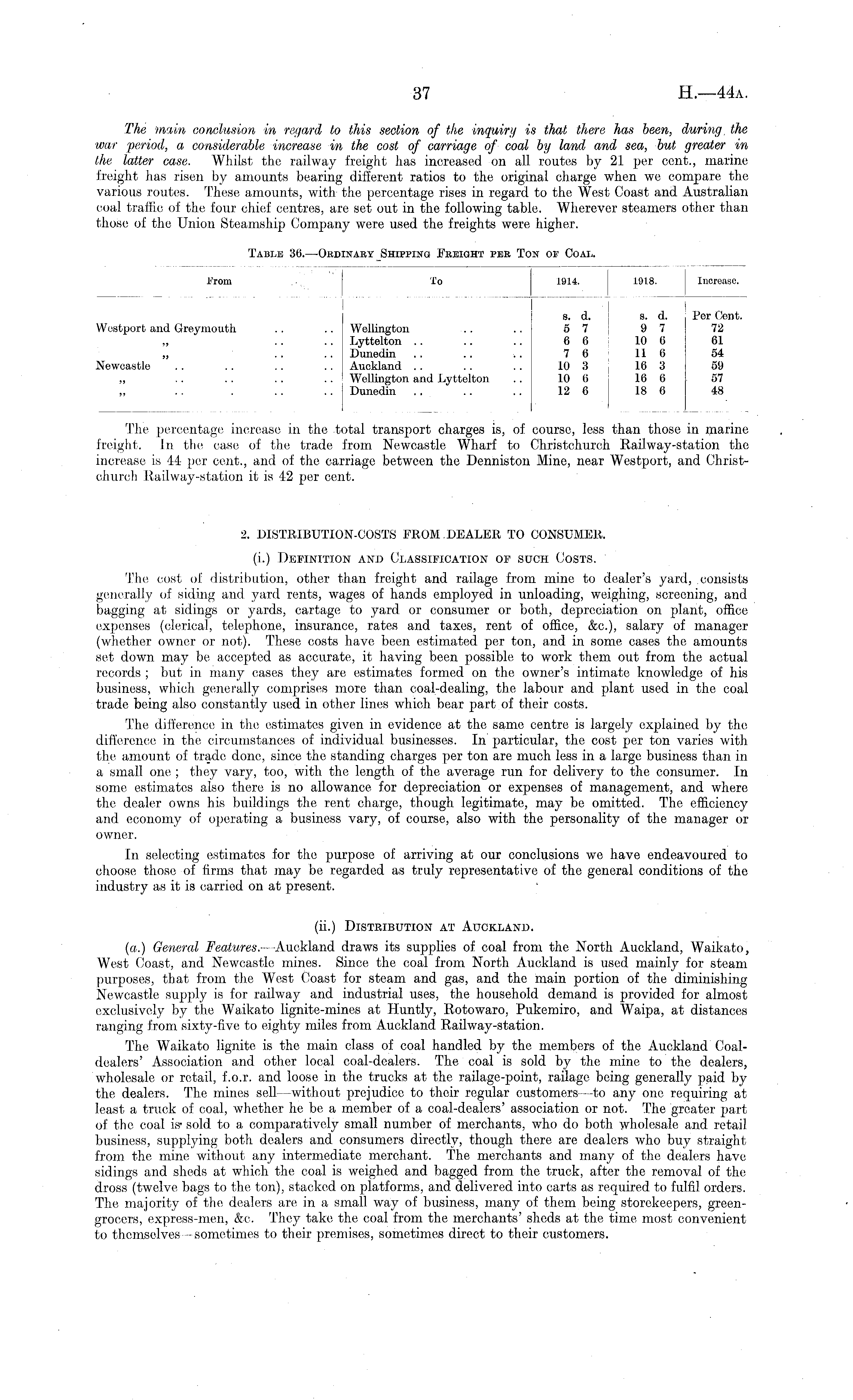 The percentage increase in the total transport charges is, of course, less than those in marine freight. In the case of the trade from Newcastle Wharf to Christchurch Railway-station the increase is 44 per cent., and of the carriage between the Denniston Mine, near Westport, and Christchurch Railway-station it is 42 per cent. 2. DISTRIBUTION-COSTS FROM.DEALER TO CONSUMER, (i.) Definition and Classification of such Costs. The cost of distribution, other than freight and railage from mine to dealer's yard, consists generally of siding and yard rents, wages of hands employed in unloading, weighing, screening, and bagging at sidings or yards, cartage to yard or consumer or both, depreciation on plant, office expenses (clerical, telephone, insurance, rates and taxes, rent of office, &c), salary of manager (whether owner or not). These costs have been estimated per ton, and in some cases the amounts set down may be accepted as accurate, it having been possible to work them out from the actual records ; but in many cases they are estimates formed on the owner's intimate knowledge of his business, which, generally comprises more than coal-dealing, the labour and plant used in the coal trade being also constantly used in other lines which bear part of their costs. The difference in the estimates given in evidence at the same centre is largely explained by the difference in the circumstances of individual businesses. In particular, the cost per ton varies with the amount of trade done, since the standing charges per ton are much less in a large business than in a small one ; they vary, too, with the length of the average run for delivery to the consumer. In some estimates also there is no allowance for depreciation or expenses of management, and where the dealer owns his buildings the rent charge, though legitimate, may be omitted. The efficiency and economy of operating a business vary, of course, also with the personality of the manager or owner. In selecting estimates for the purpose of arriving at our conclusions wo have endeavoured to choose those of firms that may be regarded as truly representative of the general conditions of the industry as it is carried on at present. (ii.) Distribution at Auckland. (a.) General Features, —Auckland draws its supplies of coal from the North Auckland, Waikato, West Coast, and Newcastle mines. Since the coal from North Auckland is used mainly for steam purposes, that from the West Coast for steam and gas, and the main portion of the diminishing Newcastle supply is for railway and industrial uses, the household demand is provided for almost exclusively by the Waikato lignite-mines at Huntly, Rotowaro, Pukemiro, and Waipa, at distances ranging from sixty-five to eighty miles from Auckland Railway-station. The Waikato lignite is the main class of coal handled by the members of the Auckland Coaldealers' Association and other local coal-dealers. The coal is sold by the mine to the dealers, wholesale or retail, f.o.r. and loose in the trucks at the railage-point, railage being generally paid by the dealers. The mines sell—without prejudice to their regular customers -to any one requiring at least a truck of coal, whether he be a member of a coal-dealers' association or not. The greater part of the coal is , sold to a comparatively small number of merchants, who do both wholesale and retail business, supplying both dealers and consumers directly, though there are dealers who buy straight from the mine without any intermediate merchant. The merchants and many of the dealers have sidings and sheds at which the coal is weighed and bagged from the truck, after the removal of the dross (twelve bags to the ton), stacked on platforms, and delivered into carts as required to fulfil orders. The majority of the dealers are in a small way of business, many of them being storekeepers, greengrocers, express-men, &c. They take the coal from the merchants' sheds at the time most convenient to themselves —sometimes to their premises, sometimes direct to their customers.