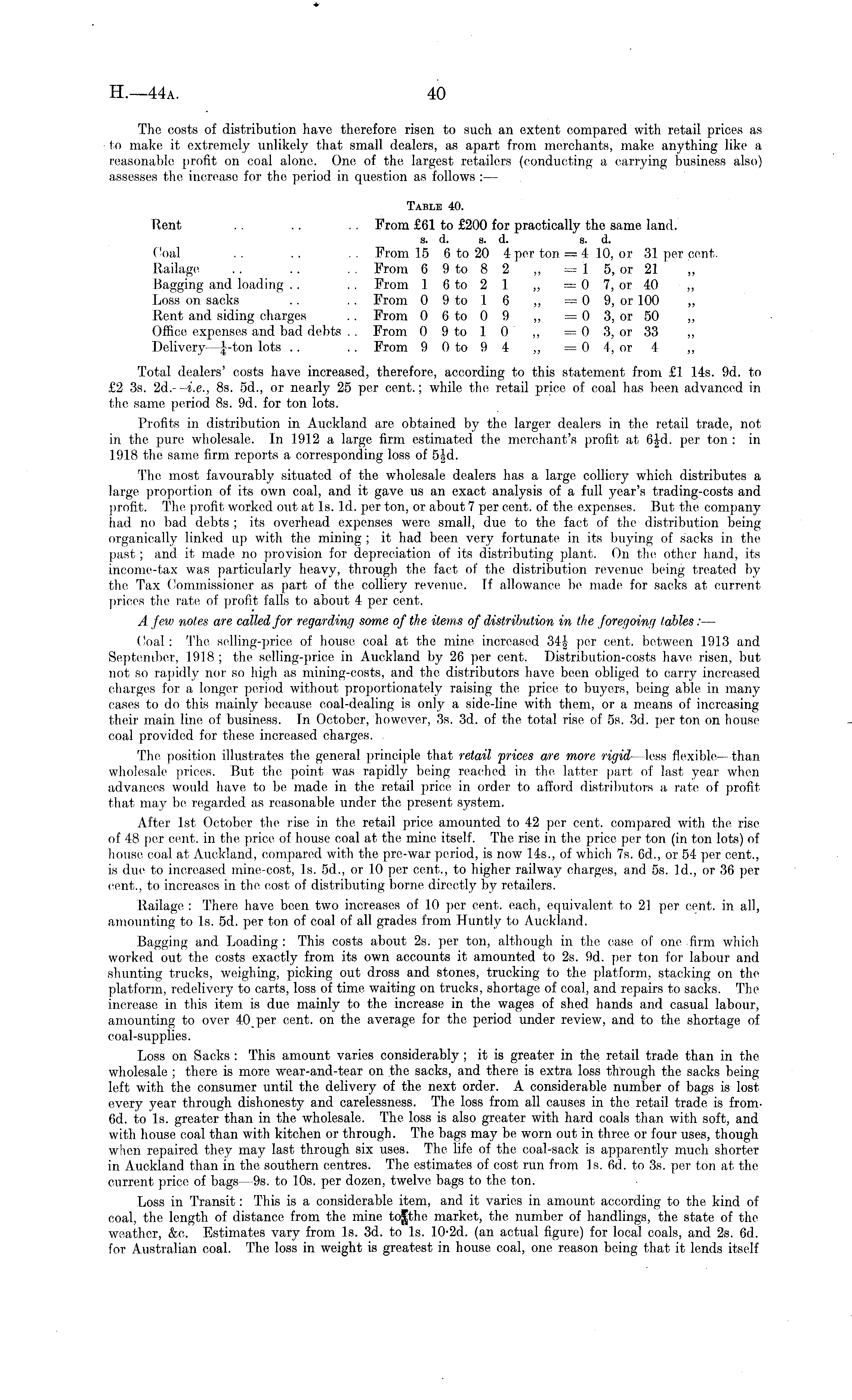 The costs of distribution have therefore risen to such an extent compared with retail prices as to make it extremely unlikely that small dealers, as apart from merchants, make anything like a reasonable profit on coal alone. One of the largest retailers (conducting a carrying business also) assesses the increase for the period in question as follows : — Table 40. Rent .. .. . . From £61 to £200 for practically the same land. c. d. s. d. s. d. Coal .. .. .. From 15 6to 20 4 per ton = 4 10, or 31 per cent. Railage .. .. . . From 6 9to 8 2 „ = 1 5, or 21 ~ Bagging and loading .. . . From 1 6to 2 1 „ = 0 7, or 40 ~ Loss on sacks .. . . From 0 9to 1 6 „ =0 9, or 100 Rent and siding charges .. From 0 6to 0 9 „ = 0 3, or 50 ~ Office expenses and bad debts . . From 0 9to 1 0 „ = 0 3, or 33 Delivery —J-ton lots .. . . From 9 oto 9 4 „ =0 4, or 4 Total dealers' costs have increased, therefore, according to this statement from £1 14s. 9d. to £2 3s. 2d. — i.e., Bs. 5d., or nearly 25 per cent.; while the retail price of coal has been advanced in the same period Bs. 9d. for ton lots. Profits in distribution in Auckland are obtained by the larger dealers in the retail trade, not in the pure wholesale. In 1912 a large firm estimated the merchant's profit at 6Jd. per ton : in 1918 the same firm reports a corresponding loss of s|d. The most favourably situated of the wholesale dealers has a large colliery which distributes a large proportion of its own coal, and it gave us an exact analysis of a full year's trading-costs and profit. The profit worked out at Is. Id. per ton, or about 7 per cent, of the expenses. But the company had no bad debts ; its overhead expenses were small, due to the fact of the distribution being organically linked up with the mining ; it had been very fortunate in its buying of sacks in the past ; and it made no provision for depreciation of its distributing plant, On the other hand, its income-tax was particularly heavy, through the fact of the distribution revenue being treated by the Tax Commissioner as part of the colliery revenue. If allowance be made for sacks at current prices the rate of profit falls to about 4 per cent. A few notes are called for regarding some of the items of distribution in the foregoing tables: — Coal: The selling-price of house coal at the mine increased 34£ per cent, between 1913 and September, 1918 ; the selling-price in Auckland by 26 per cent. Distribution-costs have risen, but not so rapidly nor so high as mining-costs, and the distributors have been obliged to carry increased charges for a longer period without proportionately raising the price to buyers, being able in many cases to do this mainly because coal-dealing is only a side-line with them, or a means of increasing their main line of business. Tn October, however, 3s. 3d. of the total rise of ss. 3d. per ton on house coal provided for these increased charges. The position illustrates the general principle that retail -prices are more rigid- less flexible—than wholesale prices. But the point was rapidly being reached in the latter part of last year when advances would have to be made in the retail price in order to afford distributors a rate of profit that may be regarded as reasonable under the present system. After Ist October the rise in the retail price amounted to 42 per cent, compared with the rise of 48 per cent, in the price of house coal at the mine itself. The rise in the price per ton (in ton lots) of house coal at Auckland, compared with the [ire-war period, is now 145., of which 7s. 6d., or 54 per cent., is due to increased mine-cost, Is. 5d., or 10 per cent., to higher railway charges, and ss. Id., or 36 per cent., to increases in the cost of distributing borne directly by retailers. Railage : There have been two increases of 10 per cent, each, equivalent to 21 per cent, in all, amounting to Is. sd. per ton of coal of all grades from Huntly to Auckland. Bagging and Loading : This costs about 2s. per ton, although in the case of one firm which worked out the costs exactly from its own accounts it amounted to 2s. 9d. per ton for labour and shunting trucks, weighing, picking out dross and stones, trucking to the platform, stacking on the platform, redelivery to carts, loss of time waiting on trucks, shortage of coal, and repairs to sacks. The increase in this item is due mainly to the increase in the wages of shed hands and casual labour, amounting to over 40 per cent, on the average for the period under review, and to the shortage of coal-supplies. Loss on Sacks : This amount varies considerably ; it is greater in the retail trade than in the wholesale ; there is more wear-and-tear on the sacks, and there is extra loss through the sacks being left with the consumer until the delivery of the next order. A considerable number of bags is lost every year through dishonesty and carelessness. The loss from all causes in the retail trade is from6d. to Is. greater than in the wholesale. The loss is also greater with hard coals than with soft, and with house coal than with kitchen or through. The bags may be worn out in three or four uses, though when repaired they may last through six uses. The life of the coal-sack is apparently much shorter in Auckland than in the southern centres. The estimates of cost run from Is. 6d. to 3s. per ton at the current price of bags —9s. to 10s. per dozen, twelve bags to the ton. Loss in Transit: This is a considerable item, and it varies in amount according to the kind of coal, the length of distance from the mine tojjjthe market, the number of handlings, the state of the weather, &c. Estimates vary from Is. 3d. to Is. 10-2 d. (an actual figure) for local coals, and 2s. 6d. for Australian coal. The loss in weight is greatest in house coal, one reason being that it lends itself