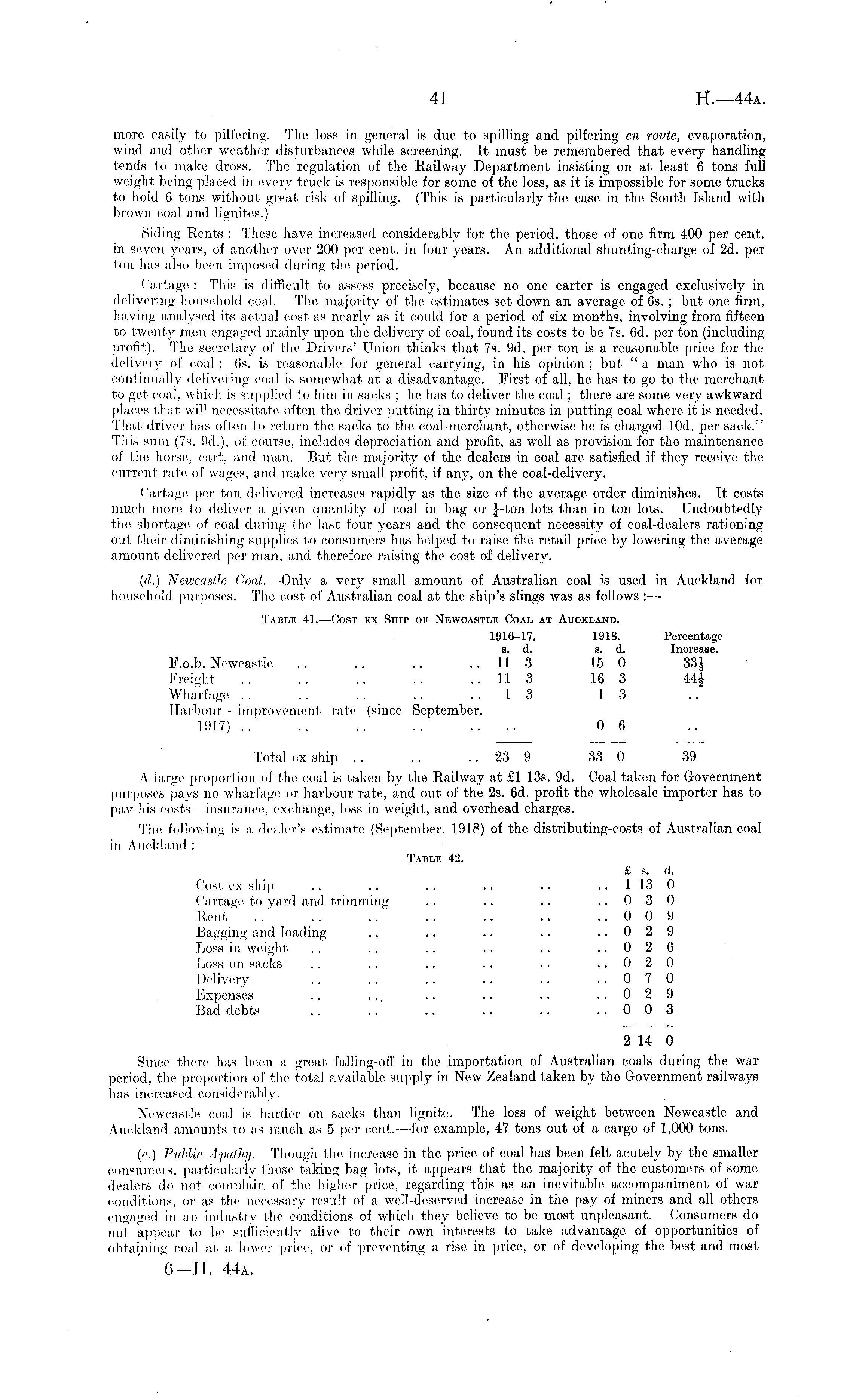 more easily to pilfering. The loss in general is due to spilling and pilfering en route, evaporation, wind and other weather disturbances while screening. It must be remembered that every handling tends to make dross. The regulation of the Railway Department insisting on at least 6 tons full weight being placed in every truck is responsible for some of the loss, as it is impossible for some trucks to hold 6 tons without great risk of spilling. (This is particularly the case in the South. Island with brown coal and lignites.) Siding Rents : These have increased considerably for the period, those of one firm 400 per cent, in seven years, of another over 200 per cent, in four years. An additional shunting-charge of 2d. per ton has also been imposed during the period. Cartage : This is difficult to assess precisely, because no one carter is engaged exclusively in delivering household coal. The majority of the estimates set down an average of 6s. ; but one firm, having analysed its actual cost as nearly as it could for a period of six months, involving from fifteen to twenty men engaged mainly upon the delivery of coal, found its costs to be 7s. 6d. per ton (including profit). The secretary of the Drivers' Union thinks that 7s. 9d. per ton is a reasonable price for the delivery of coal; 6s. is reasonable for general carrying, in his opinion ; but " a man who is not continually delivering coal is somewhat at a disadvantage. First of all, he has to go to the merchant to get coal, which is supplied to him in sacks ;he has to deliver the coal; there are some very awkward places that will necessitate often the driver putting in thirty minutes in putting coal where it is needed. That driver has often to return the sacks to the coal-merchant, otherwise he is charged lOd. per sack." This sum (7s. 9d.), of course, includes depreciation and profit, as well as provision for the maintenance of the horse, cart, and man. But the majority of the dealers in coal are satisfied if they receive the current rate of wages, and make, very small profit, if any, on the coal-delivery. Cartage per ton delivered increases rapidly as the size of the average order diminishes. It costs much more to deliver a given quantity of coal in bag or £-ton lots than in ton lots. Undoubtedly the shortage of coal during the last four years and the consequent necessity of coal-dealers rationing out their diminishing supplies to consumers has helped to raise the retail price by lowering the average amount delivered per man, and therefore raising the cost of delivery. (d.) Newcastle Coal.- -Only a very small amount of Australian coal is used in Auckland for household purposes. The cost of Australian coal at the ship's slings was as follows : — Table 41.—Cost ex Ship ov Newcastle Coal at Auckland. 1916-17. 1918. Percentage a. d. s. d. Increase. F.o.b. Newcastle .. .. .. ..113 15 0 33J Freight .. .. .. .. .. 11 3 16 3 44f Wharfage .. .. .. .. ..13 13 Harbour - improvement rate (since September, 1917) .. .. .. .. .... 0 6 Total ex ship .. .. .. 23 9 33 0 39 A. large proportion of the coal is taken by the Railway at £1 13s. 9d. Coal taken for Government purposes pays no wharfage or harbour rate, and out of the 2s. 6d. profit the wholesale importer has to pay his oosts— insurance, exchange, loss in weight, and overhead charges. Tin- following is a dealer's estimate (September, 1918) of the distributing-costs of Australian coal in Auckland : Table 42. £ s. d. Cost ex ship .. .. .. .. .. .. 1 13 0 Cartage to yard and trimming .. .. .. ..030 Rent ..' .. .. .. .. .. ..009 Bagging and loading .. .. .. .. ..029 Loss in weight .. .. .. .. .. ..026 Loss on sacks .. .. .. .. .. ..020 Delivery .. .. .. .. .. ..070 Expenses .. .. .. .. .. ..029 Bad debts 003 2 14 0 Since there has been a great falling-ofi in the importation of Australian coals during the war period, the proportion of the total available supply in New Zealand taken by the Government railways has increased considerably. Newcastle coal is harder on sacks than lignite. The loss of weight between Newcastle and Auckland amounts to as much as 5 per cent. —for example, 47 tons out of a cargo of 1,000 tons. (c.) Public Apathy. Though the increase in the price of coal has been felt acutely by the smaller consumers, particularly those taking bag lots, it appears that the majority of the customers of some dealers do not complain of the higher price, regarding this as an inevitable accompaniment of war conditions, or as the necessary result of a, well-deserved increase in the pay of miners and all others engaged in an industry the conditions of which they believe to be most unpleasant. Consumers do not appear to be sufficiently alive to their own interests to take advantage of opportunities of obtaining coal at a lower price, or of preventing a rise in price, or of developing the best and most