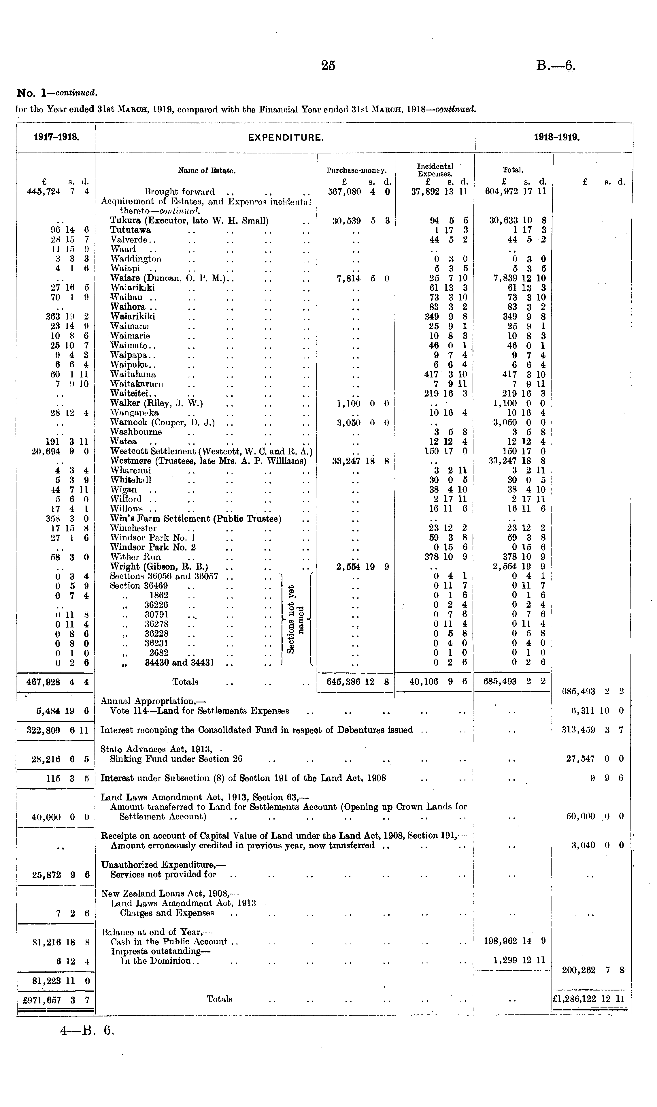 1917-1918. EXPENDITURE. 1911 1-1919. £ s. d. 445,724 7 4 I I Name of Estate Purchase-money. Expenses. e a A C a A £ s. d. £ s. d. Brought forward .. .. .. 567,080 4 0 37,892 13 11 Acquirement of Estates, and Expenses incidental thereto — continued. Tukura (Executor, late W. H. Small) .. 30,539 5 3 94 5 5 Tututawa .. .. .. .. .. 1 17 3 Valverde.. .. .. .. .. .. 44 5 2 Waari Waddington .. .. .. .. 0 3 0 Waiapi .. .. .. .. .. .. 535 Waiare (Duncan, O. P. M.).. .. .. 7,814 5 0 25 7 10 Waiarikiki .. .. .. .. .. 61 13 3 Waihau .. .. .. .. . . .. 73 3 10 Waihora .. .. .. .. .. .. 83 3 2 Waiarikiki .. .. .. .. 349 9 8 Waimana .. .. .. . . .. 25 9 1 Waimarie .. . . .. . . .. 10 8 3 Waimate.. .. .. .. .. .. 46 0 1 Waipapa.. .. .. .. .. .. 974 Waipuka.. .. .. .. .. 664 Waitahuna .. .. . . .. 417 3 10 Waitakaruru .. .. .. . . .. 7 9 11 Waiteitei.. .. .. .. .. .. 219 16 3 Walker (Riley, J. W.) .. .. .. 1,100 0 0 .. Wangapeka .. .. . . . . .. 10 16 4 Warnock (Coupor, I). J.) .. .. .. 3,050 0 0 Washbourne .. .. .. .. .. 358 Watea .. .. .. .. .. .. 12 12 4 Westcott Settlement (Westcott, W. C. and R. A.) .. 1.50 17 0 Westmere (Trustees, late Mrs. A. P. Williams) 33,247 18 8 Wharenui .. .. .. .. .. 3 2 11 Whitehall .. .. .. .. .. 30 0 5 Wigan . . .. . . .. . . .. 38 4 10 Wilford .. .. .. .. .. .. 2 17 11 Willows .. .. .. .. .. .. 16 11 0 Win's Farm Settlement (Public Trustee) Winchester .. .. .. . . .. 23 12 2 Windsor Park No. I .. .. . . .. 59 3 8 Windsor Park No. 2 .. .. .. .. 0 15 6 Wither Run .. .. .. .. .. 378 10 9 Wright (Gibson, R. B.) .. .. .. 2,554 19 9 Sections 36056 and 36057 .. . . ) f .. 0 4 1 Section 36469 .. .. . . « .. 0 11 7 1862 .. .. ..& .. 016 36226 .. .. ..-§_, .. 024 30791 .. .. .. , a _ J .. 0 7 6 36278 .. .. .. *"§ 1 | .. 0 114 36228 .. .. .. .2 a .. 0 5 8 36231 .. .. .. £ .. 040 2682 .. .. .. » .. 0 10 34430 and 34431 .. ..J I .. 0 2 6 Purchase-money. £ s. d. 567,080 4 0 Incidental Expenses. £ s. d. 37,892 13 11 Total. V o A £ s. d. 604,972 17 11 30,633 10 8 1 17 3 44 5 2 0 3 0 5 3 5 7,839 12 10 61 13 3 73 3 10 83 3 2 349 9 8 25 9 1 10 8 3 46 0 1 9 7 4 6 6 4 417 3 10 7 9 11 219 16 3 1,100 0 0 10 16 4 3,050 0 0 3 5 8 12 12 4 150 17 0 33,247 18 8 3 2 11 30 0 5 38 4 10 2 17 11 16 11 0 23 12 2 59 3 8 0 15 6 378 10 9 2,554 19 9 0 4 1 0 11 7 0 1 6 0 2 4 0 7 6 0 11 4 0 5 8 0 4 0 0 1 0 0 2 6 Total. £ s. d. 604,972 17 11 £ s. d. 96 14 6 28 15 7 11 15 9 3 3 3 4 1 6 30,539 5 3 94 5 5 1 17 3 44 5 2 30,633 10 8 1 17 3 44 5 2 27*16 5 70 1 9 363 19 2 23 14 9 10 8 6 25 10 7 9 4 3 6 6 4 60 I 11 7 9 10 7,814 5 0 0 3 0 5 3 5 25 7 10 61 13 3 73 3 10 83 3 2 349 9 8 25 9 1 10 8 3 46 0 1 9 7 4 6 6 4 417 3 10 7 9 11 219 16 3 0 3 0 5 3 5 7,839 12 10 61 13 3 73 3 10 83 3 2 349 9 8 25 9 1 10 8 3 46 0 1 9 7 4 6 6 4 417 3 10 7 9 11 219 16 3 1,100 0 0 10 16 4 3,050 0 0 3 5 8 12 12 4 150 17 0 33,247 18 8 3 2 11 30 0 5 38 4 10 2 17 11 16 11 0 28 12 4 1,100 0 0 3,050 0 0 10 16 4 19i 3 11 20,694 9 0 3 5 8 12 12 4 150 17 0 33,247 18 8 3 2 11 30 0 5 38 4 10 2 17 11 16 11 0 4 3 4 5 3 9 44 7 11 5 6 0 17 4 I 358 3 0 17 15 8 27 1 6 23 12 2 59 3 8 0 15 6 378 10 9 23 12 2 59 3 8 0 15 6 378 10 9 2,554 19 9 0 4 1 0 11 7 0 1 6 0 2 4 0 7 6 0 11 4 0 5 8 0 4 0 0 1 0 0 2 6 58 3 0 2,554 19 9 0 3 4 0 5 9 0 7 4 0 4 1 0 11 7 0 1 6 0 2 4 0 7 6 0 11 4 0 5 8 0 4 0 0 1 0 0 2 6 0 II 8 0 11 4 0 8 6 0 8 0 0 1 0 0 2 6 r a o> ' 2 I a c« .2 w Hr> O 467,928 4 4 Totals .. .. .. 645,386 12 8 40,106 9 6 t 645,386 12 8 40,106 9 6 685,493 2 2 685,493 2 2 Annual Appropriation,— Vote 114—Land for Settlements Expenses 685,493 2 2 5,484 19 6 6,311 10 0 322,809 6 11 Interest recouping the Consolidated Fund in respect of Debentures issued . . 313,459 3 7 State Advances Act, 1913, — Sinking Fund under Section 26 27,547 0 0 28,216 6 5 115 3 5 Interest under Subsoction (8) of Section 191 of the Land Act, 1908 9 9 0 Land Laws Amendmont Aot, 1913, Section 63, — Amount transferred to Land for Settlements Acoount (Opening up Crown Lands for Settlement Acoount) .. .. .. .. .. .. 50,000 0 0 40,000 0 0 Reoeipts on account of Capital Value of Land under tho Land Act, 1908, Section 191, — Amount erroneously credited in previous year, now transferred 3,040 0 0 25,872 8 6 Unauthorized Expenditure,— Services not provided for Now Zealand Loans Act, 1908,- — Land Laws Amendment Act, 1913 - Charges and Expenses .. .. ,. .. .. . . 7 2 6 81,216 18 S Balance at end of Year,- - Cash in the Public Account .. .. . . .. . . .. . . j '. Imprests outstanding— 1 n tho Dominion. . .. .. .. .. . . 198,962 14 9 1,299 12 11 200,262 7 8 6 12 4 81,223 11 0 Totals £1,286,122 12 11 £971,657 3 7