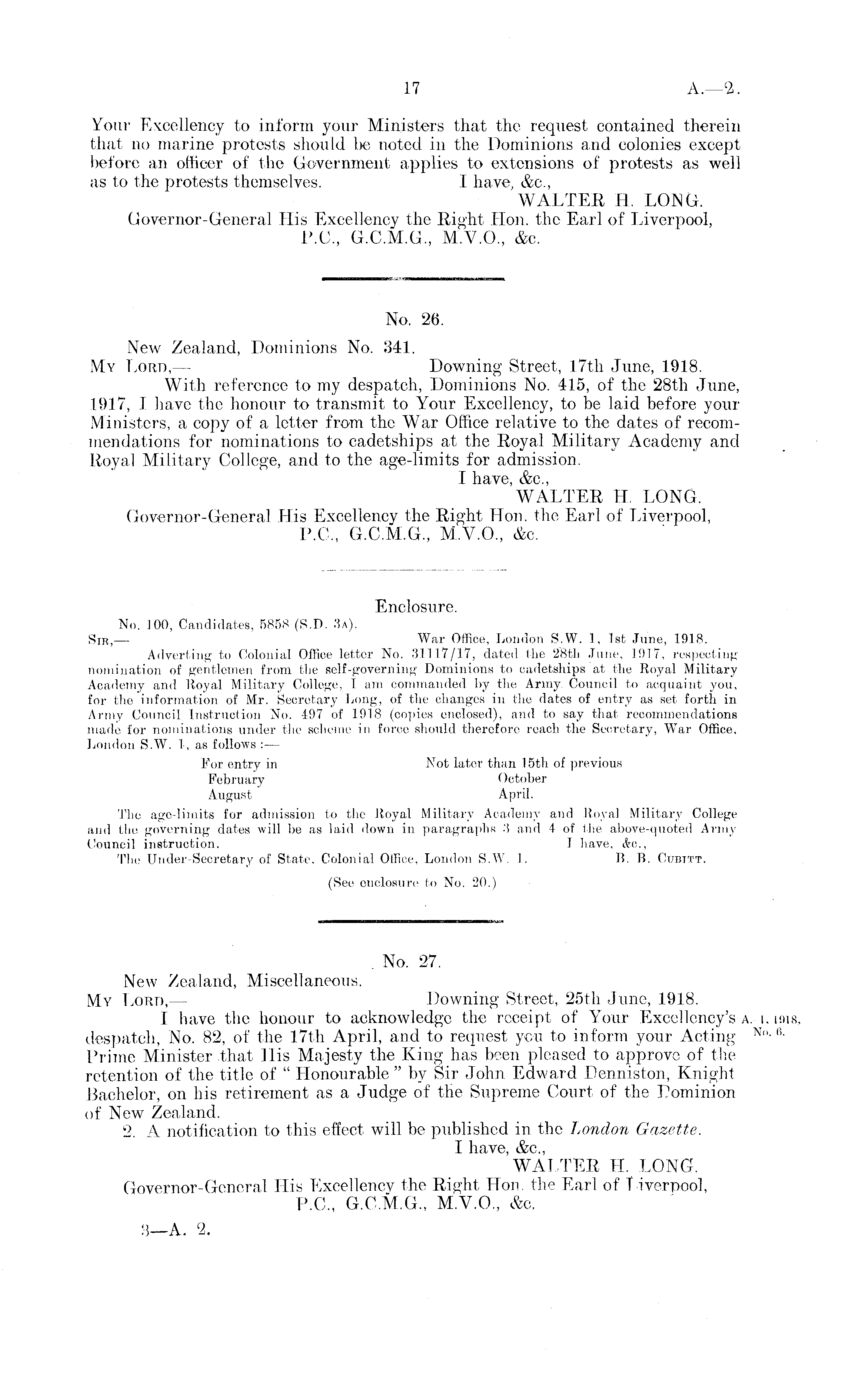 No. 26. New Zealand, Dominions No. 341. My Lord, — Downing Street, 17th June, 1918. With reference to my despatch, Dominions No. 415, of the 28th June, 1917, I have the honour to transmit to Your Excellency, to be laid before your Ministers, a copy of a letter from the War Office relative to the dates of recommendations for nominations to cadetships at the Royal Military Academy and Royal Military College, and to the age-limits for admission. I have, &c., WALTER H. LONG. Governor-General His Excellency the Right Hon. the Earl of Liverpool, P.C., G.C.M.G., M.V.0., &c.