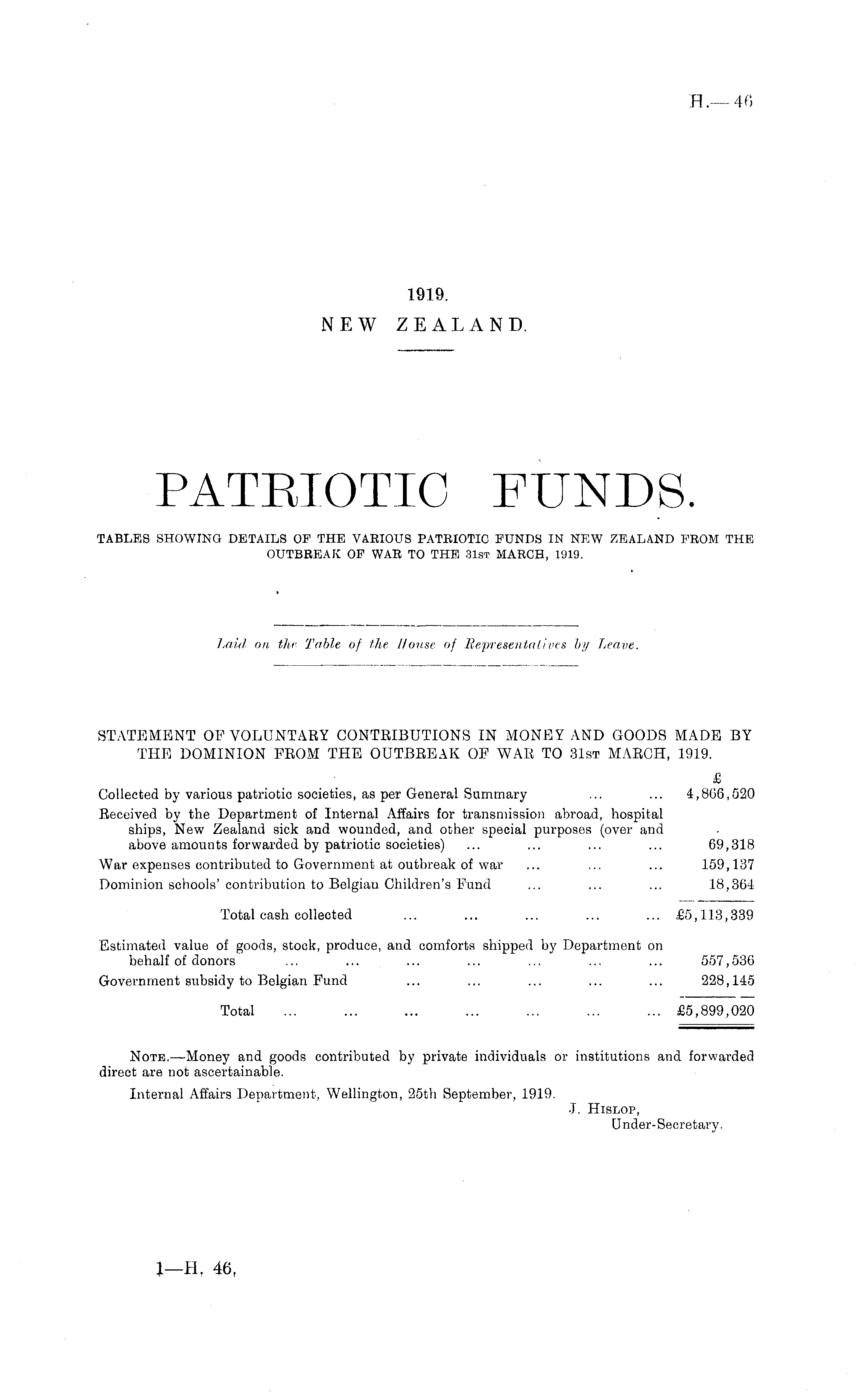 PATRIOTIC FUNDS. TABLES SHOWING DETAILS OF THE VARIOUS PATRIOTIC FUNDS IN NEW ZEALAND FROM THE OUTBREAK OF WAR TO THE 31st MARCH, 1919.